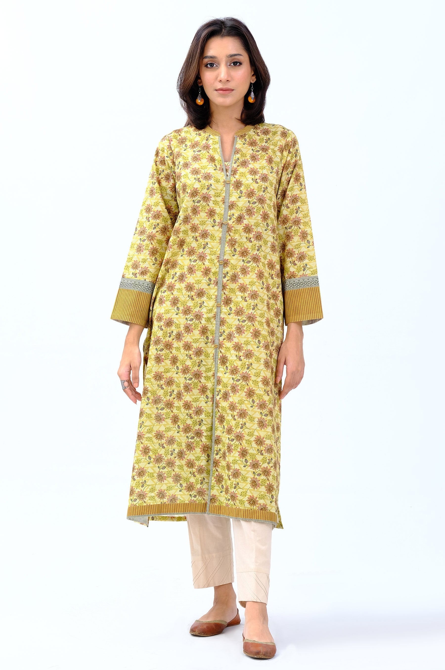 This yellow chintz Printed Kurta comes with gathered sleeves, contrasting print cuff and hand embellished neckline.