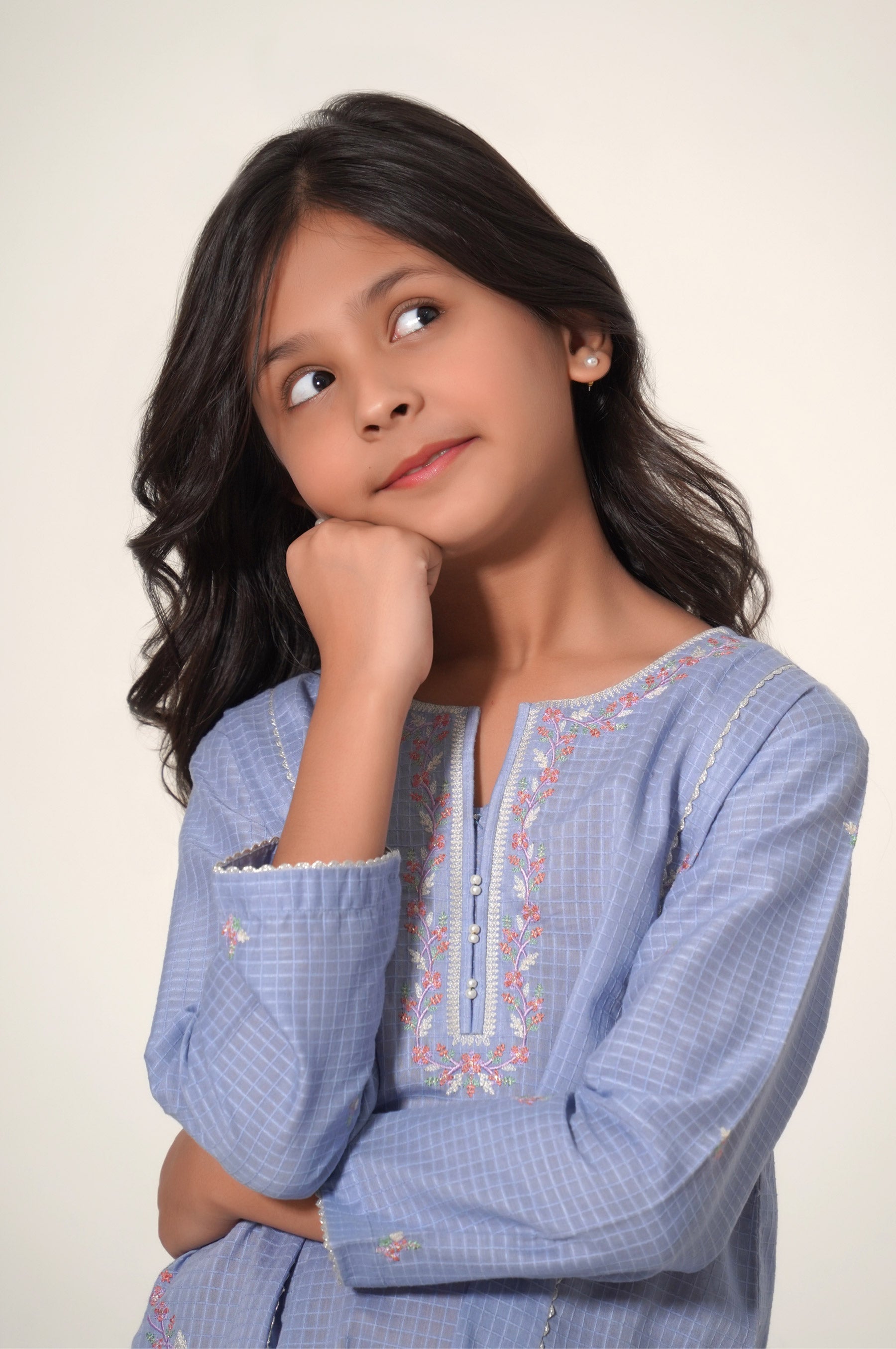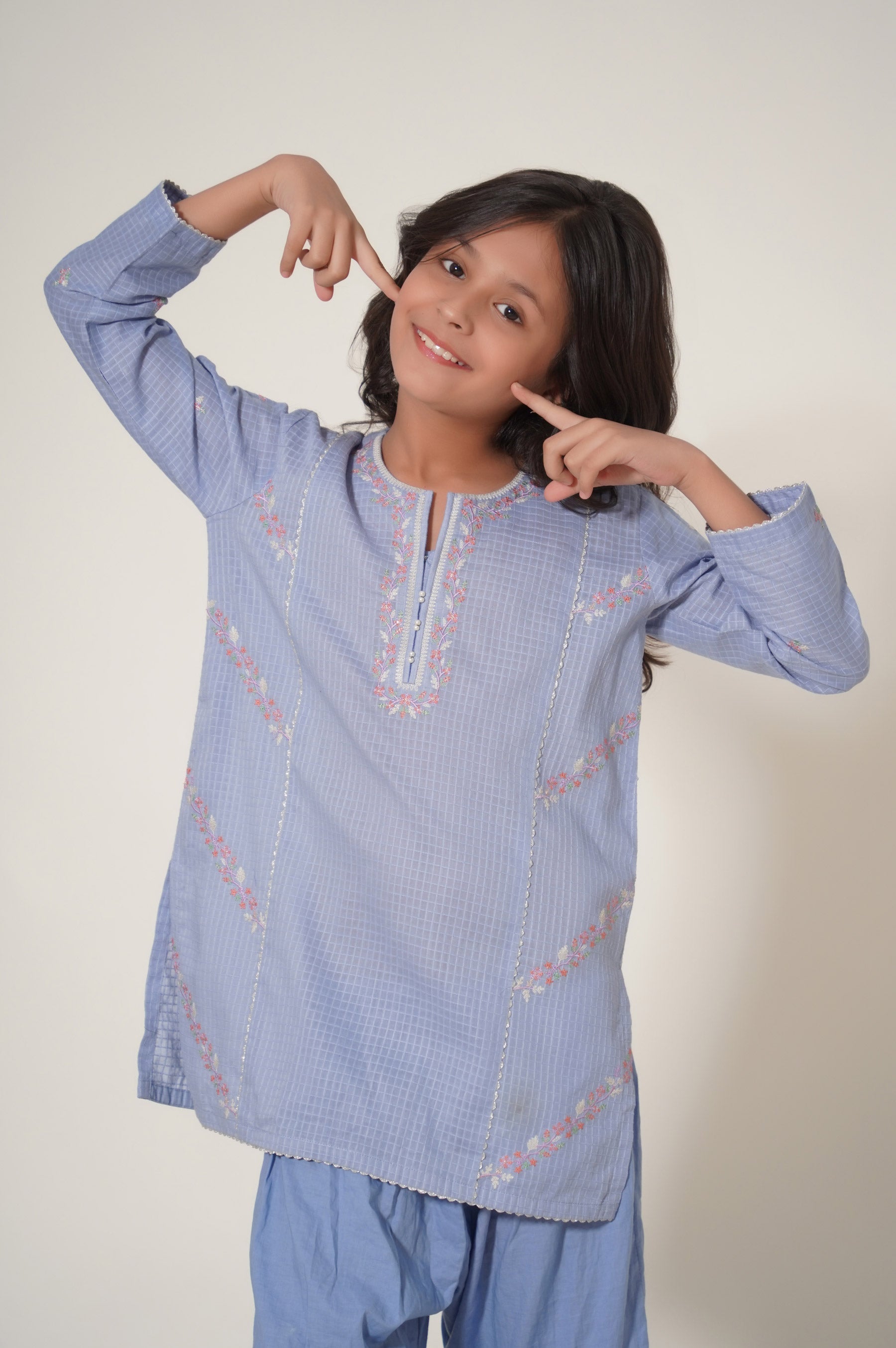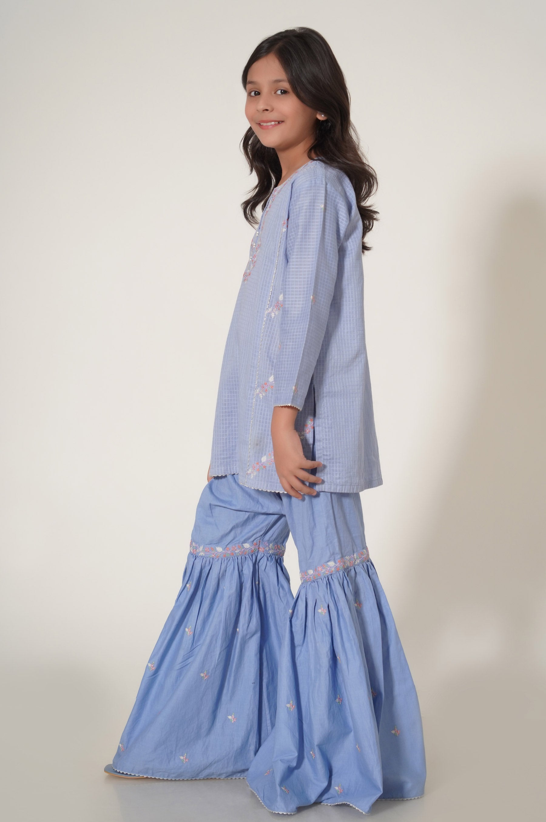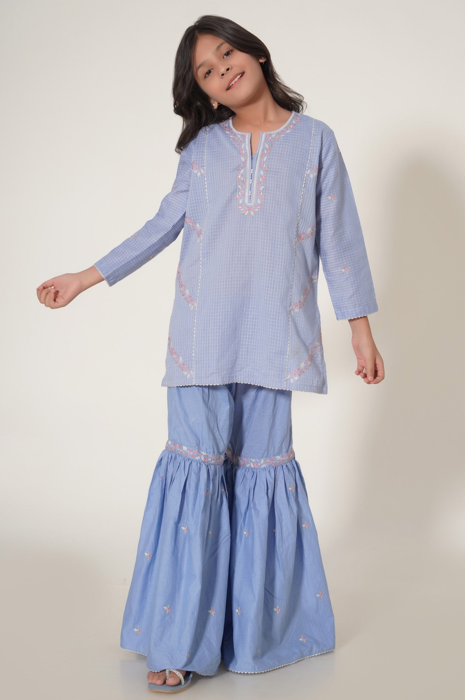 This 2-piece outfit is rendered with floral embroidery on the neckline and side panels placed in a diagonal manner with addition to pearl embellishment on the placket, The shirt is paired with a gharara consisting of embroidery all over. It's a must-have for a festive occasion to uplift your kid's mood.