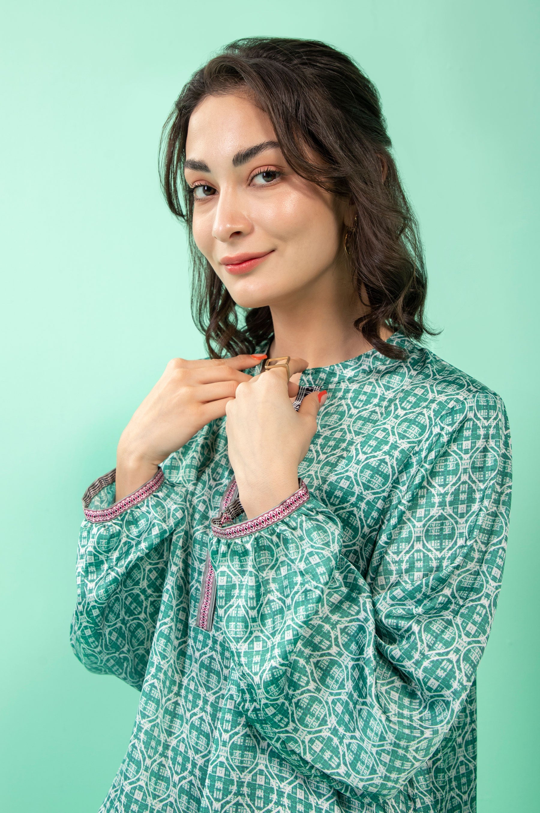 An artistically appealing design is layered over this trendy silk top, gracefully adorned with geometric prints. Pair it up with Zeen denim and shine at evening soirees.
