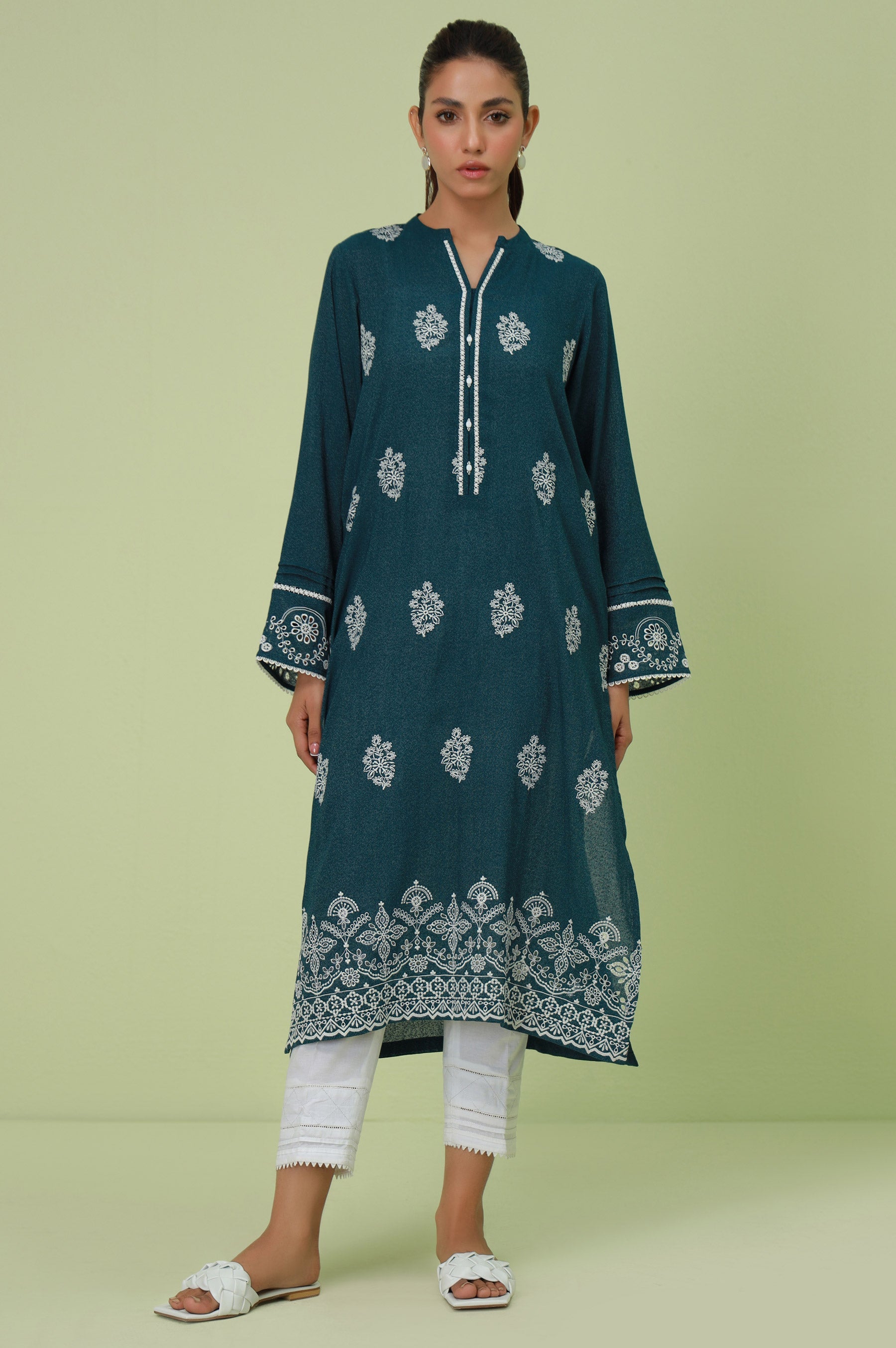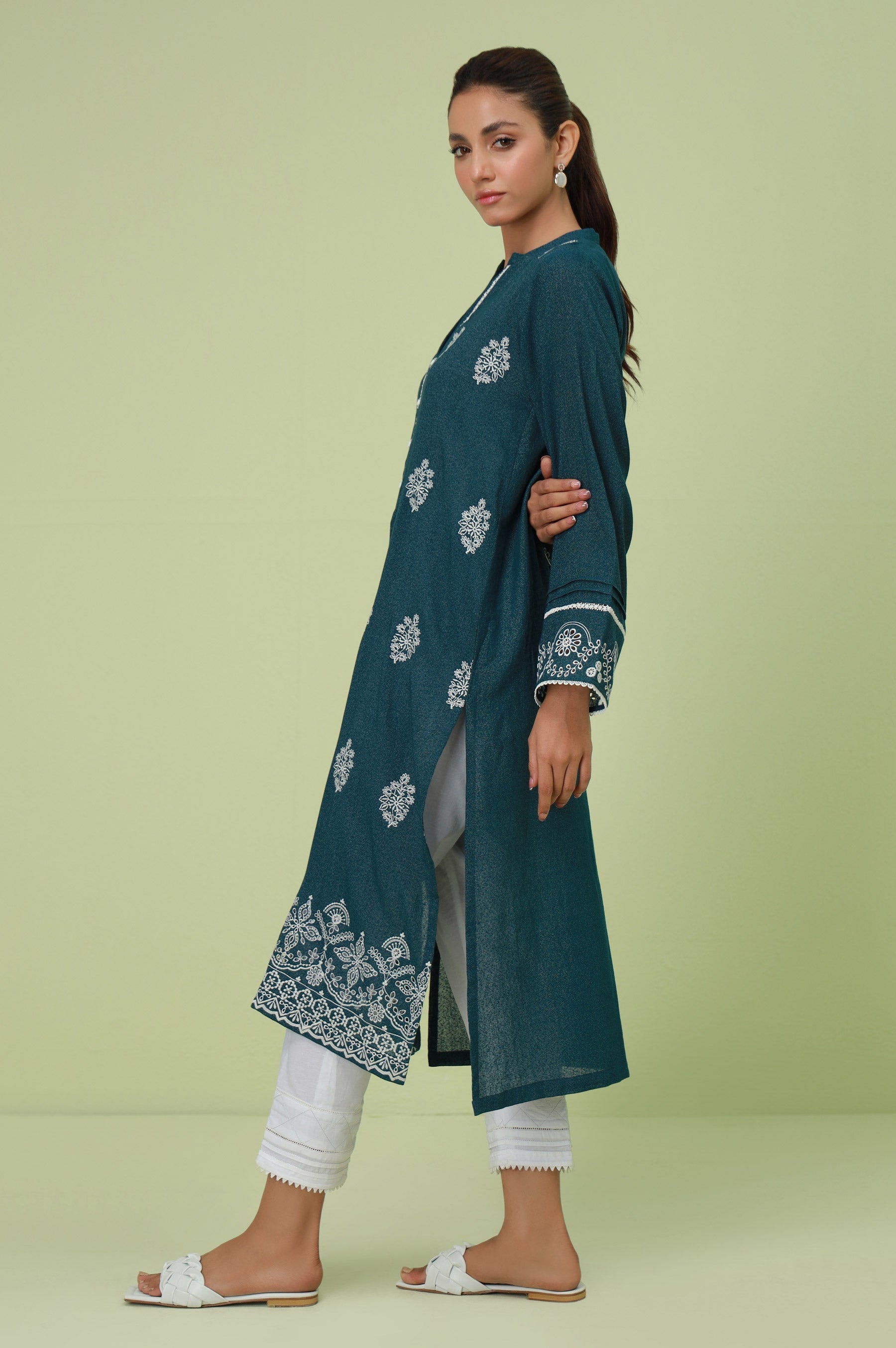 Make a statement with this Teal Chikankari Shirt, a fusion of style and grace. This stitched 1-piece shirt features intricate Chikankari embroidery on Textured Lawn fabric, adding a touch of artistry to your wardrobe.