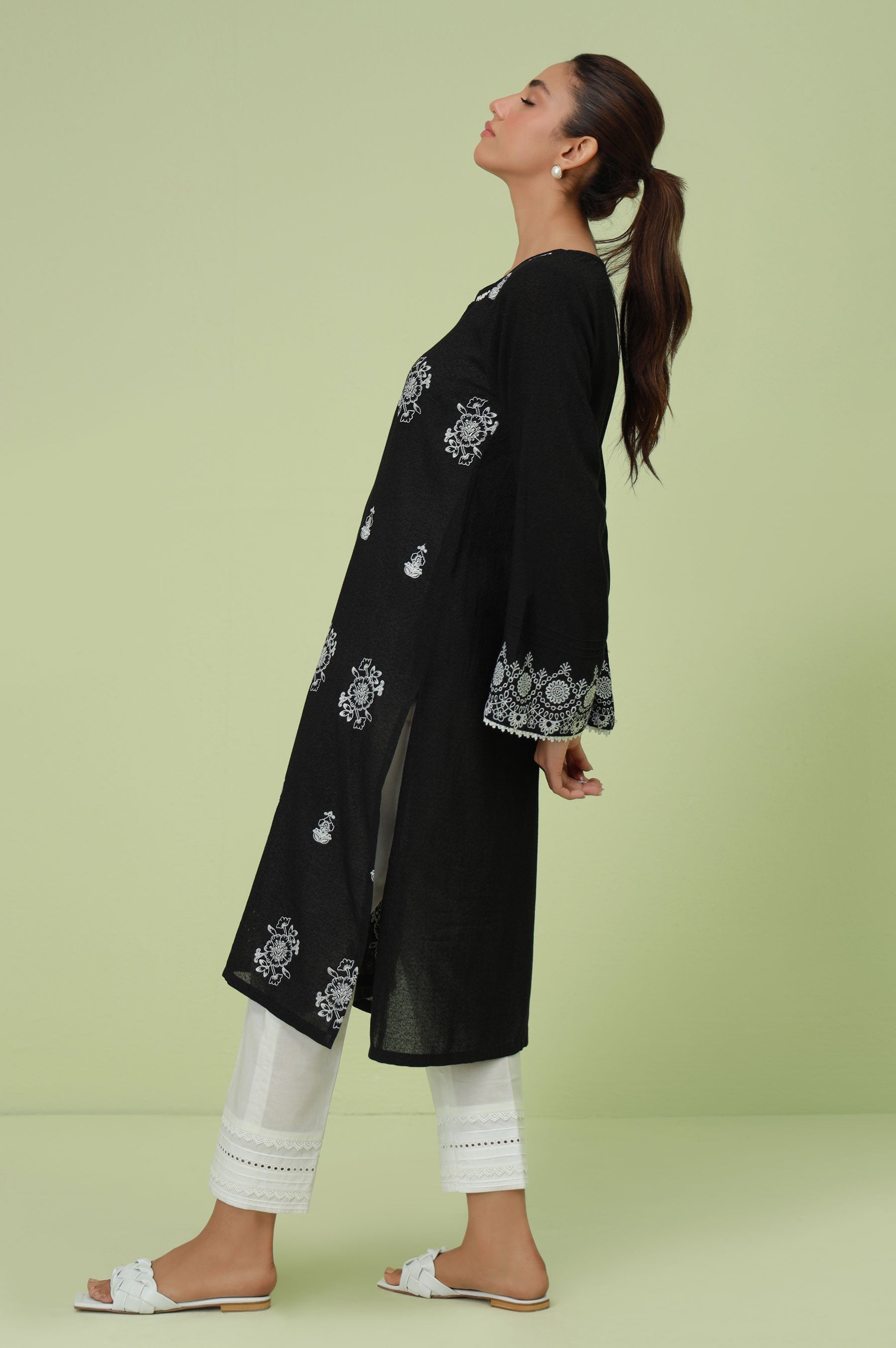 Embrace sophistication in this 1 piece stitched black textured lawn chikankari embroidered shirt. The round neckline with A-line silhouette, create a flattering fit. The intricate chikankari embroidery adds a classic touch, while the bell sleeves enhance the overall appeal.