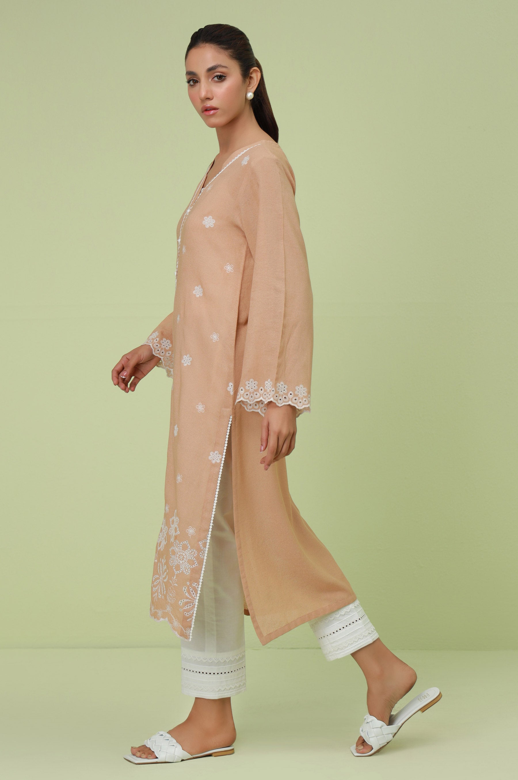 Elevate your style with this 1 piece stitched peach textured lawn Chikankari Embroidered Shirt. This regular-fit shirt features a V-shape neckline and A-line silhouette, giving you a chic and comfortable look. The bell sleeves add a touch of elegance, making it perfect for any occasion.