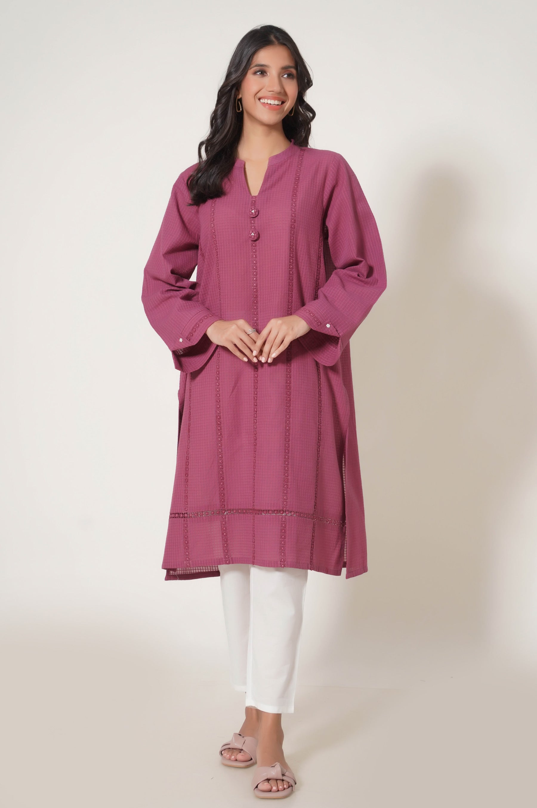 Rosewood pink outfit is coming to your way with appealing styling on checks fabric, including lace detailing in front panel with exquisite button on the placket. Perfect for your season your fit.