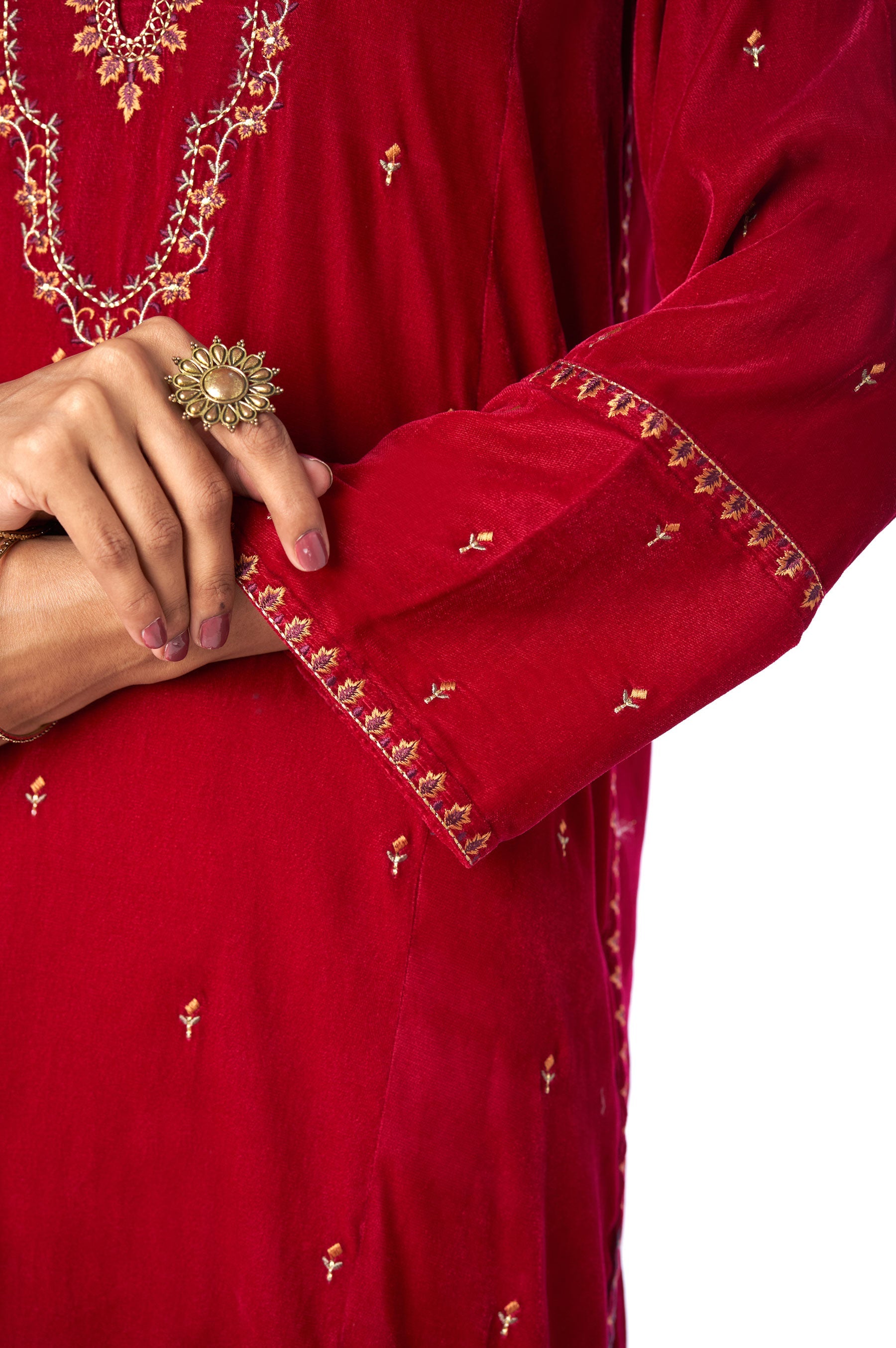 This velvet shirt is a blend of detailed contrasting colors and zari embroidery. It has a statement neckline and intricate motifs overall with a floral lace running in the sides and border. The rich Fuchsia color is the highlight of this shirt and will make it stand out in any occasion.