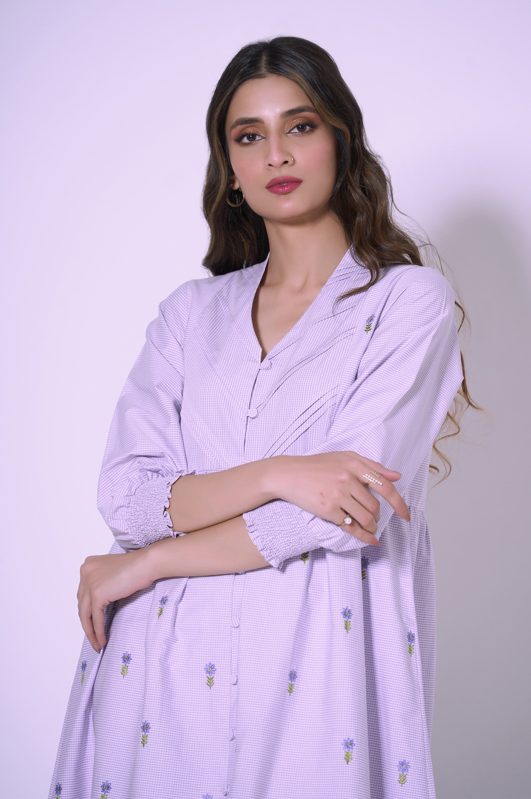 Lilac long dress has a modern yet fun feel ot it consisting of balloon sleeves. The neckline has a flat collar with front open placket