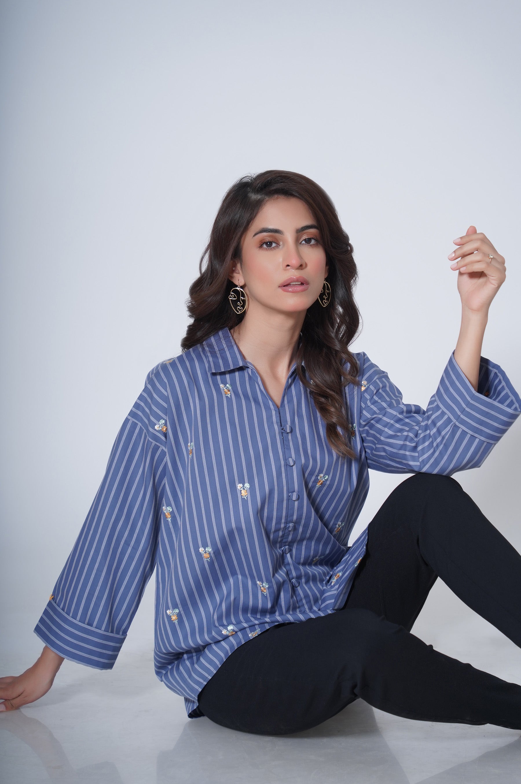 A trending design is portrayed on this contemporary button down top illustrated in blue yarn dyed stripes.