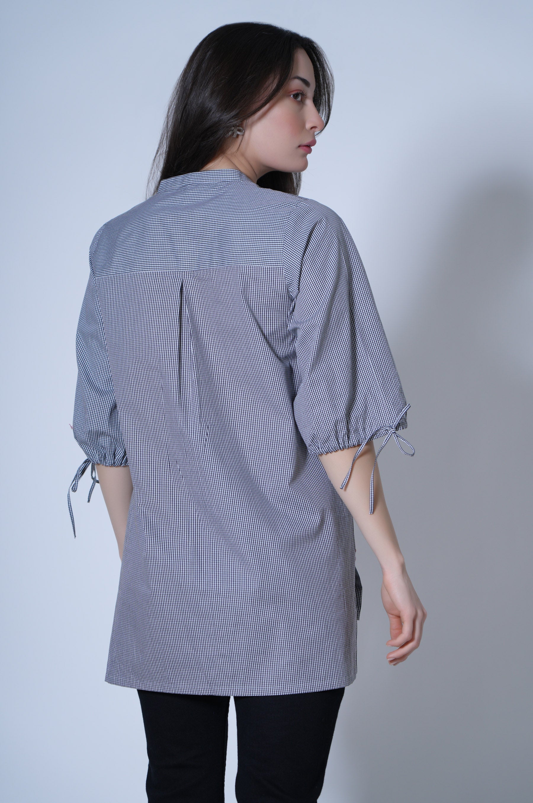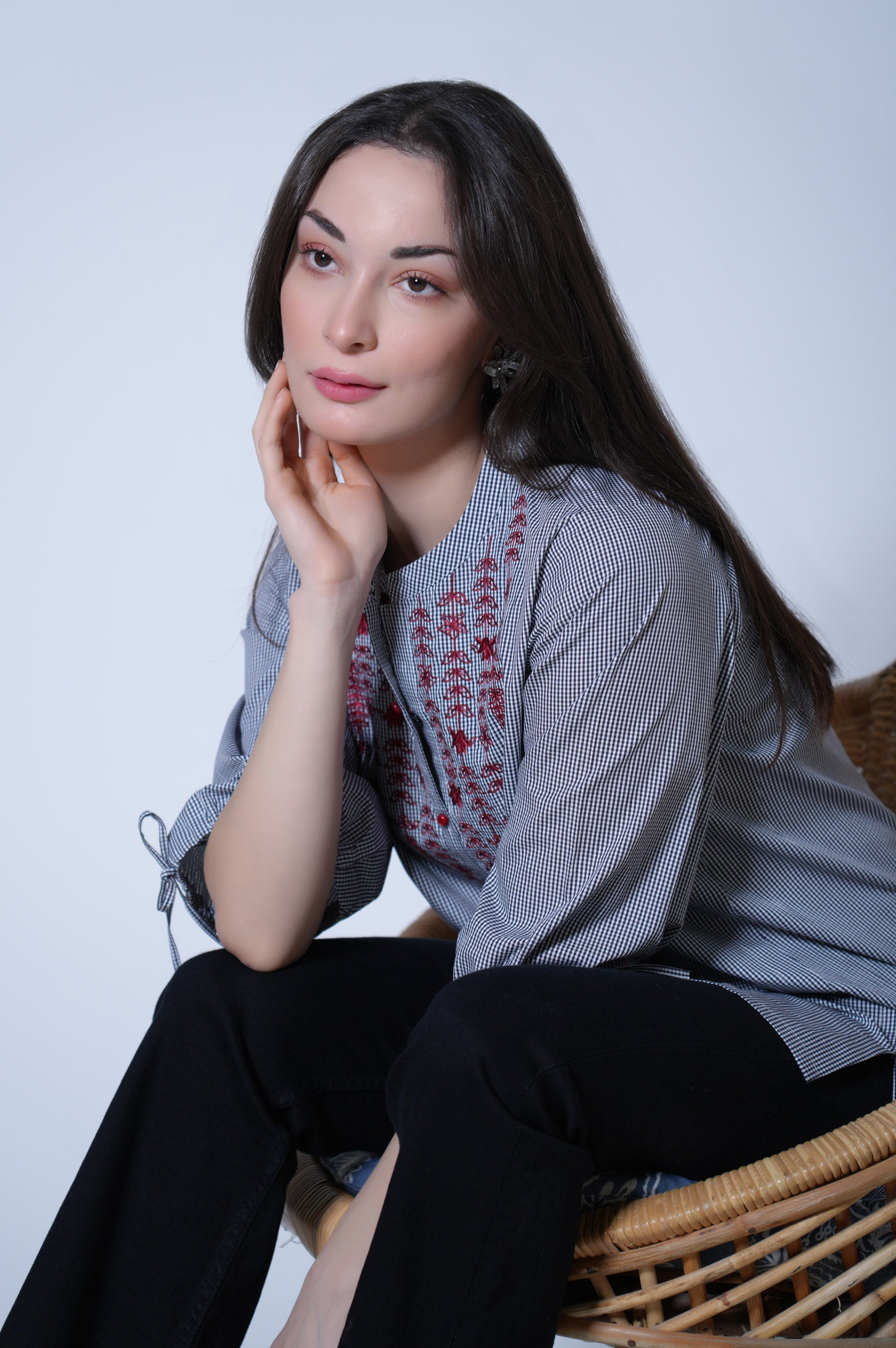 Black checkered embroidered fusion top has a very modern silhouette, consisting of geometrical pattern embroidery on the front with gathers on sleeves along with red colored buttons on the placket and on the sides of the top complimenting the embroidery color to add more detail.