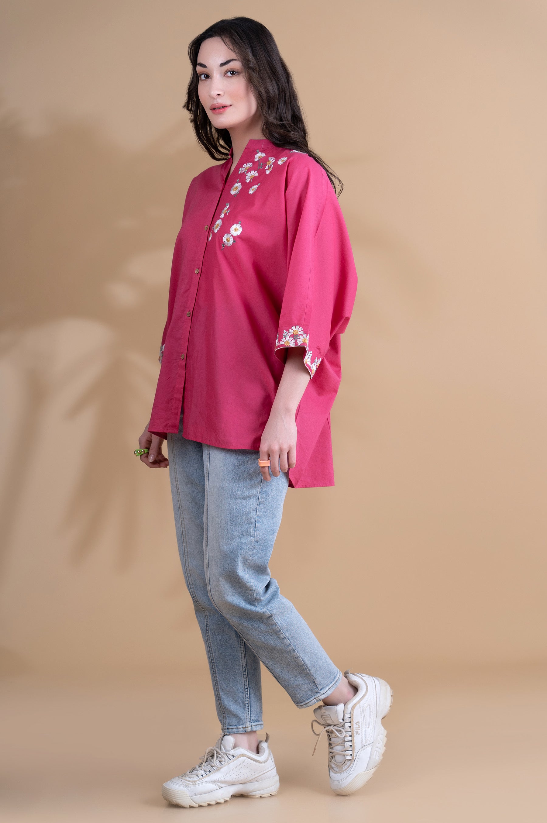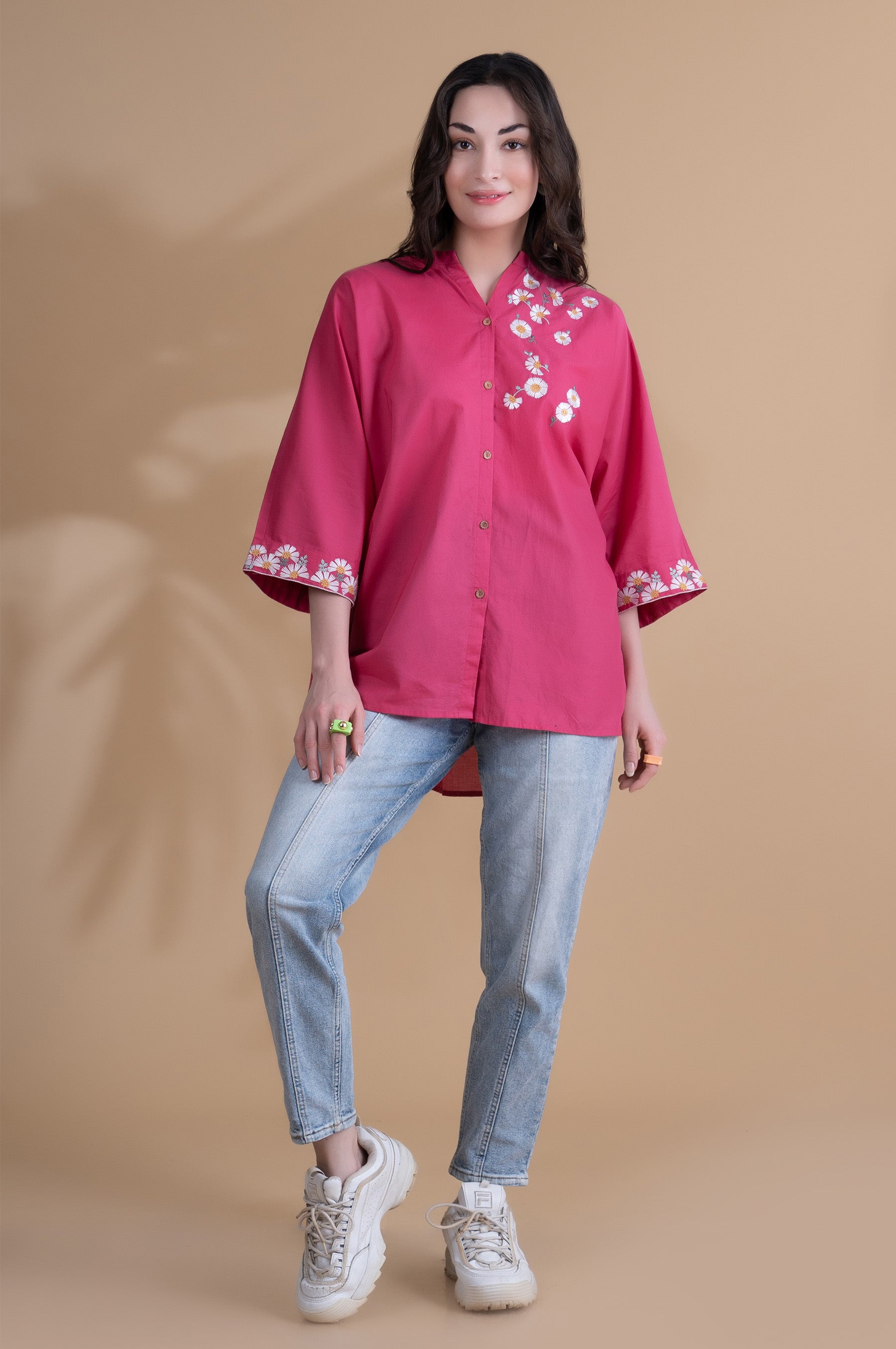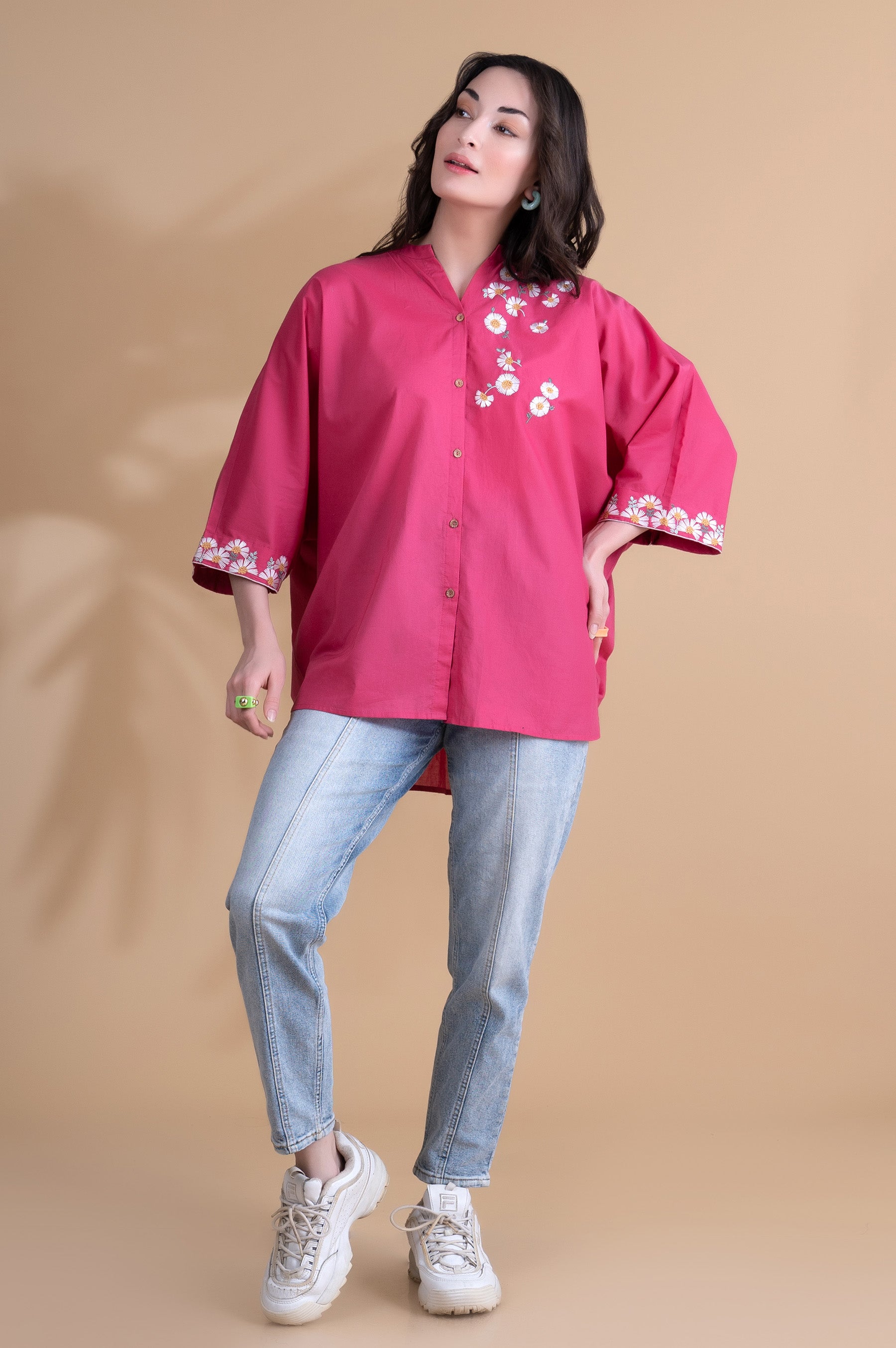 This fusion top features contemporary floral embroidery on front & sleeves. Added with smart button detail on back panel.