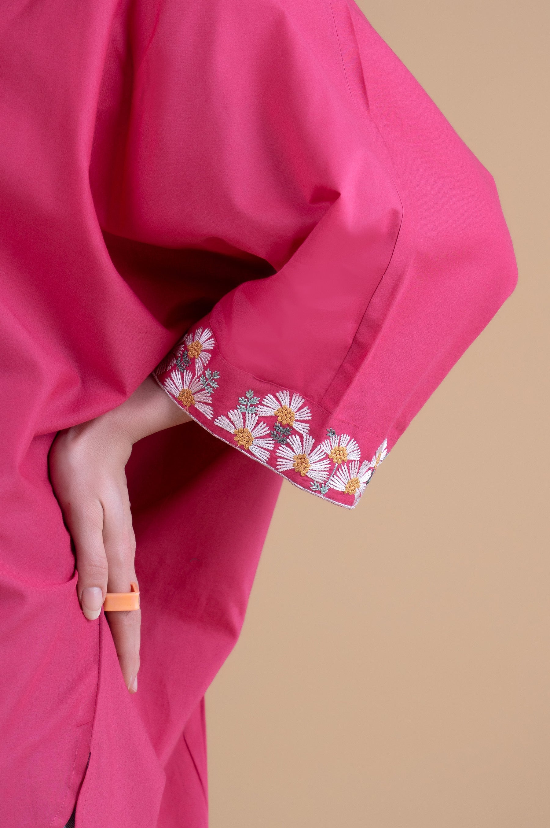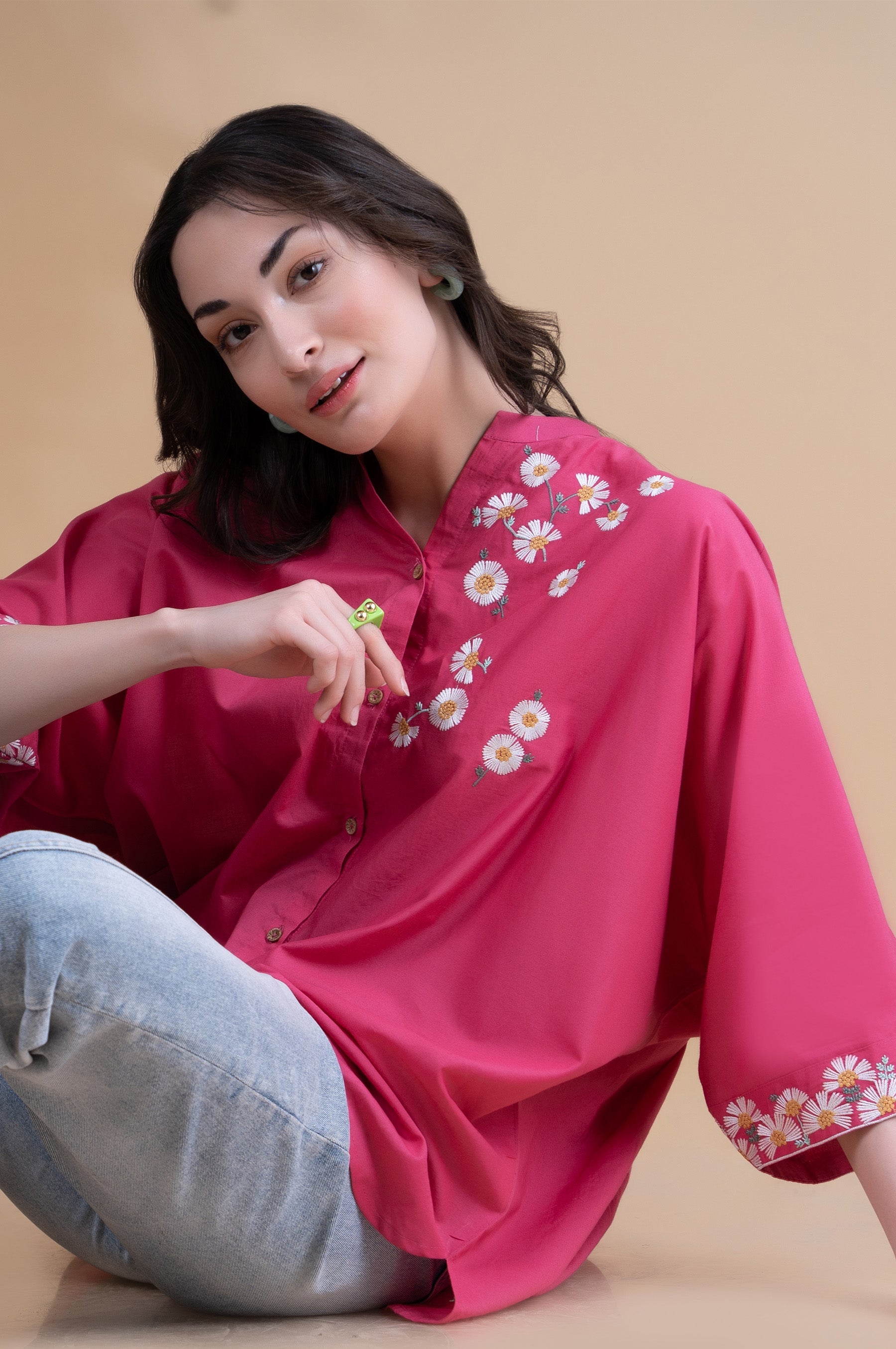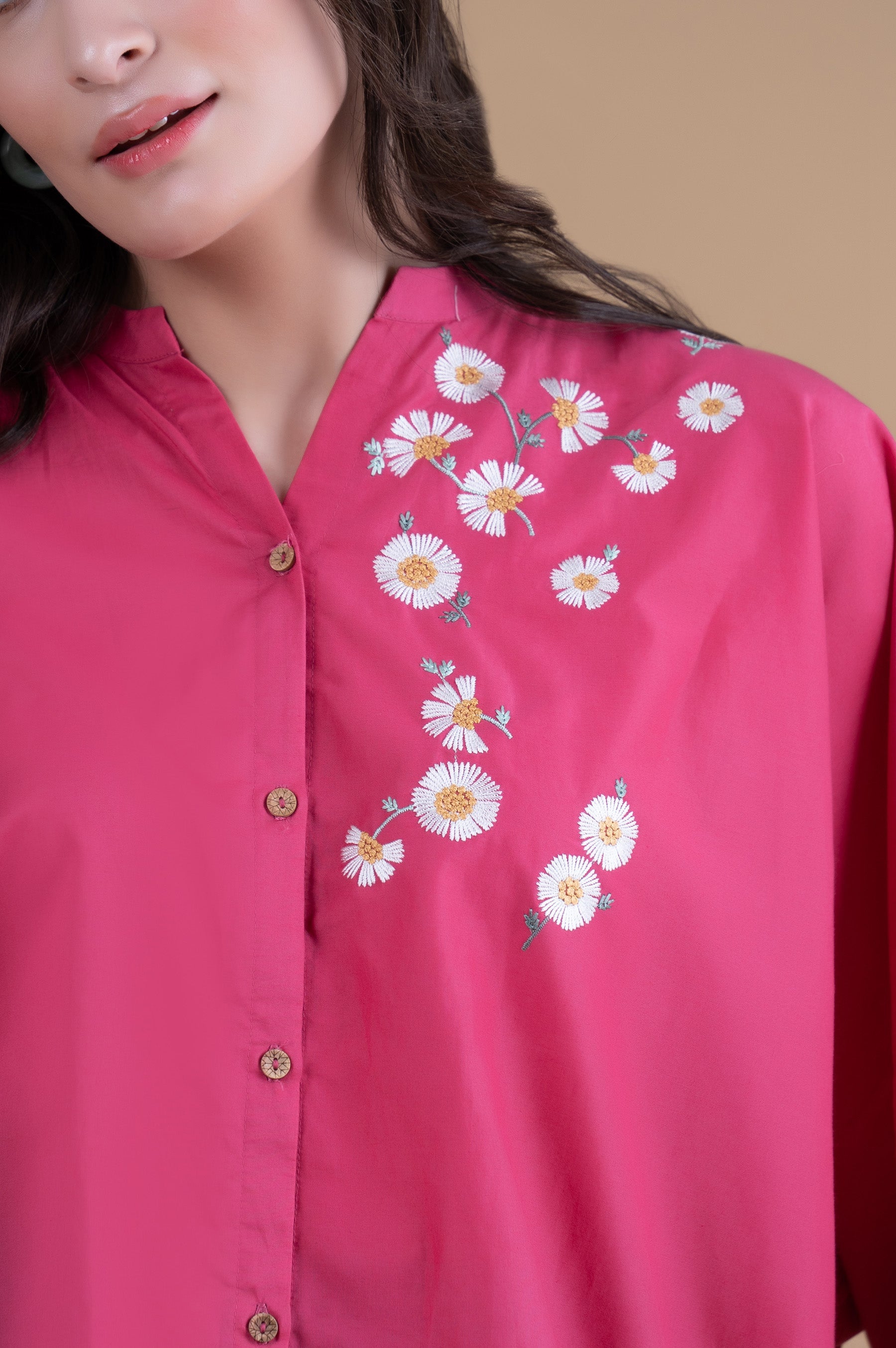 This fusion top features contemporary floral embroidery on front & sleeves. Added with smart button detail on back panel.
