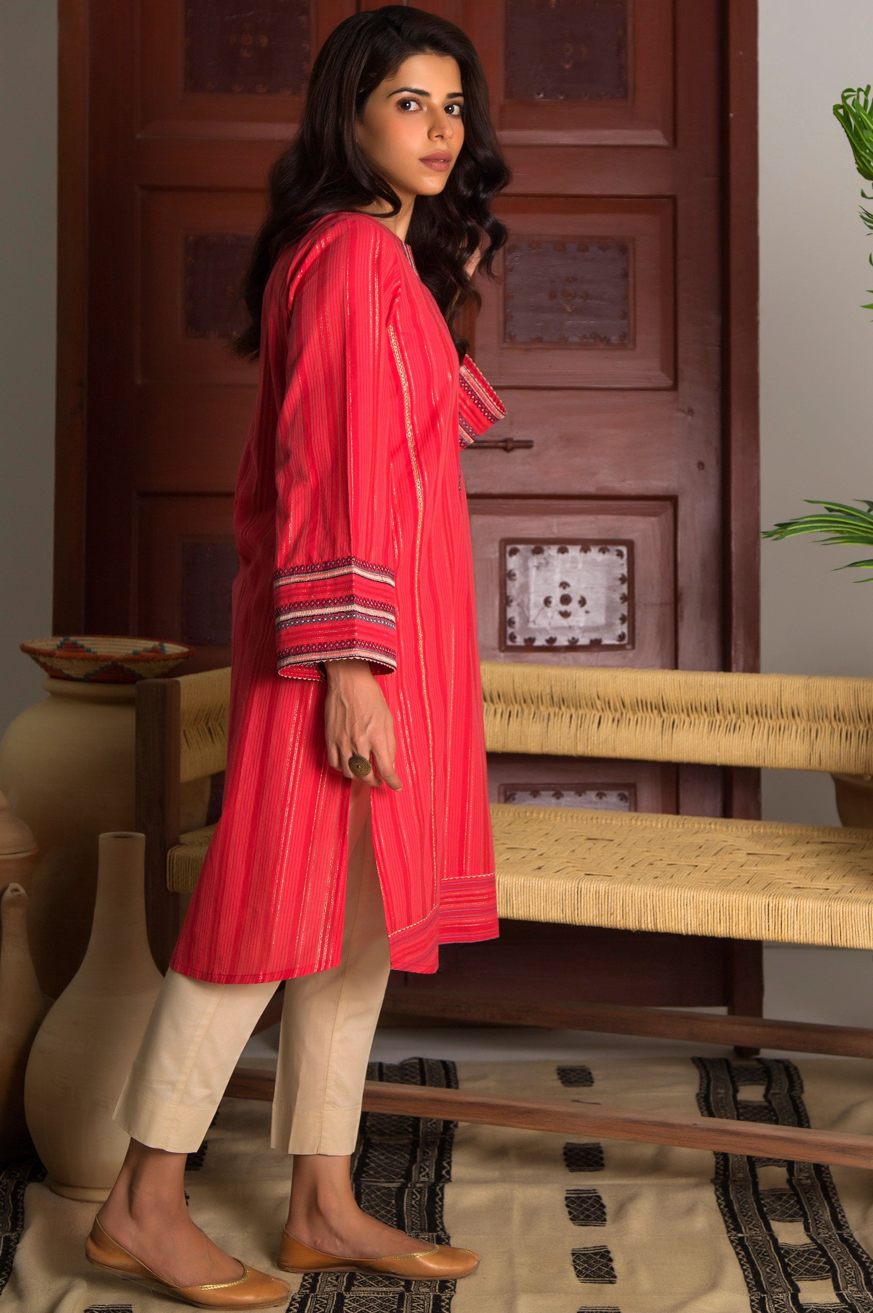 For an eclectic and dressed up look go for this bold Cardinal Red Yarn dyed straight shirt esembled with embroidered neckline and borders on sleeves.To complete the look you can pair it with Zeen's Bottom.The lenght of the shirt will vary from 40-42 inches in different sizes.