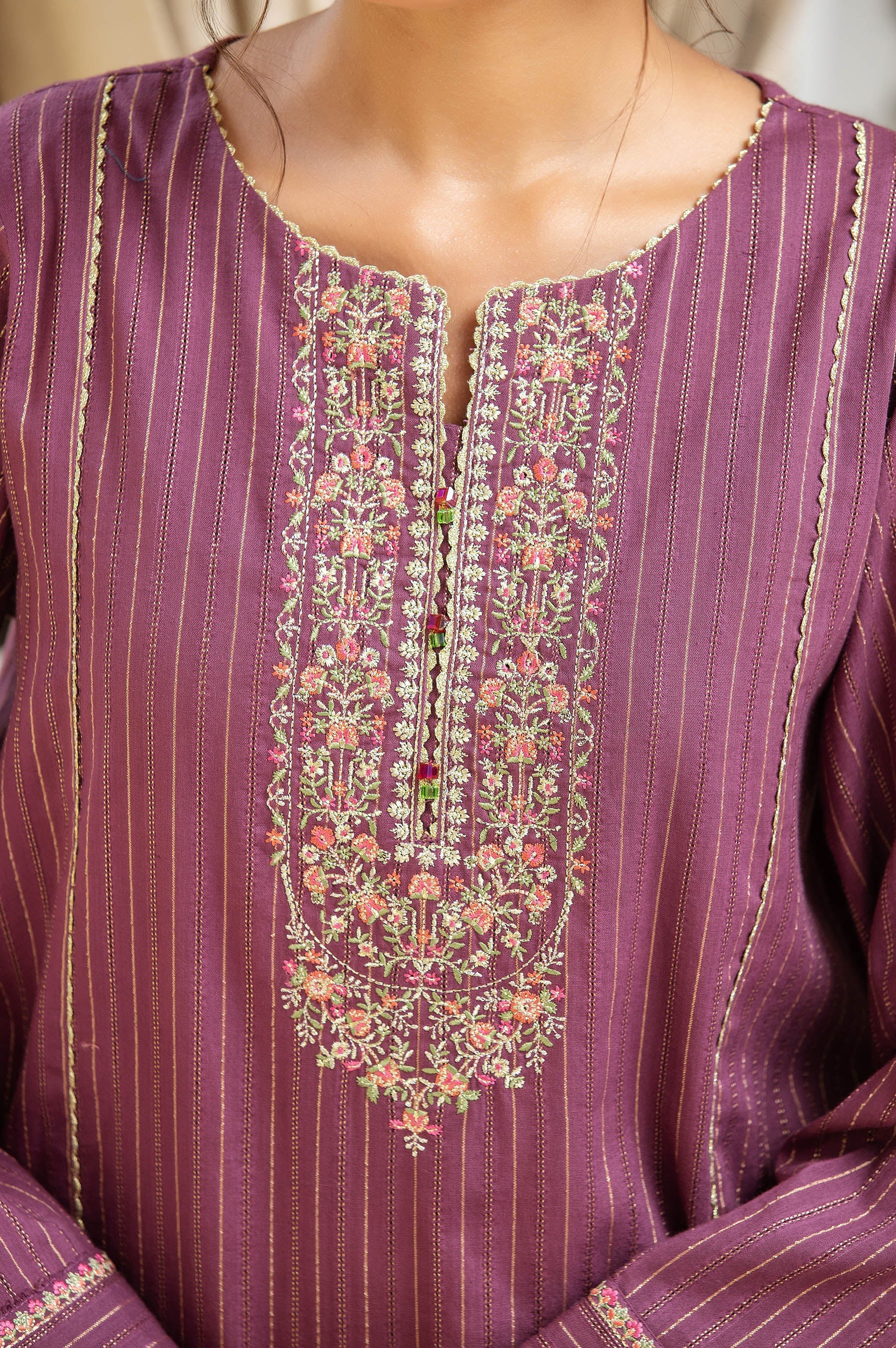 Our Classic Dreamy Purple Silhouette is illustrated with Beautiful Ethnic Embroidered Neckline on Zari Tarkashi fabric, finished off with embellished sleeves for a classic look.