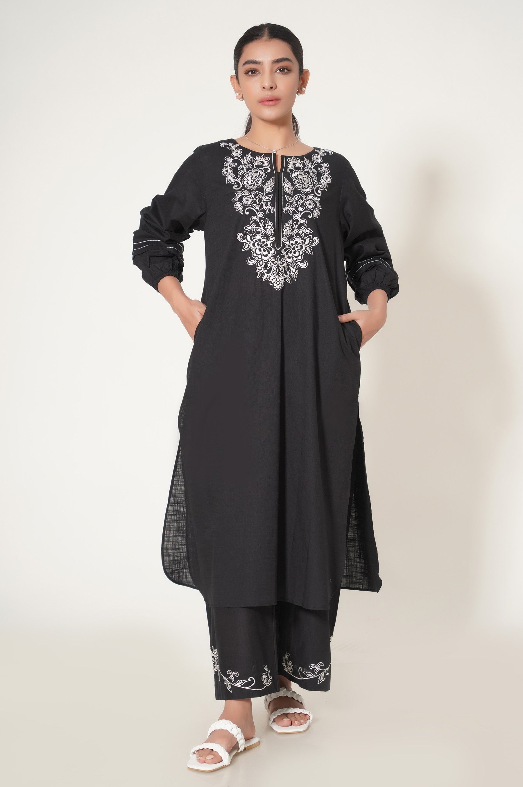 Black kurta designed beautifully with floral embroidery on the neckline. The silhouette of the shirt is long with round hem giving it a modern look along with balloon sleeves with fabric manipulation. To complete the whole look embroidered culottes are paired with it making the outfit look elegant.