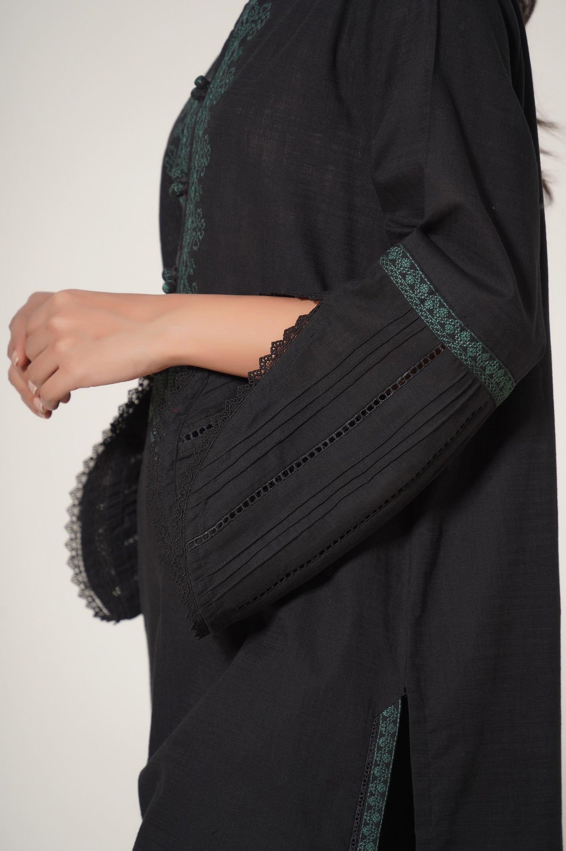 Black kurta with vector pattern, deep green coloured embroidery coming on the nekline and embroidery lace placed on front joined by an insertion lace. Sleeves are beautifully styled with multiple fabric manipulations such as pintucks and insertion laces followed by minimal embroidery. To complete the entire look of the outfit straight pants are paired with the kurta with embroidery laces on hem.