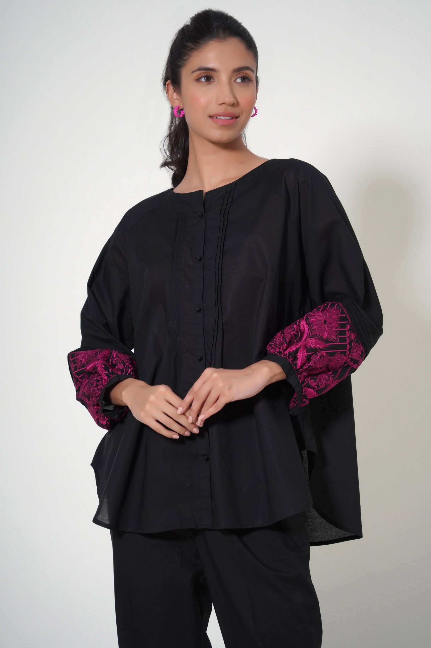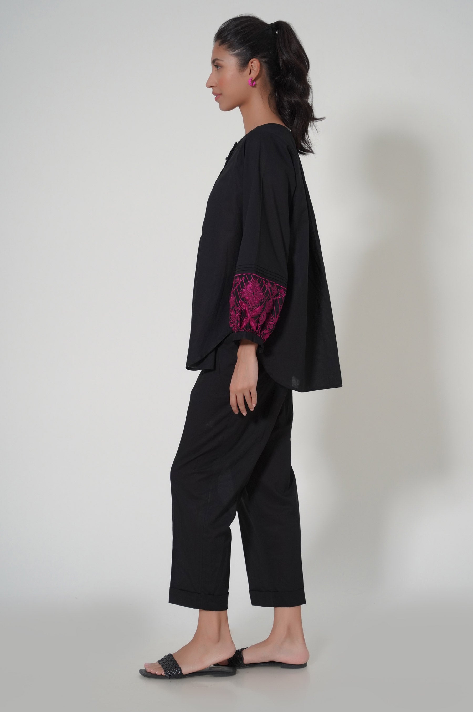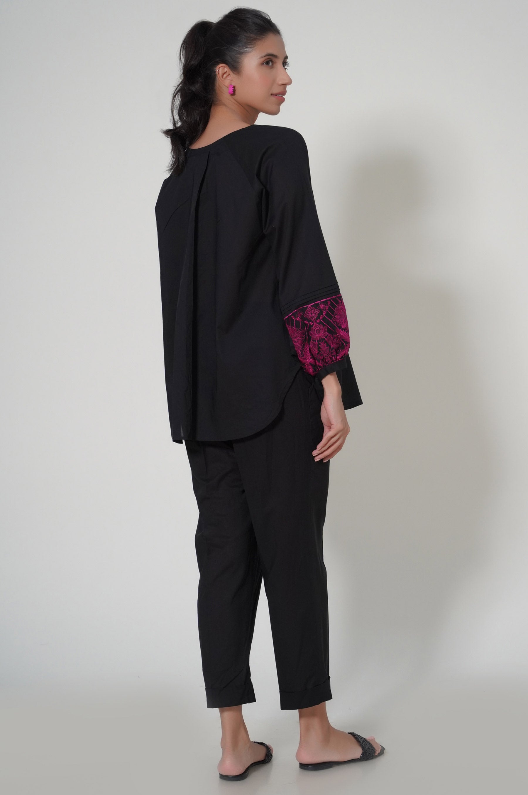 A super fun Co-ord to brighten up your day, perfect for your casual hangouts. The outfit consists of a modern silhouette round neckline with placket along with pleats coming on the front. Balloon sleeves with pleats followed by embroidery give a very chic look to the entire outfit. The top is paired with straight pants with pockets.