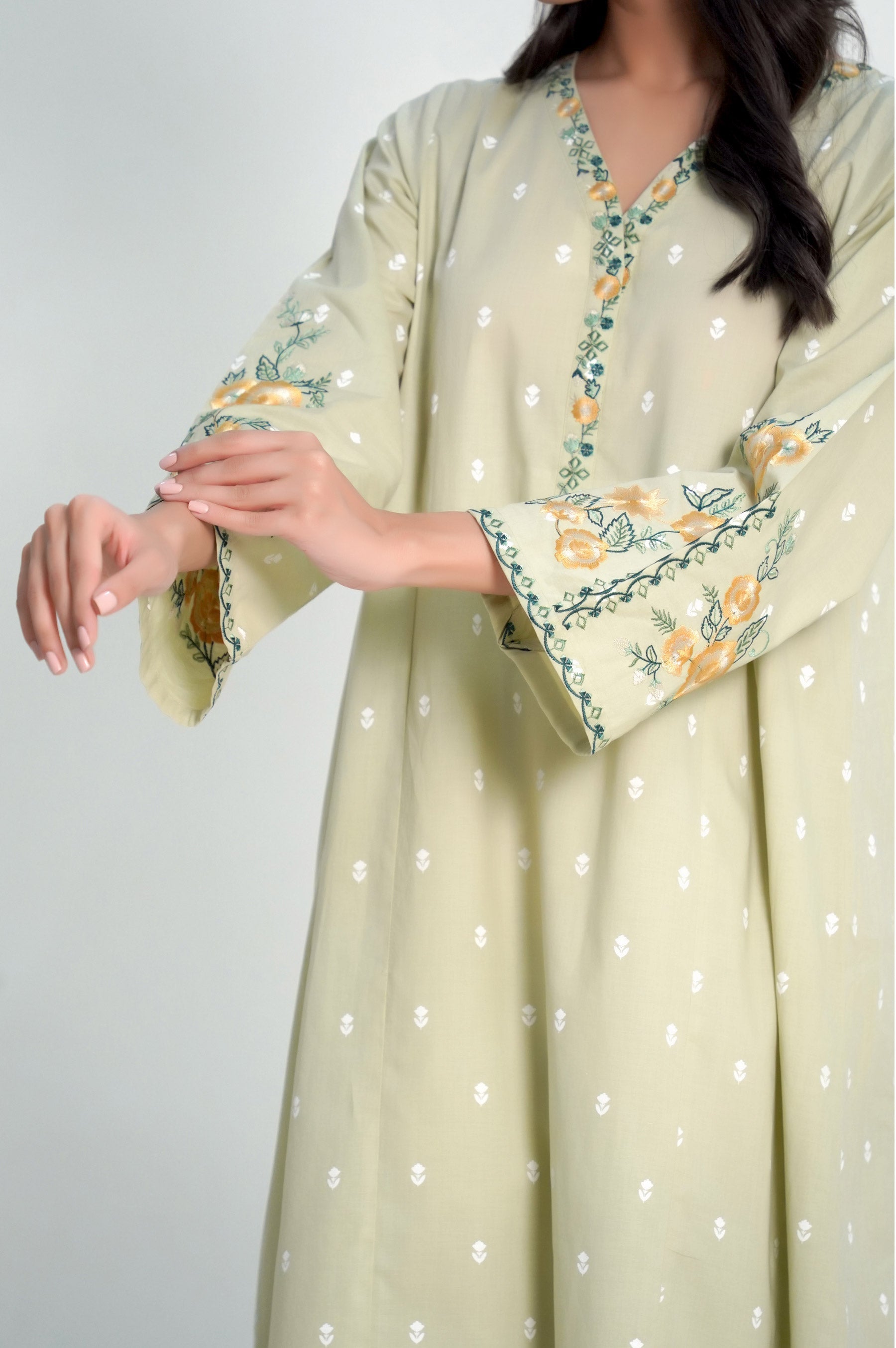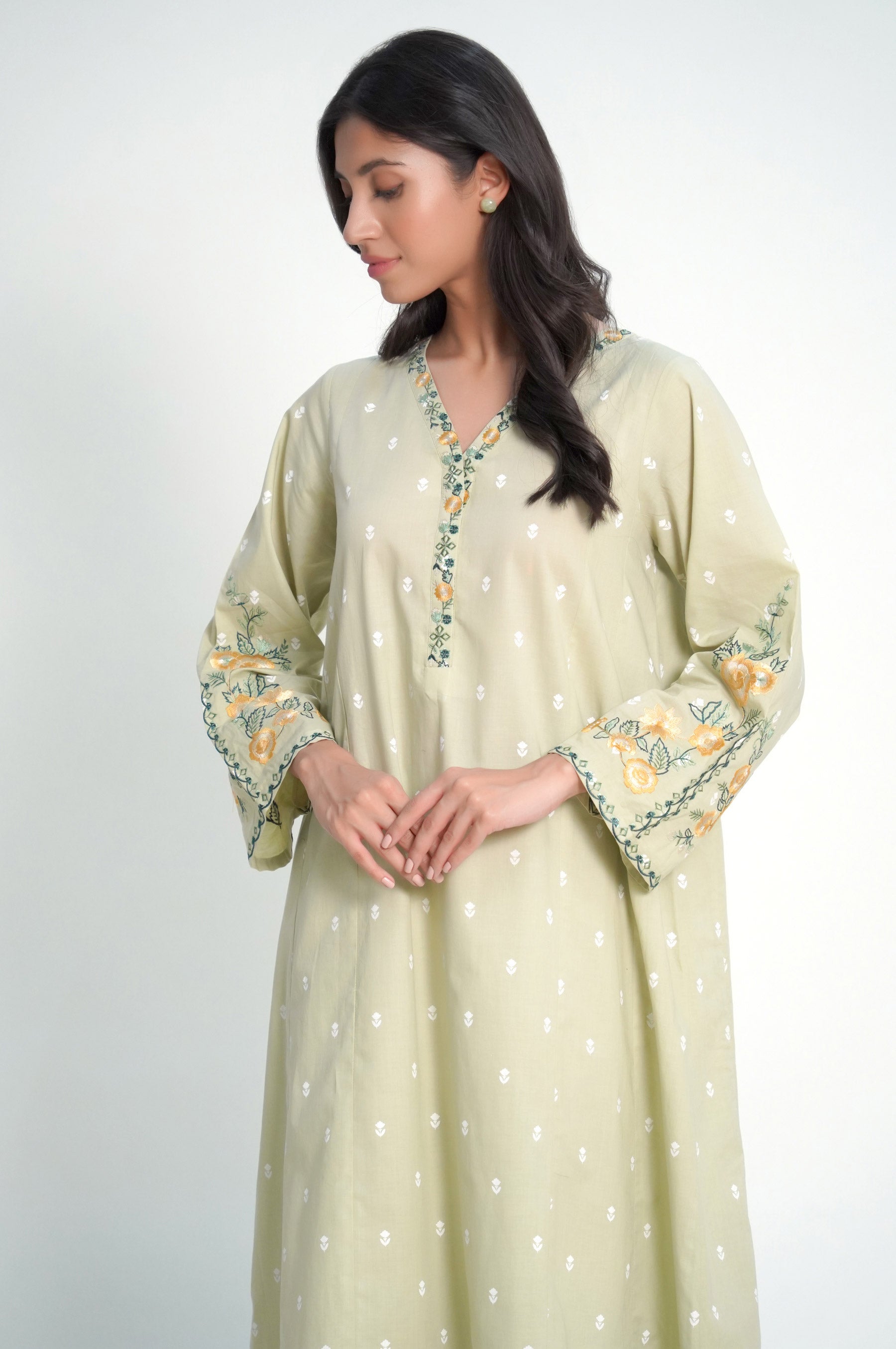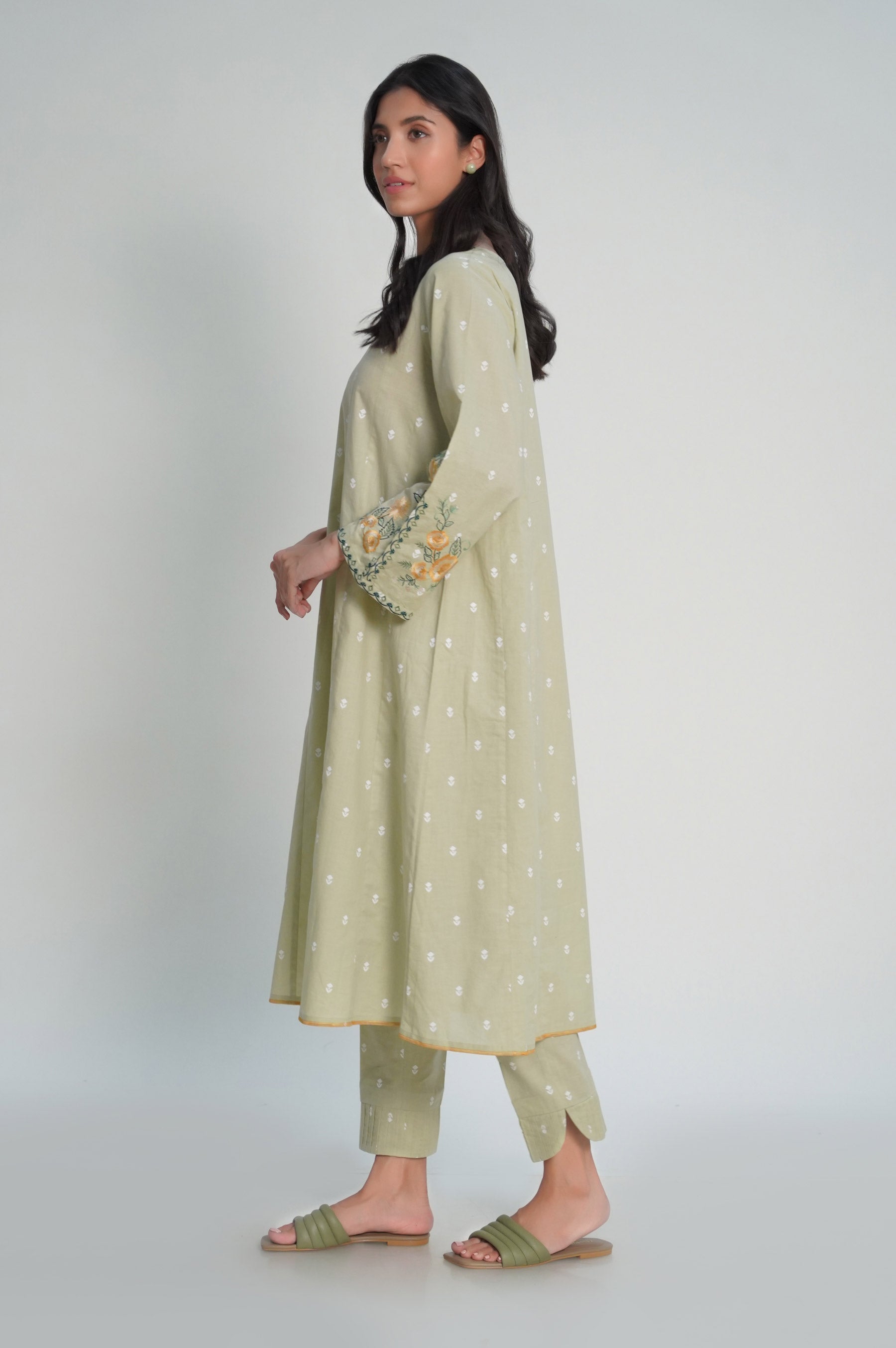 This tea green outfit comprises of A-line cut with screen printed motif, including beautiful contrasting embroidery on placket and sleeves. To complete the aesthetic look, ciggarette pant with pleats detail is added on the bottom hemline.