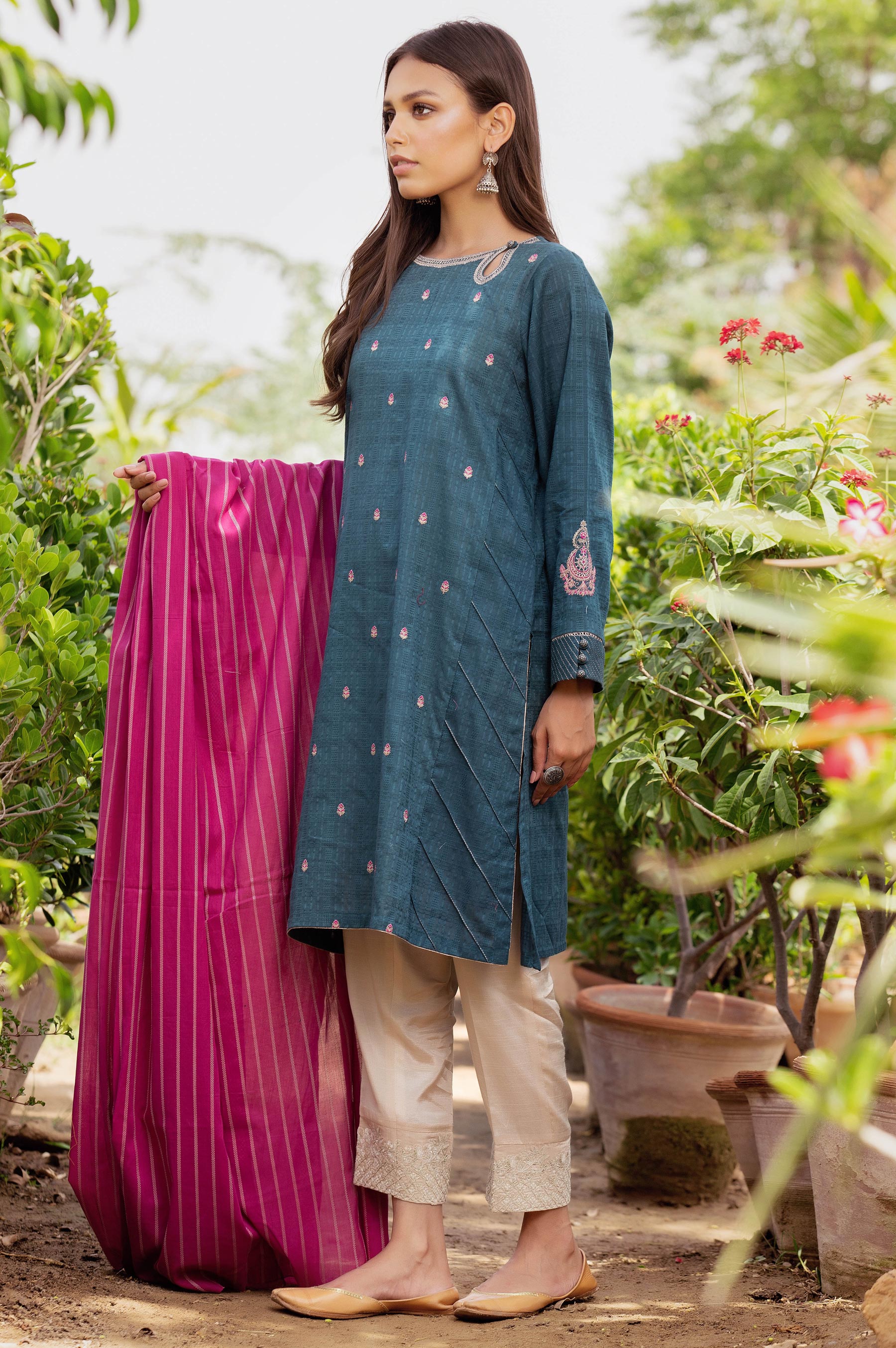 Make a Statement with this Classic Teal colour that Forever stays in Trend.This Tarkashi Shirt is imbued with Contrasting colored Embroidery on front, paired with Pink Jacquard duppata.Sleeves are Stylized with Embroidered Motif and Zari Stitches.