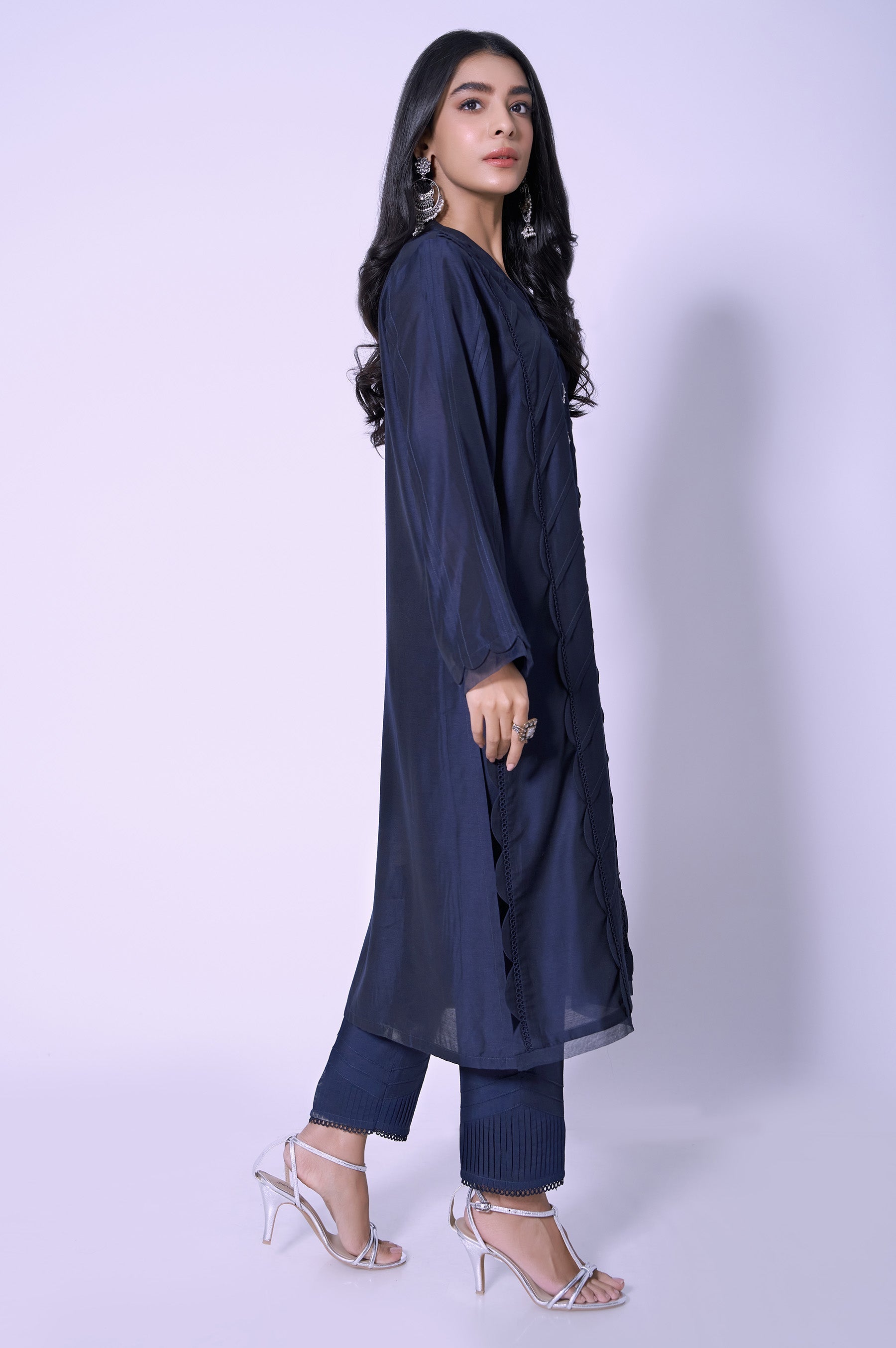 Glide your way through the summer season in mesmerizing glamour clad in the meticulously designed. A classic manipulated in dark blue is fully encrusted with lace and beautiful embellishment on neckline.
