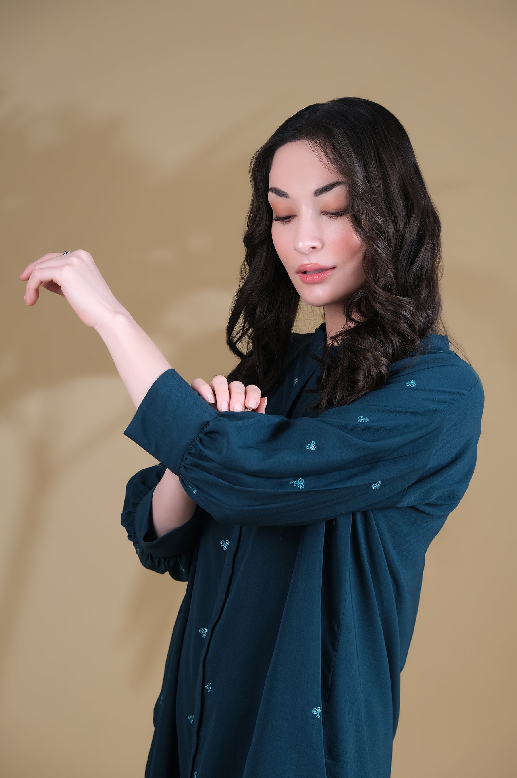 One color tone are the new trend. Be sure to be on trend at any event with this teal co-ord composed with cute floral