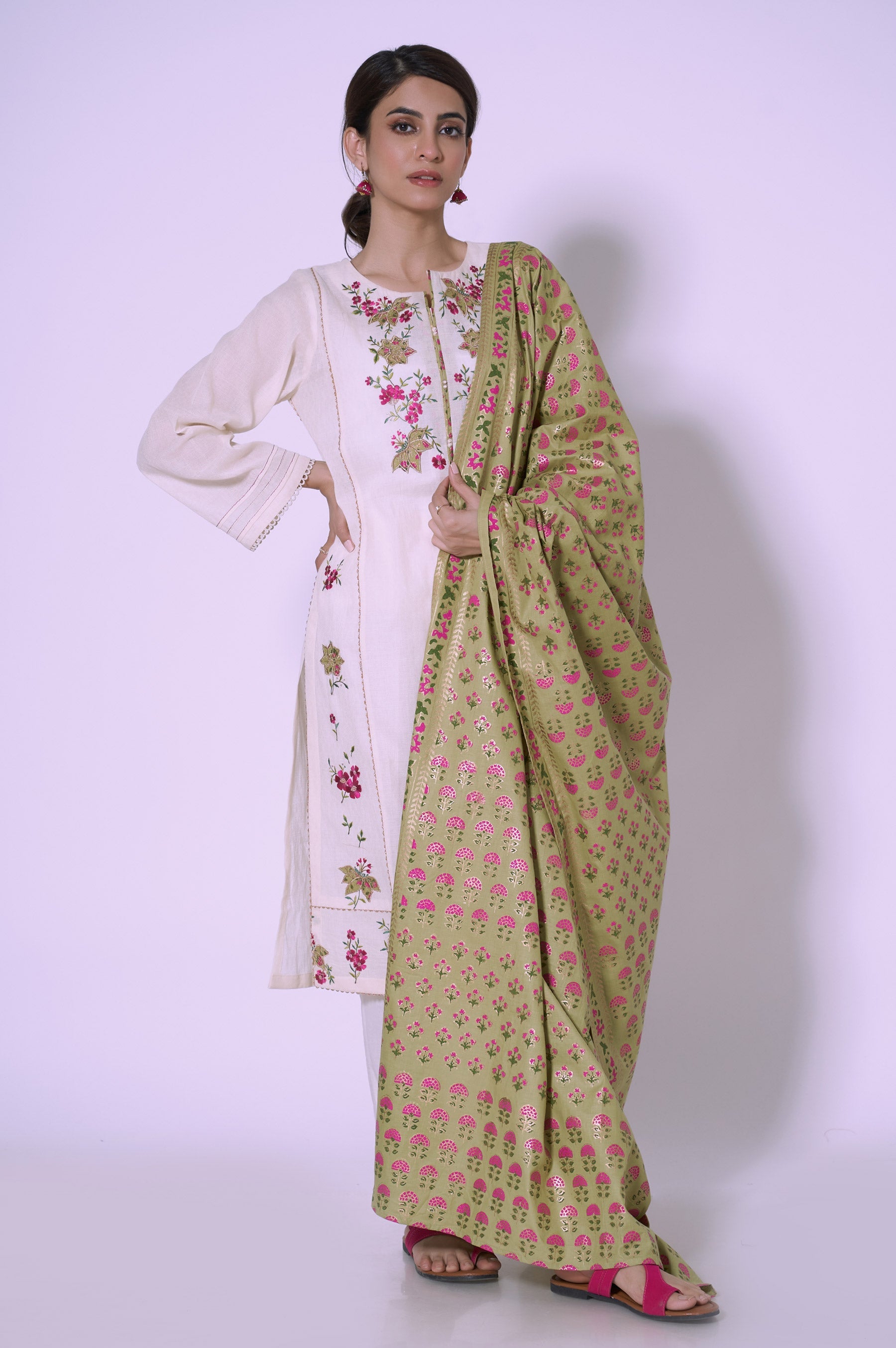 This beautiful kurta cut from dobby fabric accentuated with applique embroidery on the neckline,daman and side pannel of the shirt are the highlights of the shirt. This classic outfit comes with a block printed dupatta in the shade of green that can be worn season after season