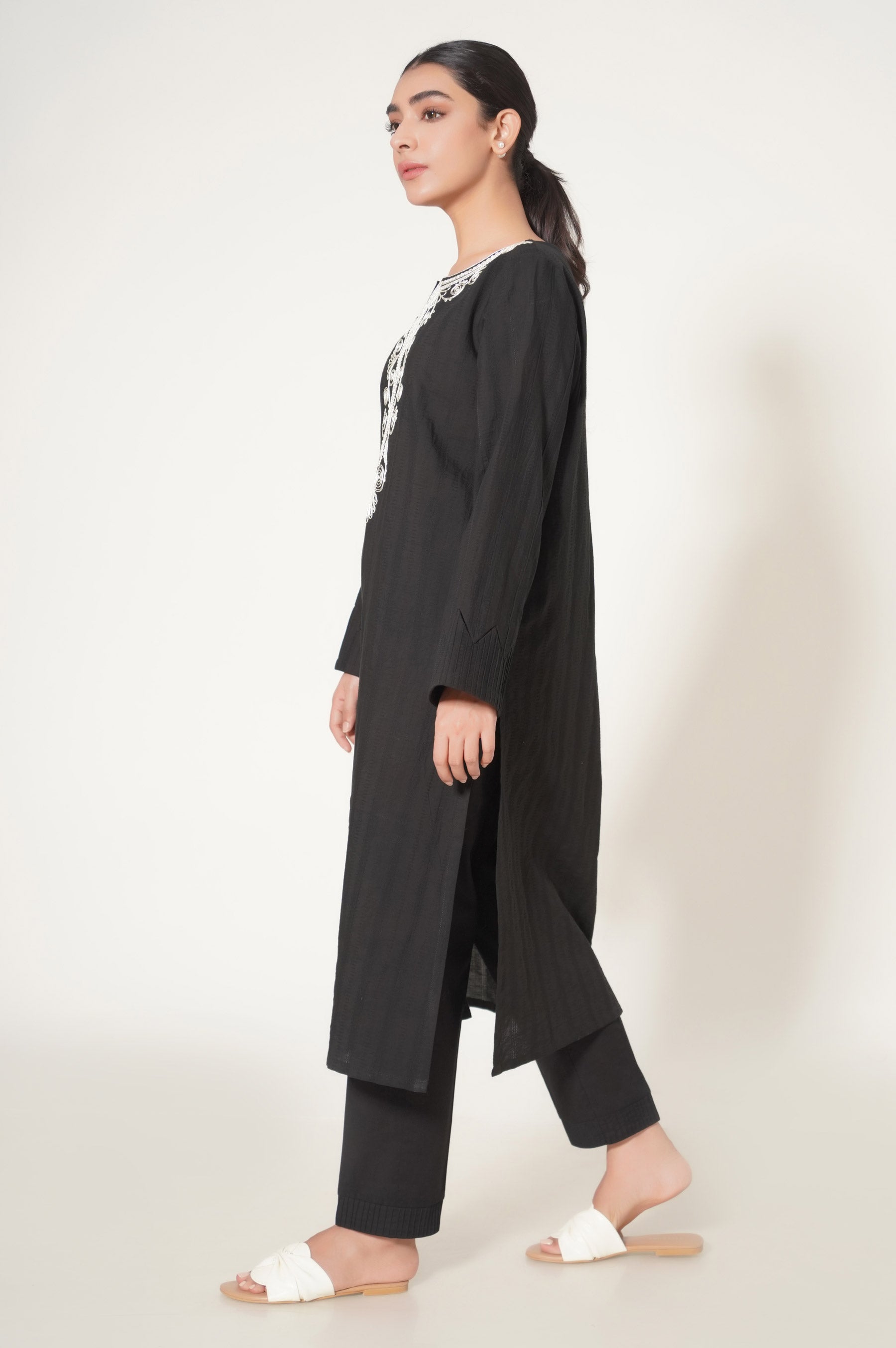 Black kurta features white contemporary embroidery with dori technique on the neckline followed by beautifully stylized sleeves consisting of various fabric manipulations. This minimal kurta is paired with stylized pants to complete the look. This outfit is a must have this summers for your casual hangouts.