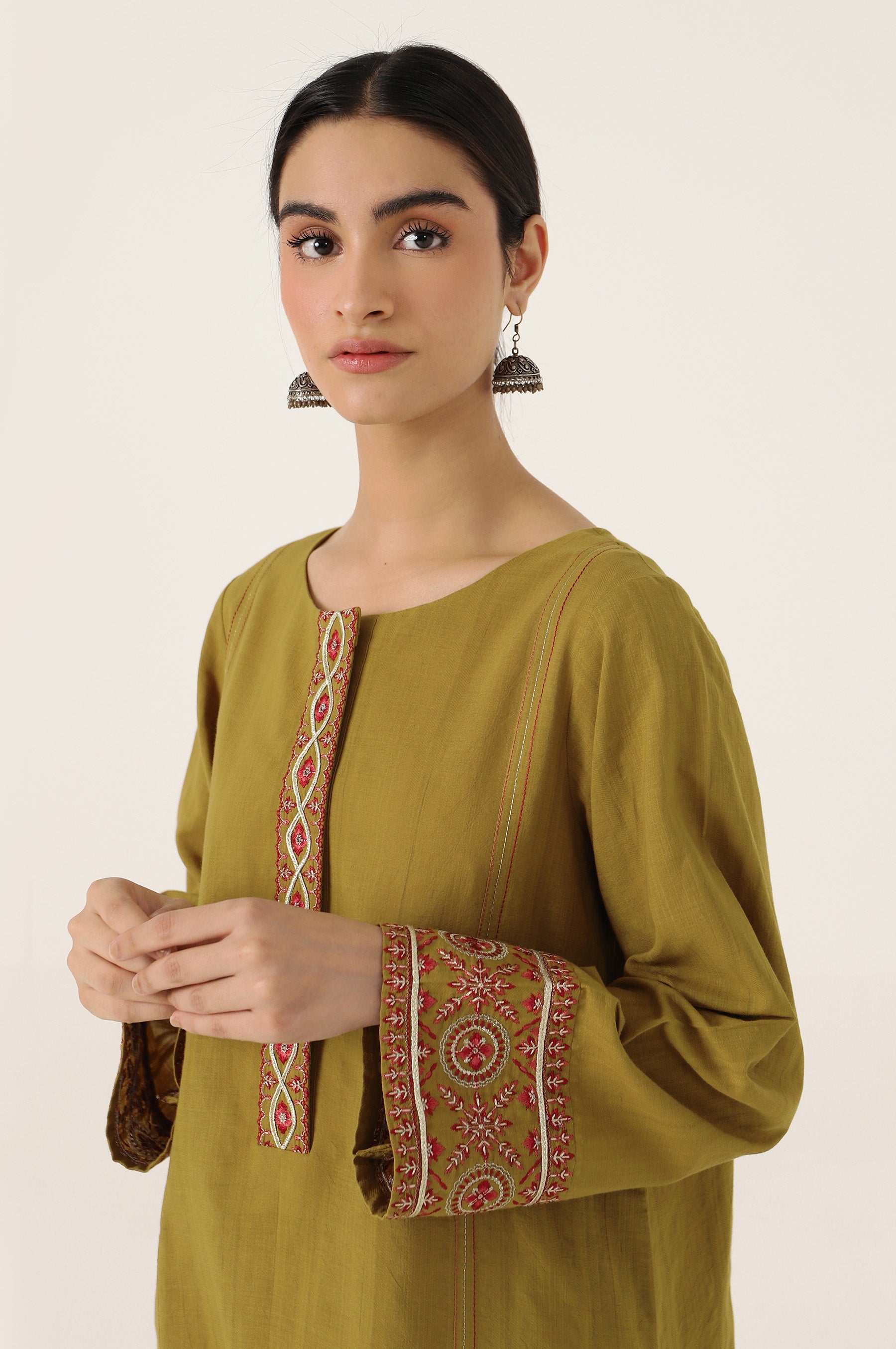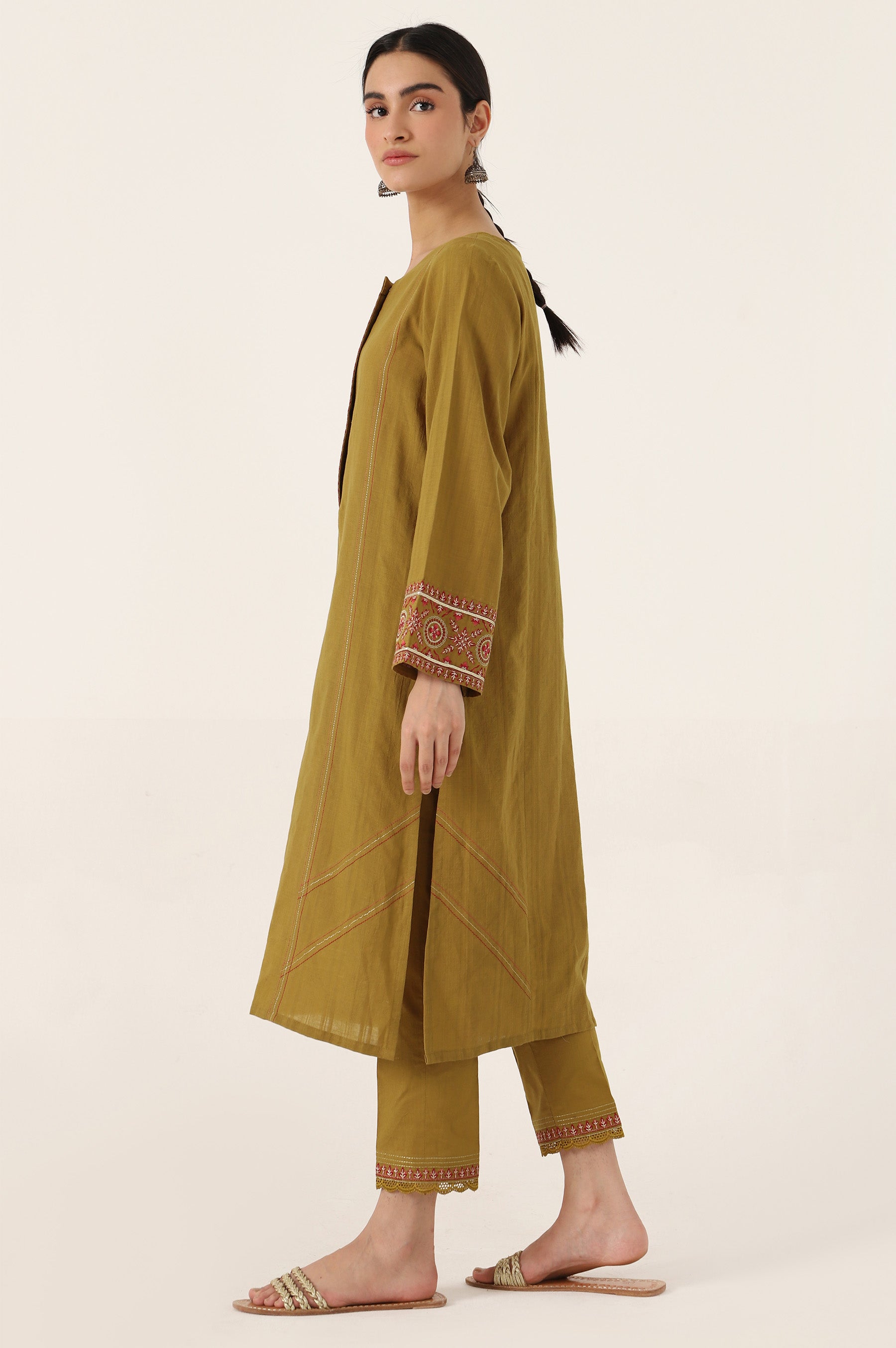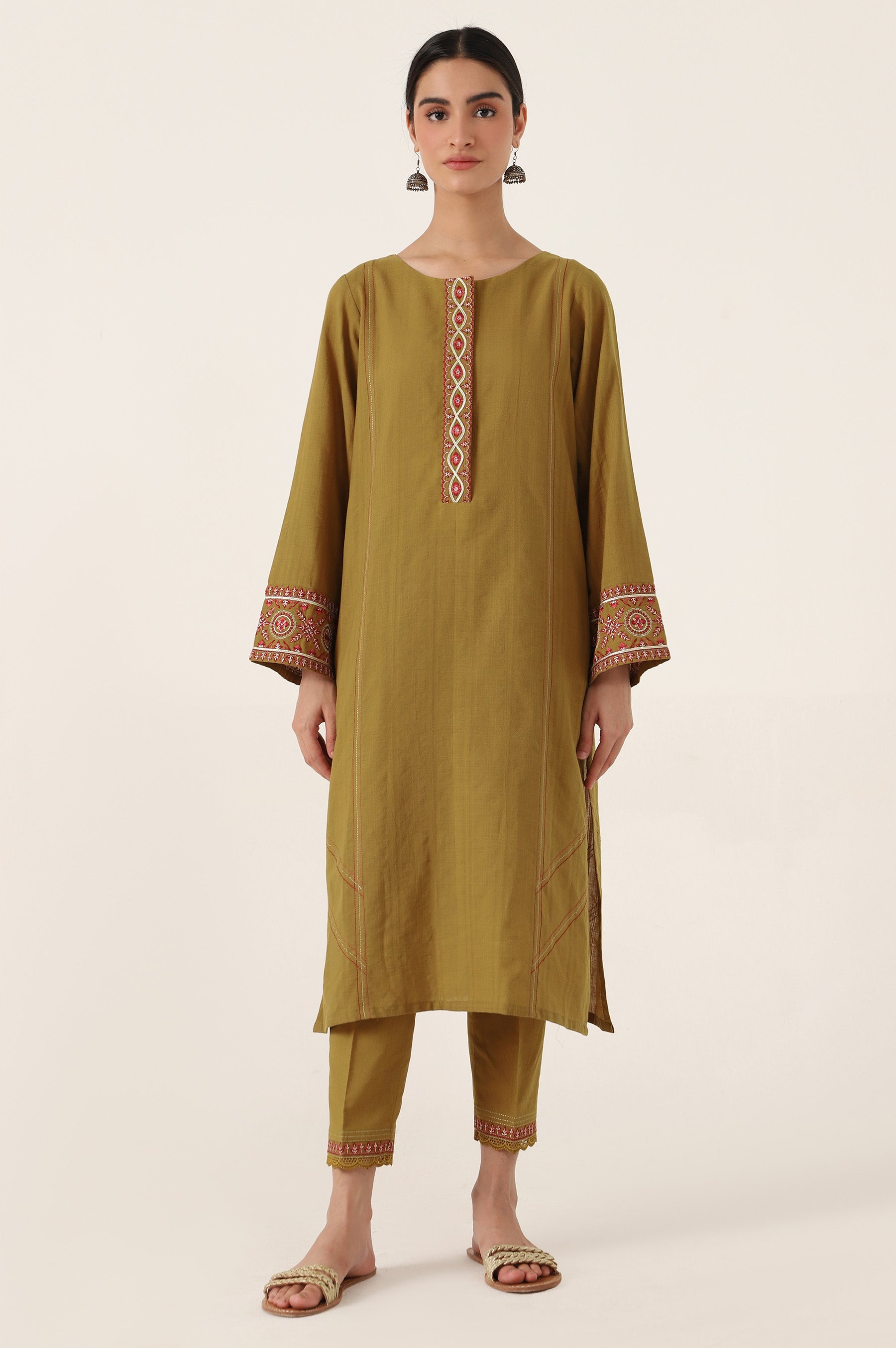 This olive suit features floral embroidery on the placket and the sleeves rendered in contrasting hues to enrich the outfit. This shirt is paired with beautiful embroidered pants to perfect your look.