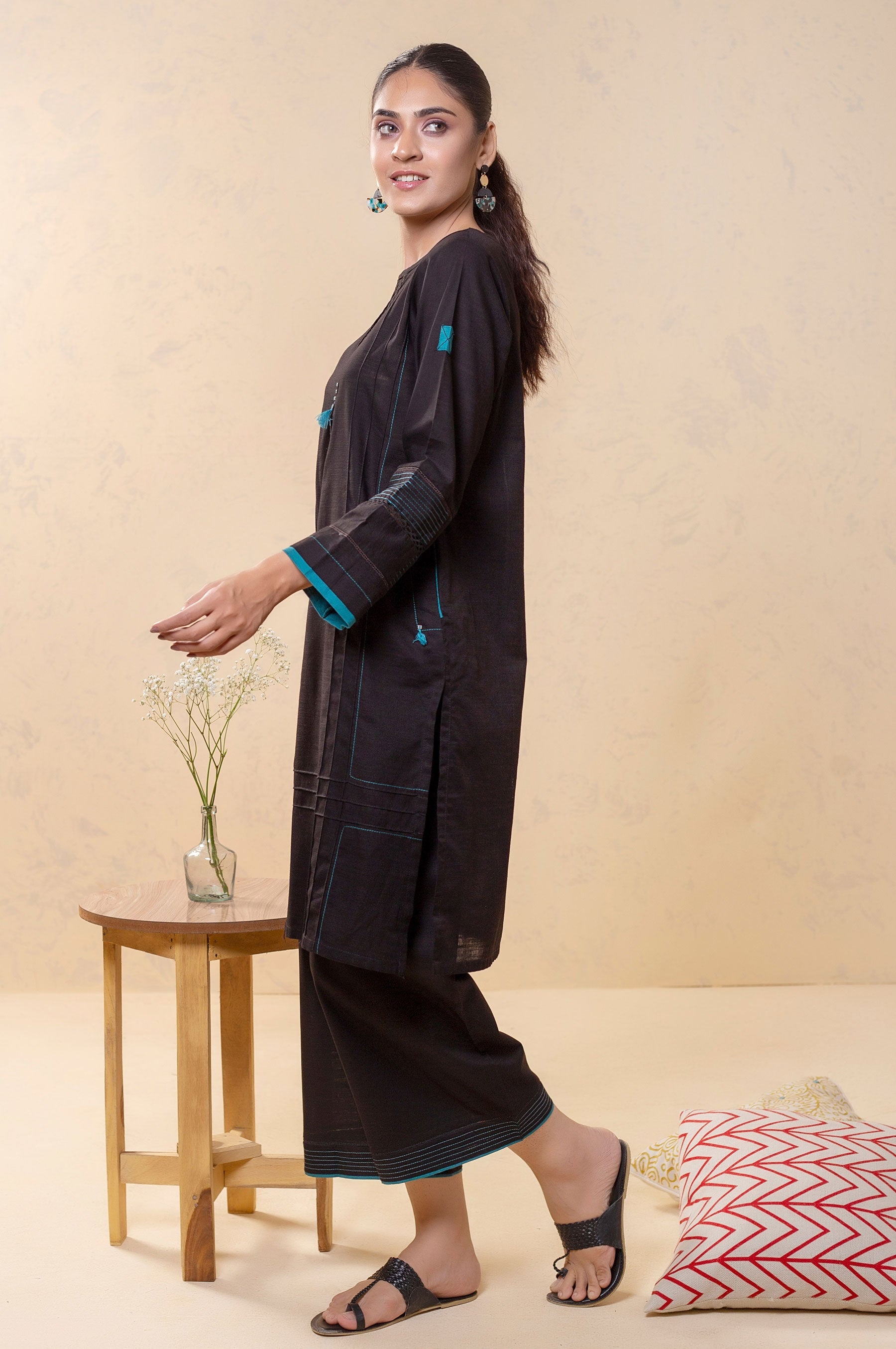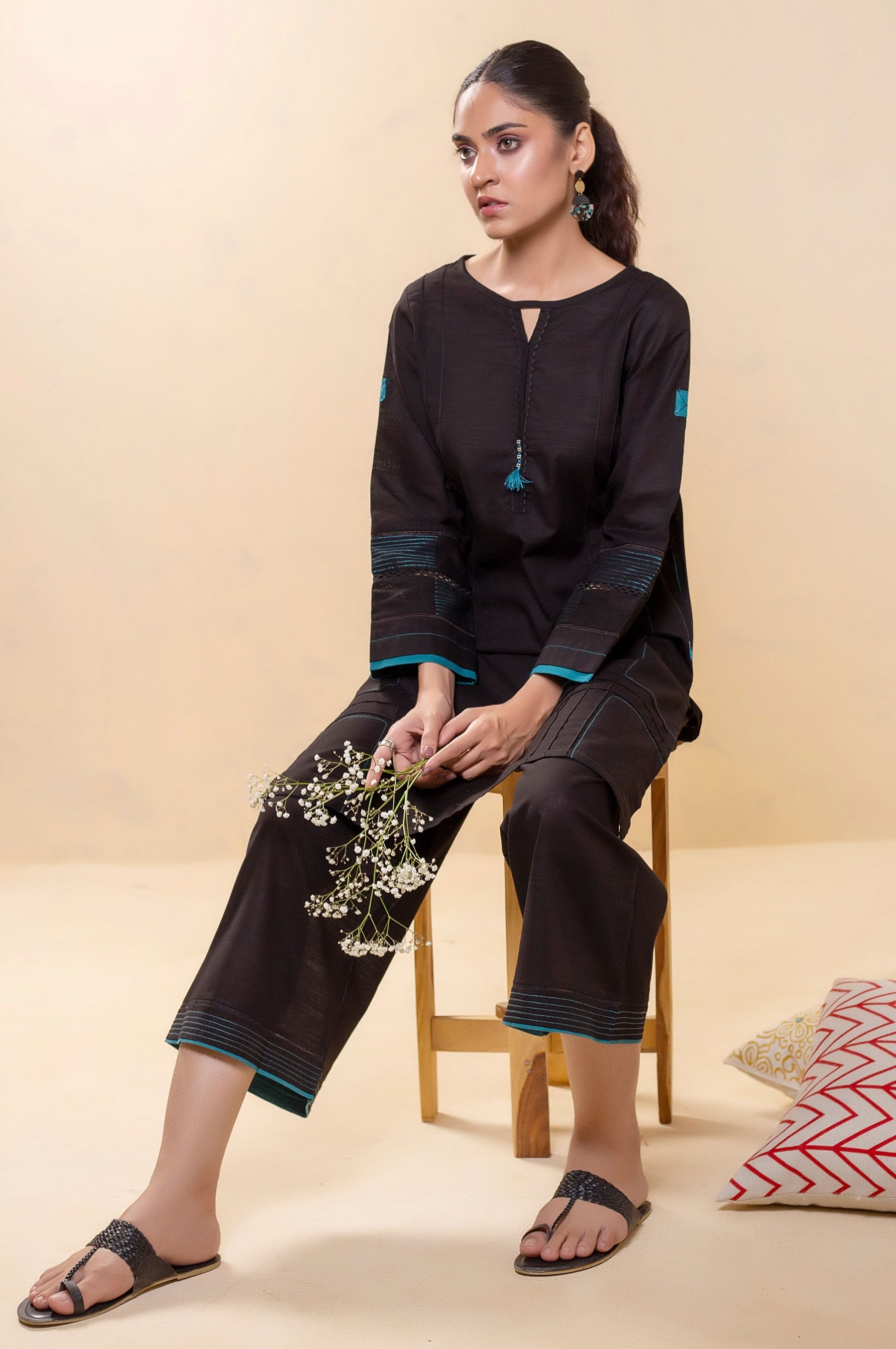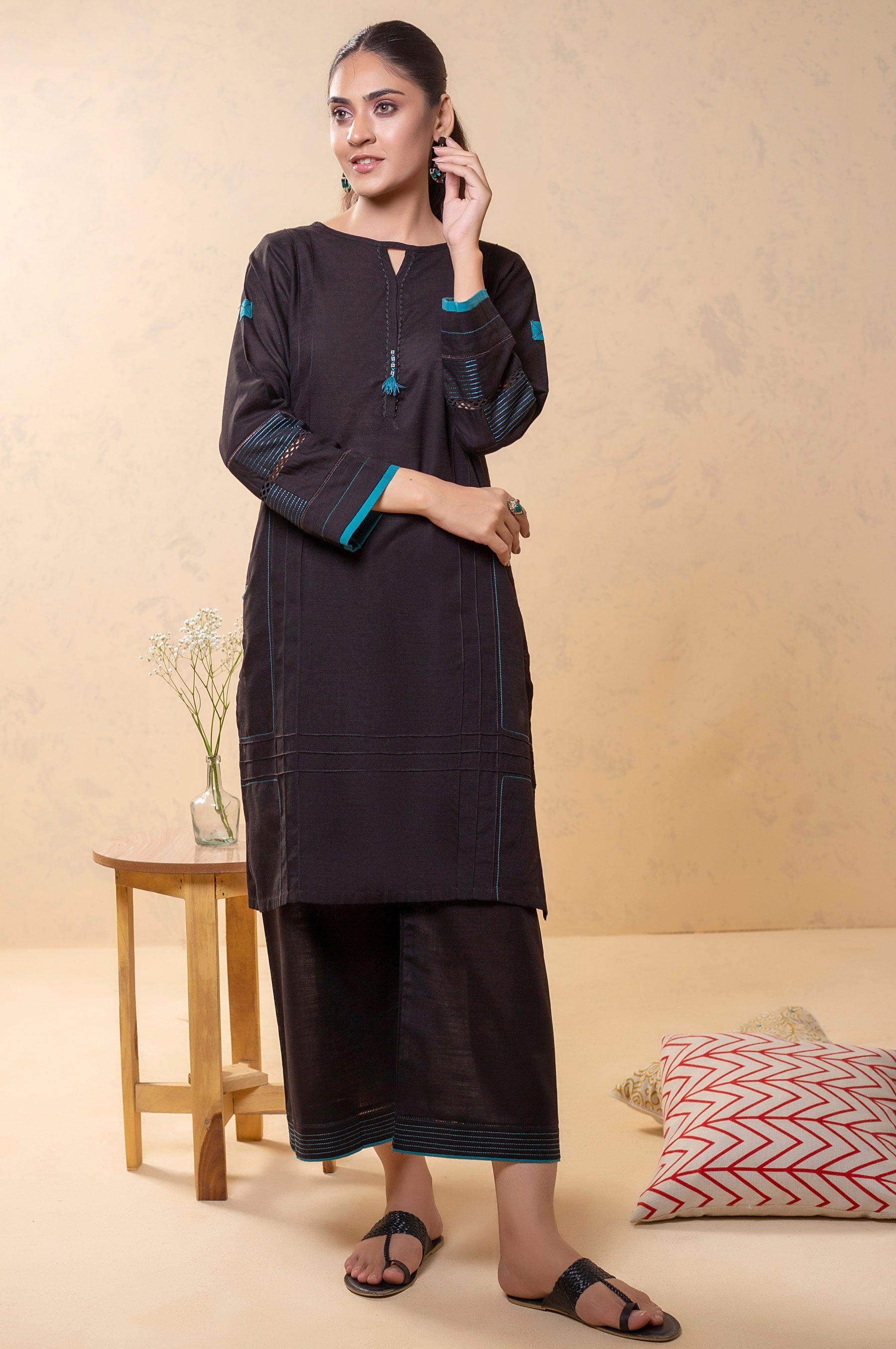 Simple fashion with perfect details ! it can be found in this black khaddar 2pc. Chic and elegant this khaddar co-ord set has stylized straight shirt and relaxed culottes, all over it has a hint of Teal.