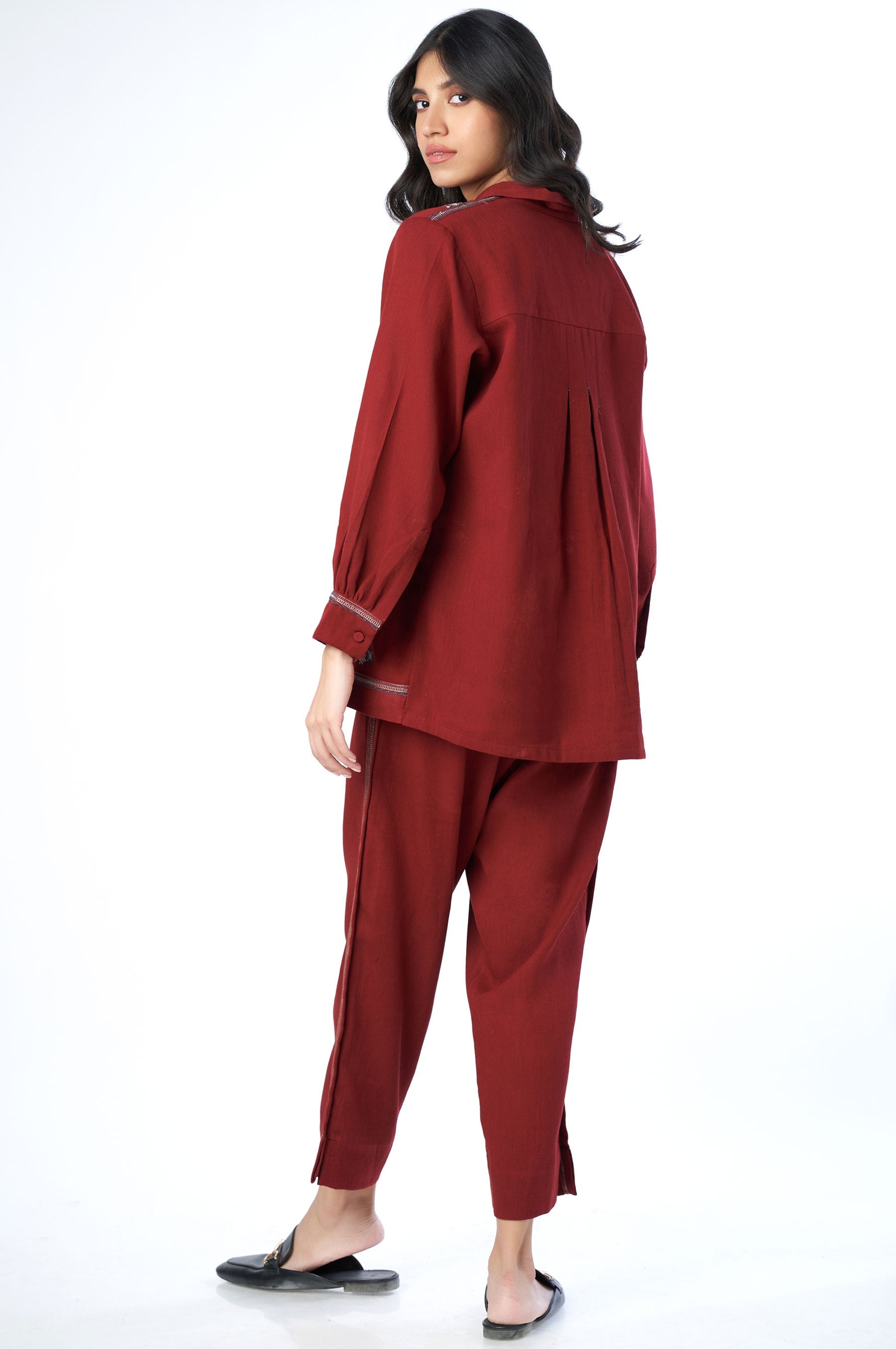 This chic yet elegant top composed with a trendy floral embroidery rendered in appealing red maroon shade, is sure to season favorite. This button down shirt comes with a matching embroidery trouser with side pocket and side slit which can be worn at any casual gathering and friends meet up.