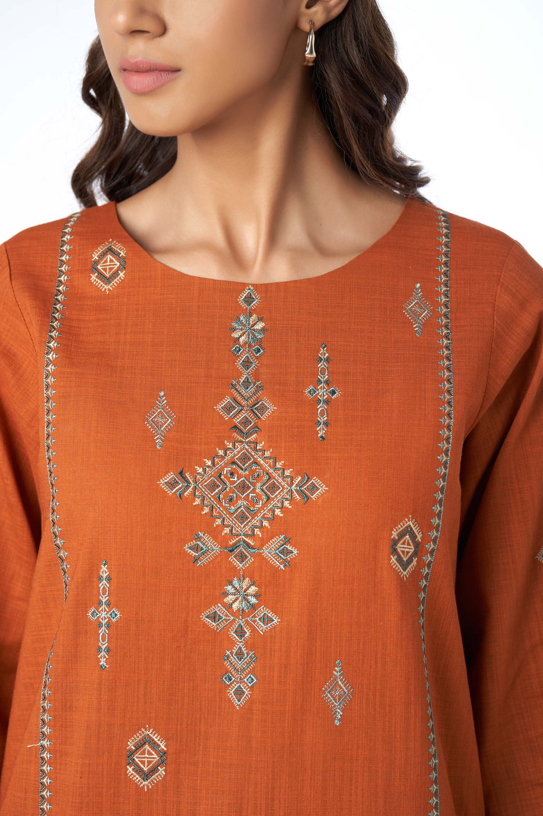 This cotton slub rust kurta is stunning essential for every season aufully composed with geometric pattern on the neckline and sleeves. The gorgeous outfit comes with a matching narrow shalwar with a minimal embroidery on the hem.
