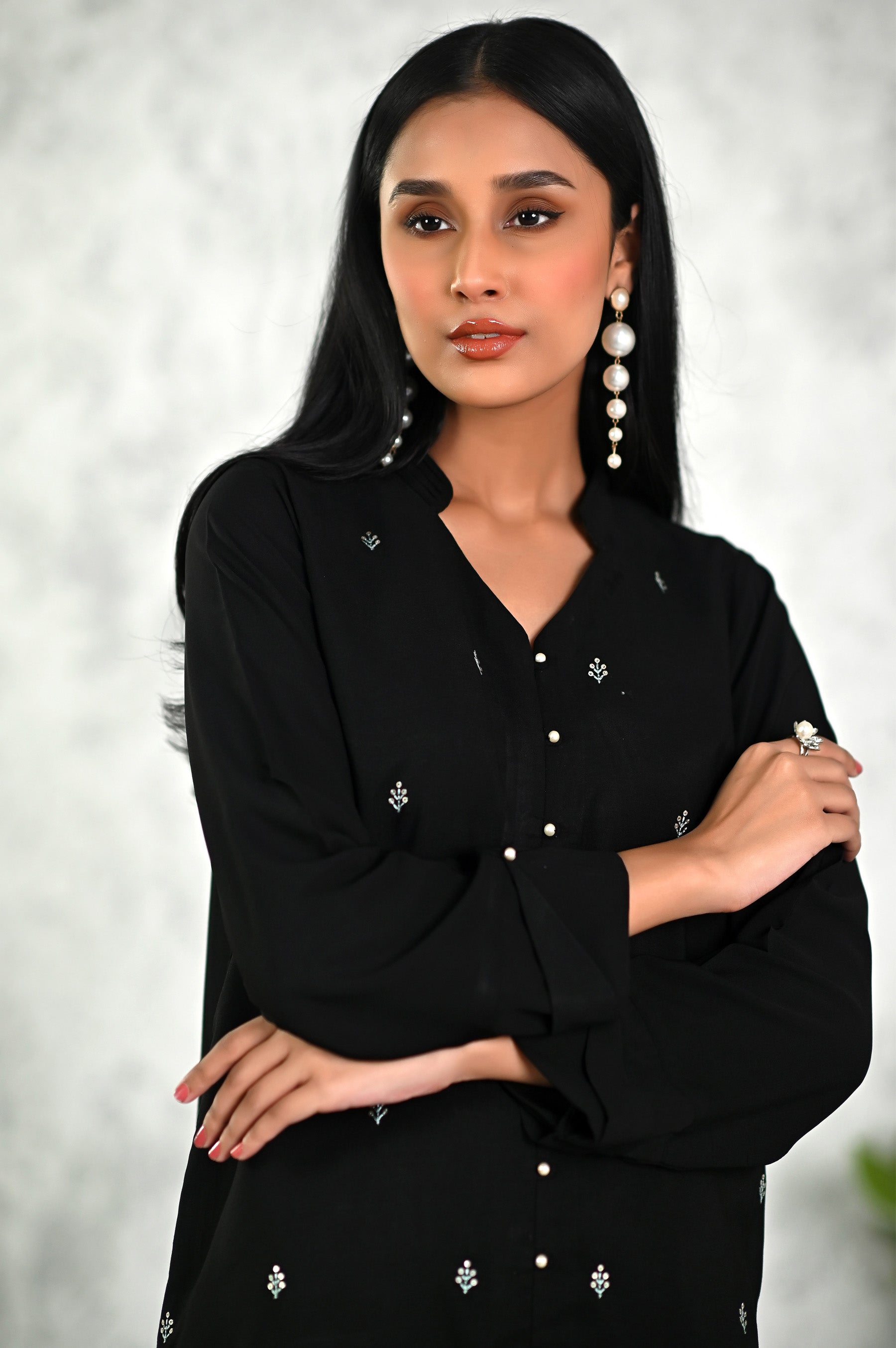 A solid 2 pcs chic crepe outfit elegantly enriched with sequins embroidery. Style this monochromatic look at an everyday event this season