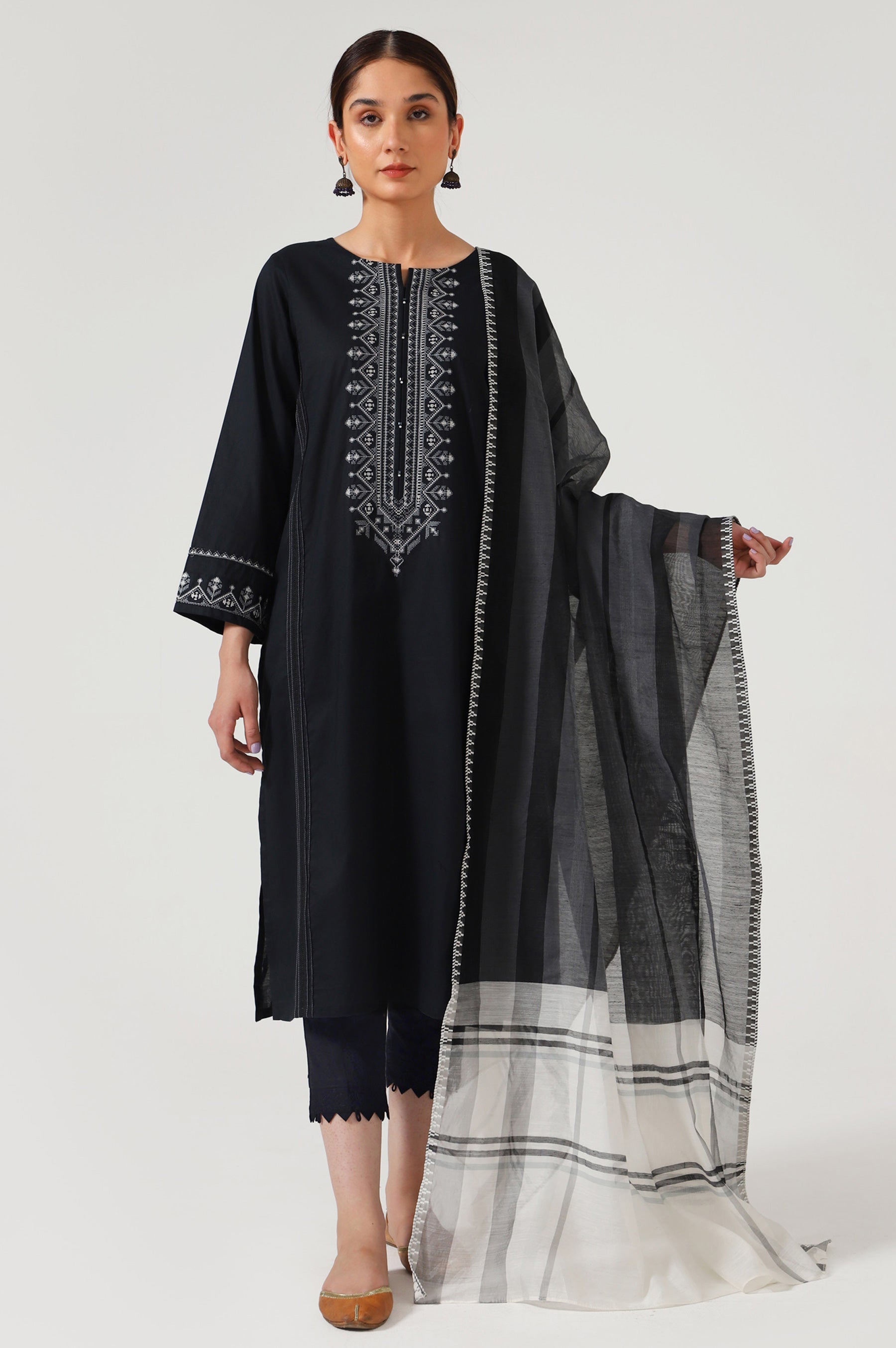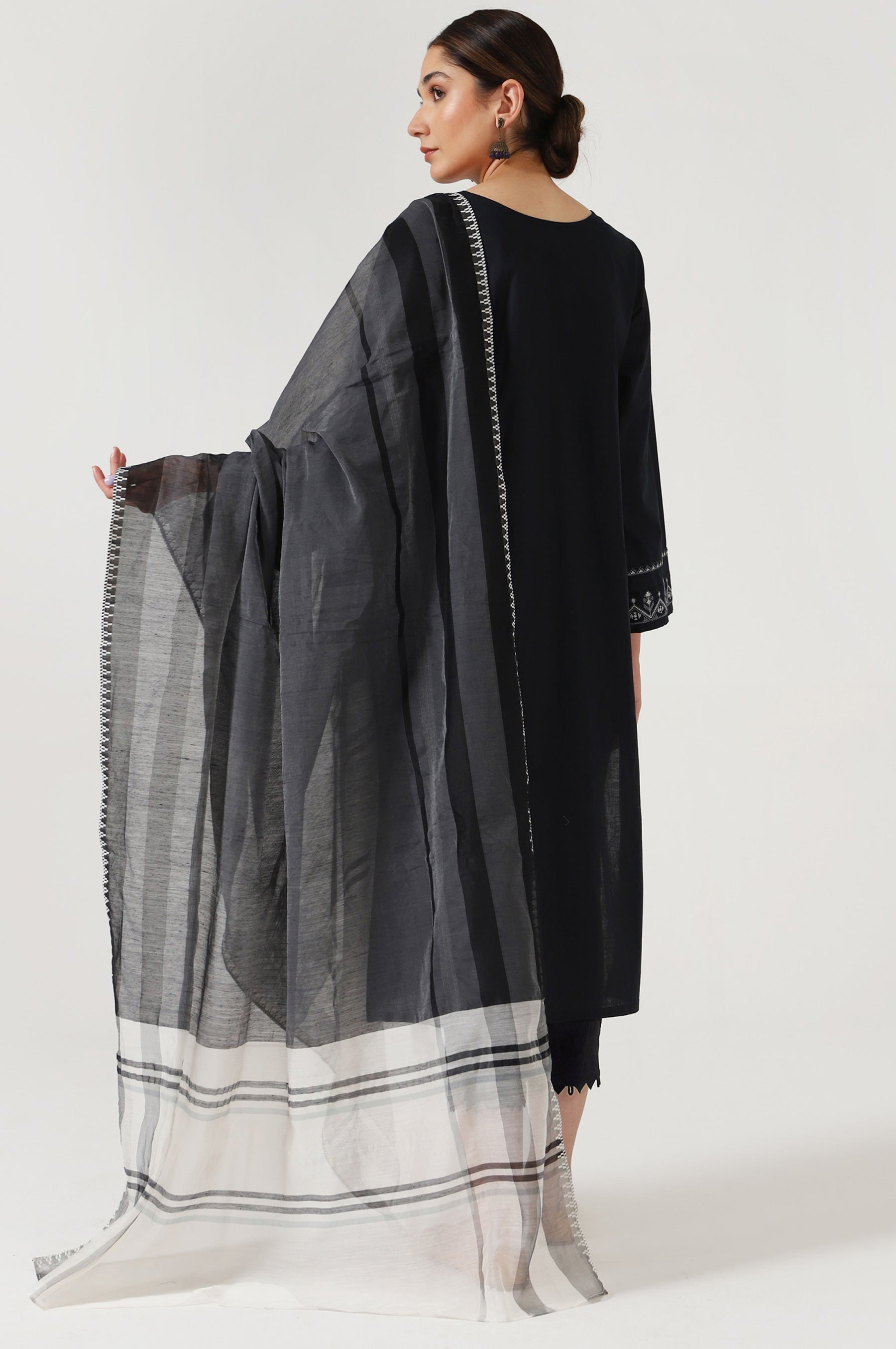 Elevate your wardrobe in this black cambric shirt featuring balck and white cross stitch embroidery on the neckline.This beautiful shirt comes with a striped jacquard dupatta that can be worn season after season.