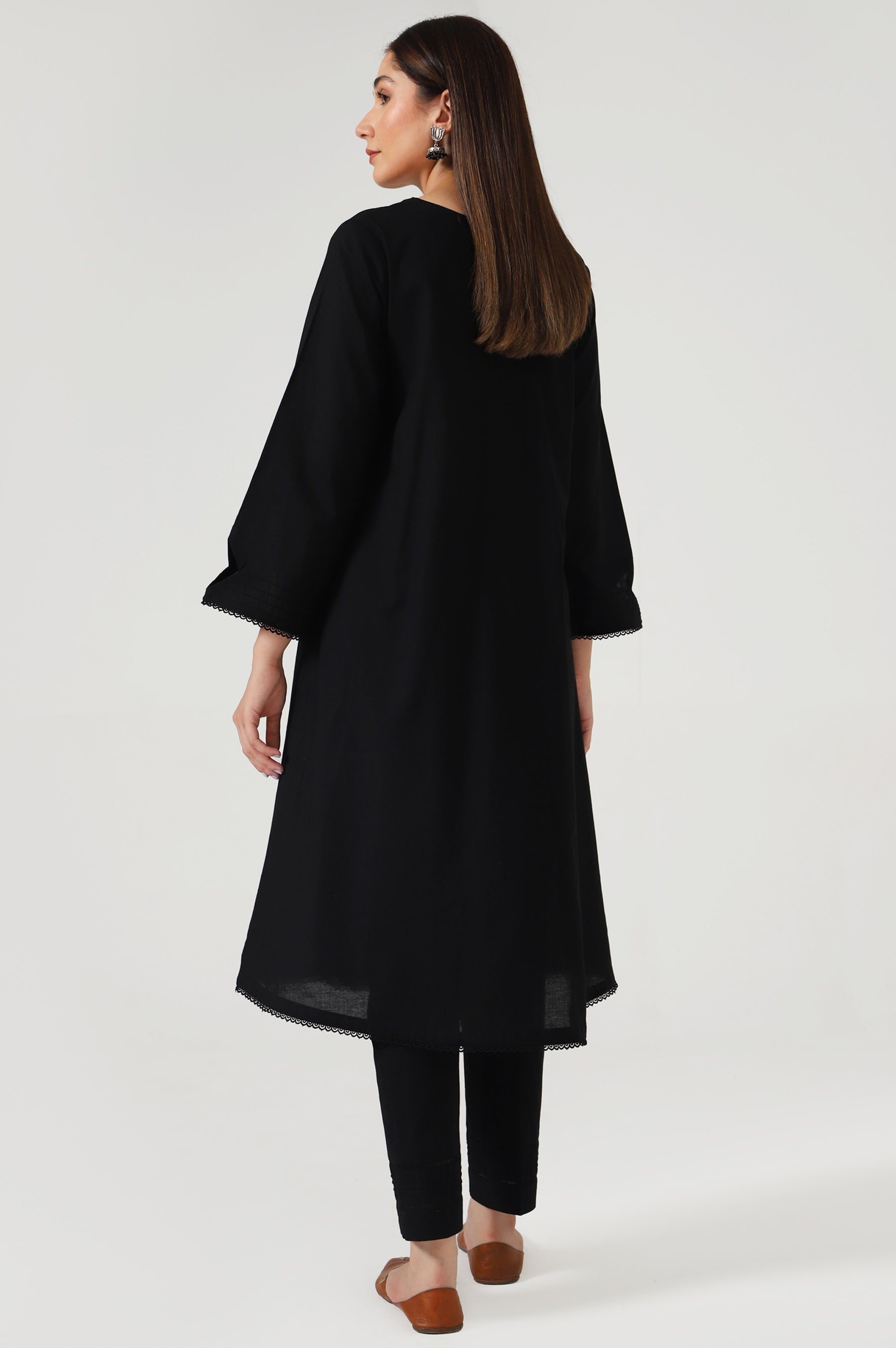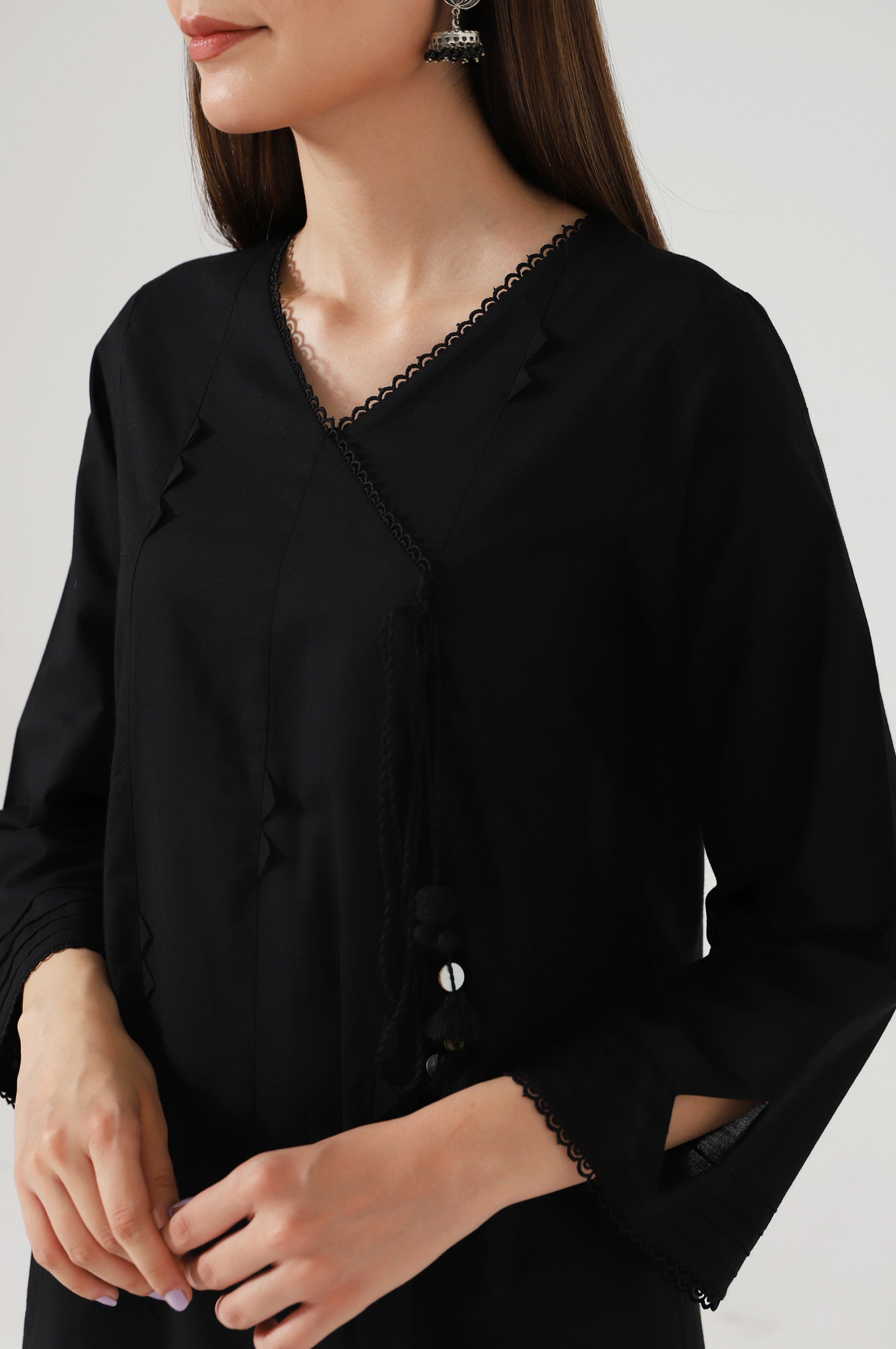 An elegant ensemble rendered in classic black shade. It is gracefully crafted in a beautifully flowing angarkha with impressive stich details. Ornamented with unique tassel at front. Paired with cordinated black pant with laces. Style this outfit at casual gatherings this season.