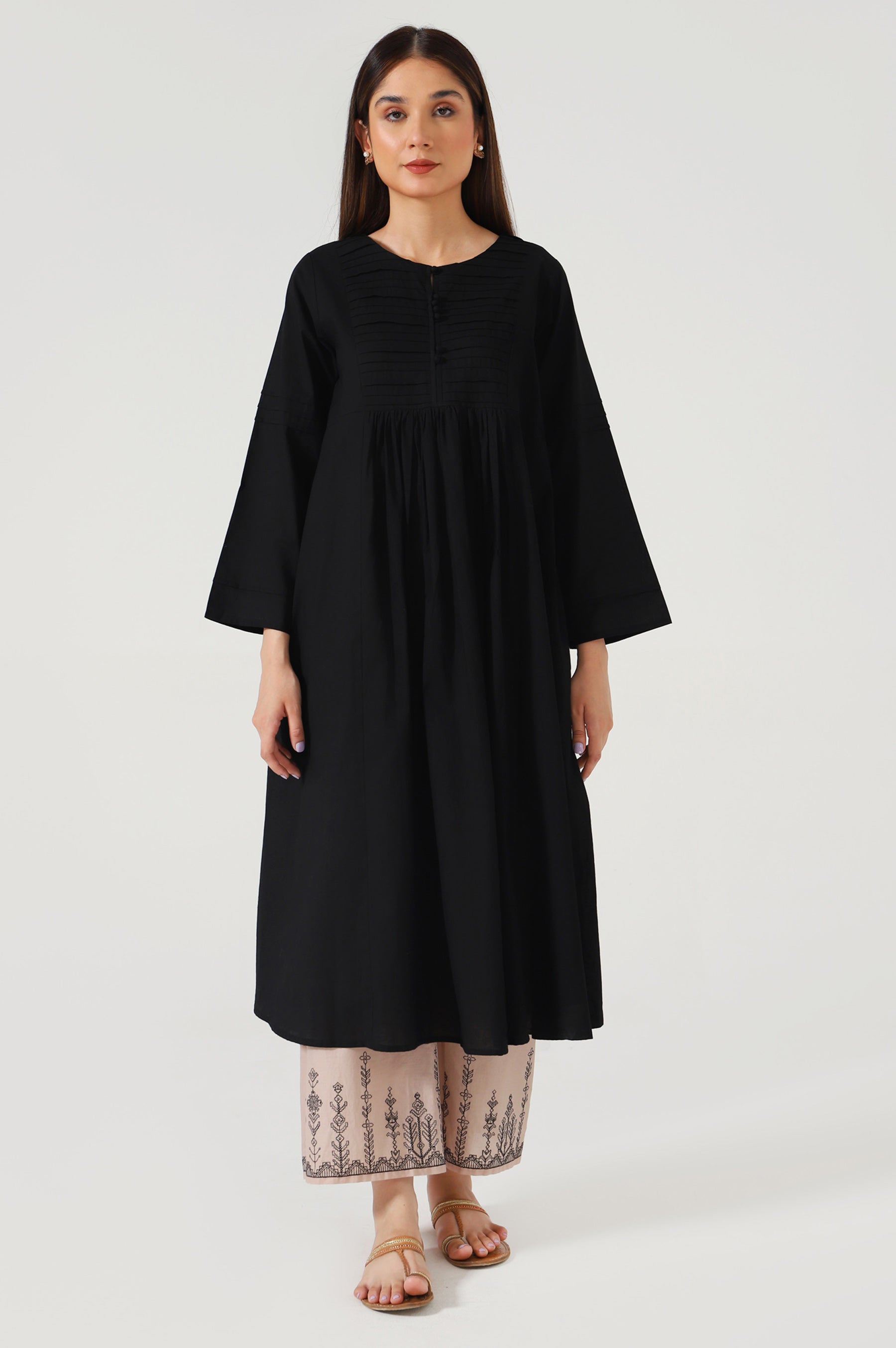 Perfect for laid back summer weekands.This black A line kurta is crafted from cambric and accentuated with a delicate pleat detailing on the neckline along with minimal gathers.This effortless style is sure to become a wardrobe fav.Team yours with our crafted beige embroidered izaar for an easy carefree day a head.