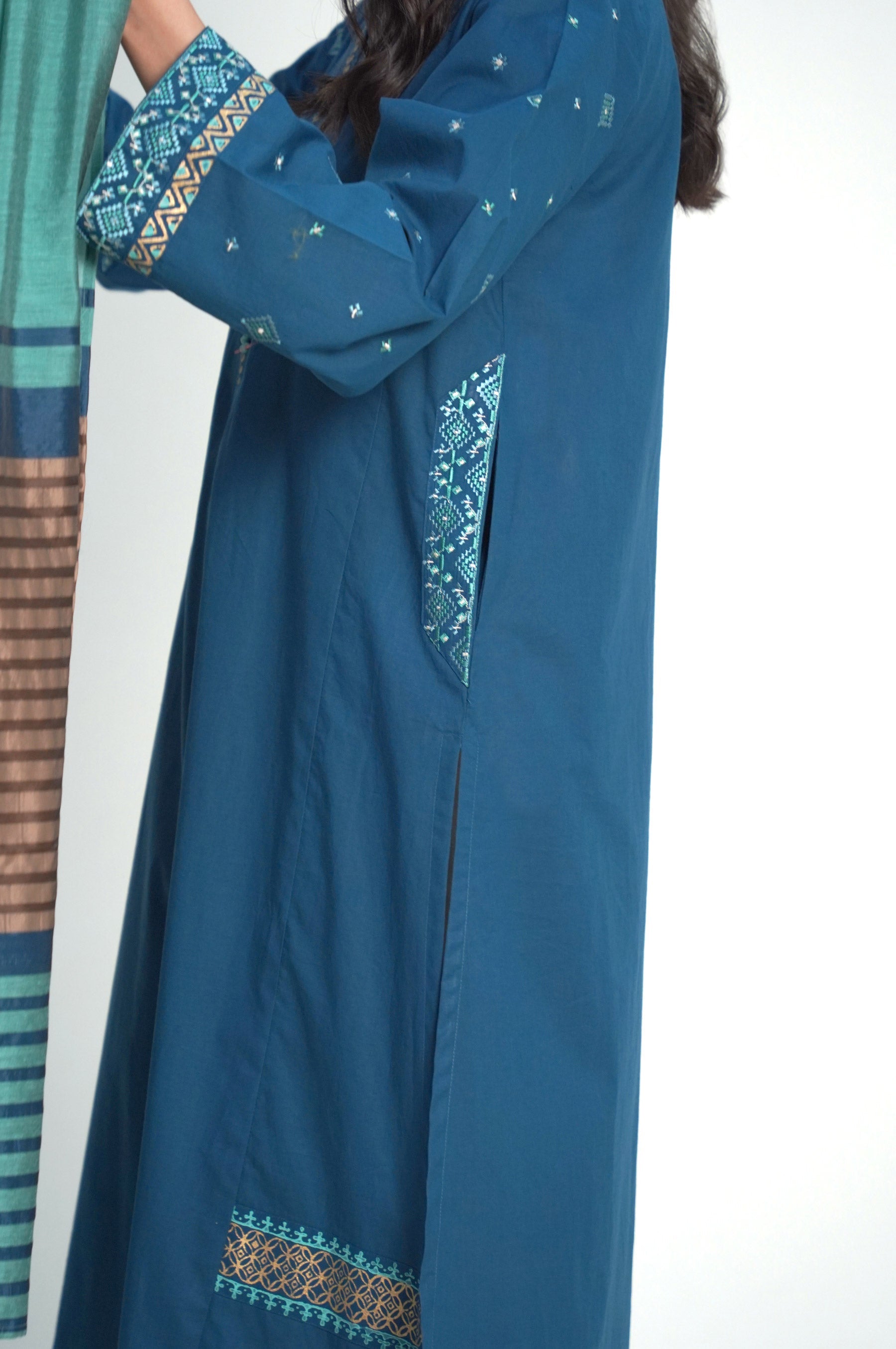 The outfit comprises of sensational block print and embroidery, beautifully adorned with woven stripe dupatta. Block print added on the placket and hem line with exquisite contrasting embroidery on sleeves and pocket. Perfect for any gathering to look gorgeous exceptionally