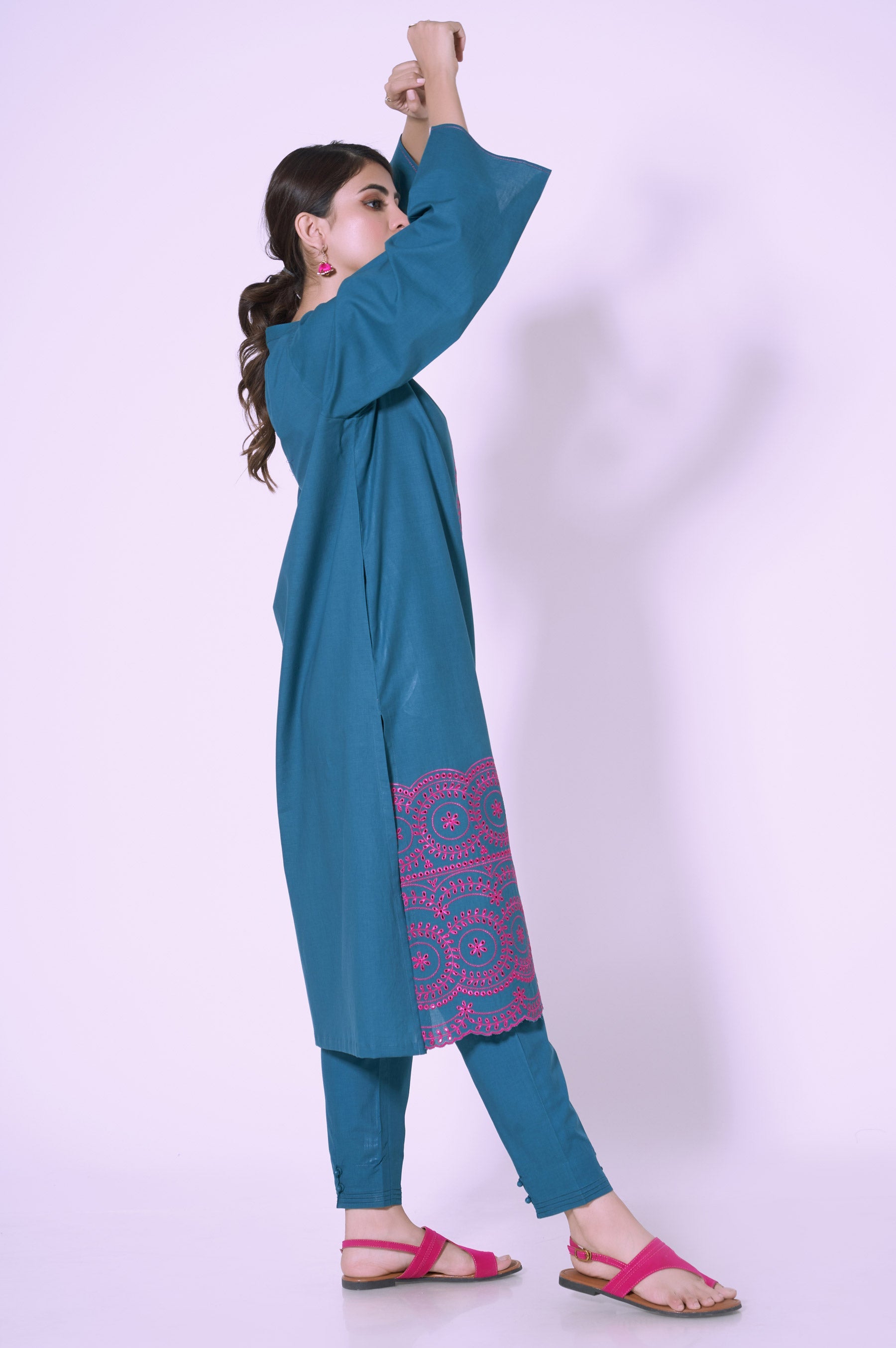 Co-ord sets are the new trend.Be sure to be on trend at any event with this teal shirt inspired from eyelets embroidery highlighted with pop color shade of pink.This gorgeous outfit comes with a matching pants which offers both comfort and style.