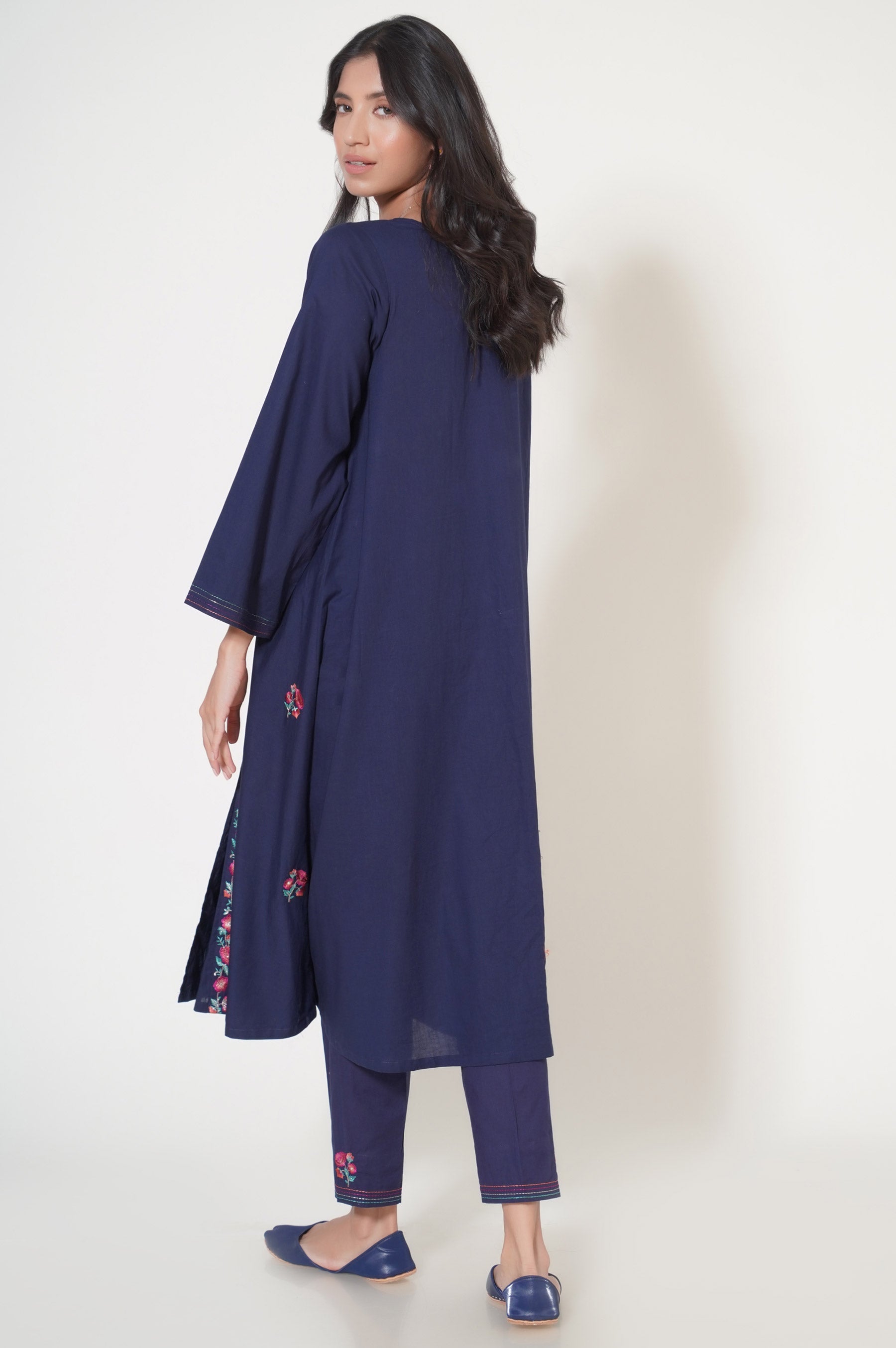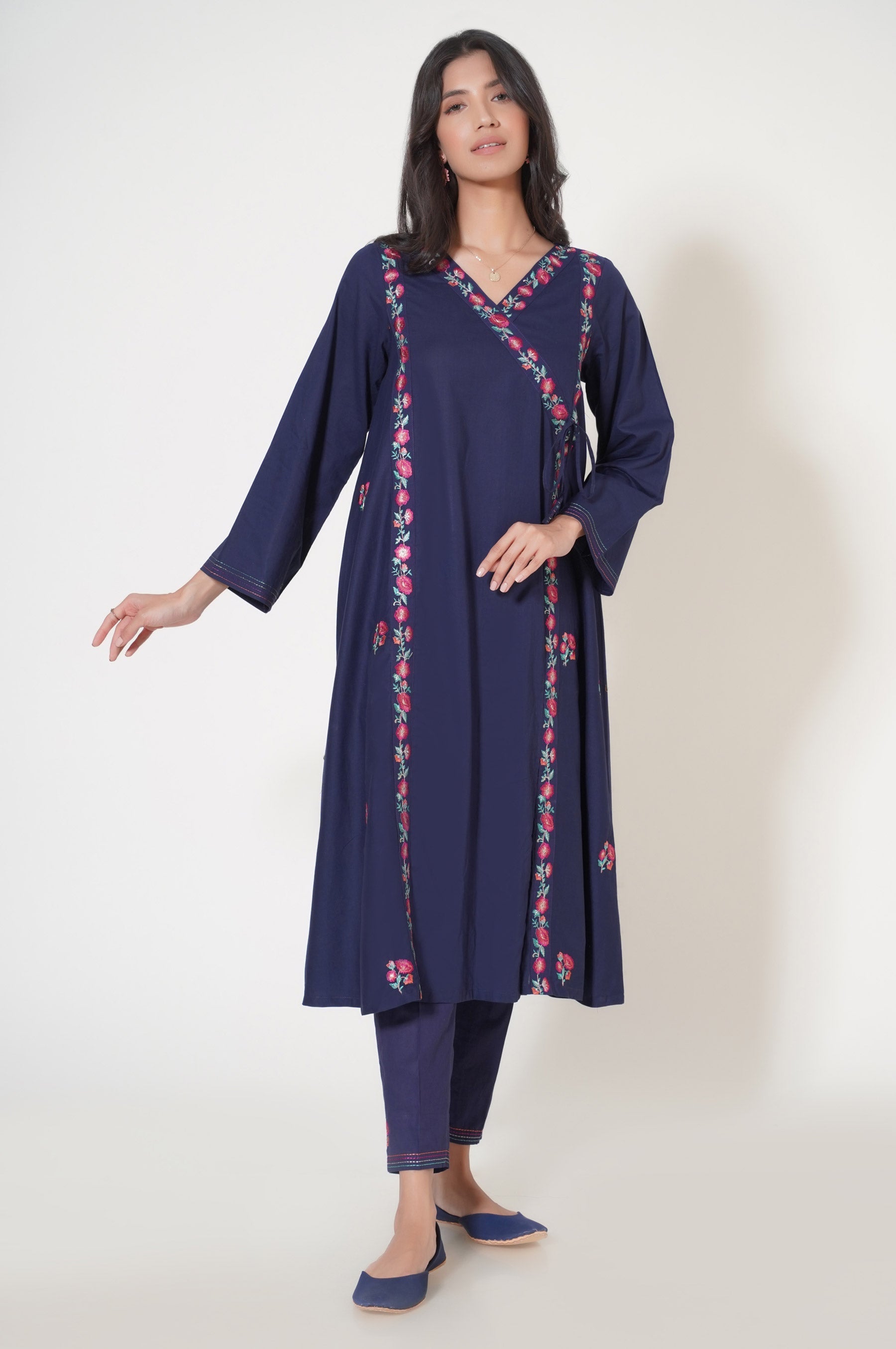 This pretty attire composed in A-line angrakha layout cut including contrasting pink and orange floral embroidery on front and side panel. Paired with embroidered pant to complete the graceful look.
