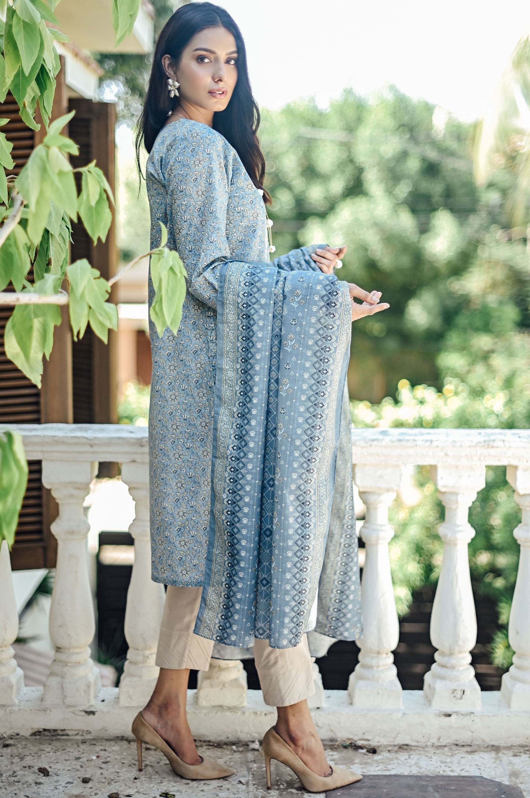 Printed Cottel Shirt with Embroidered Neckline, Printed Khaddar Dupatta, Beads & Pearls for Embellishment.