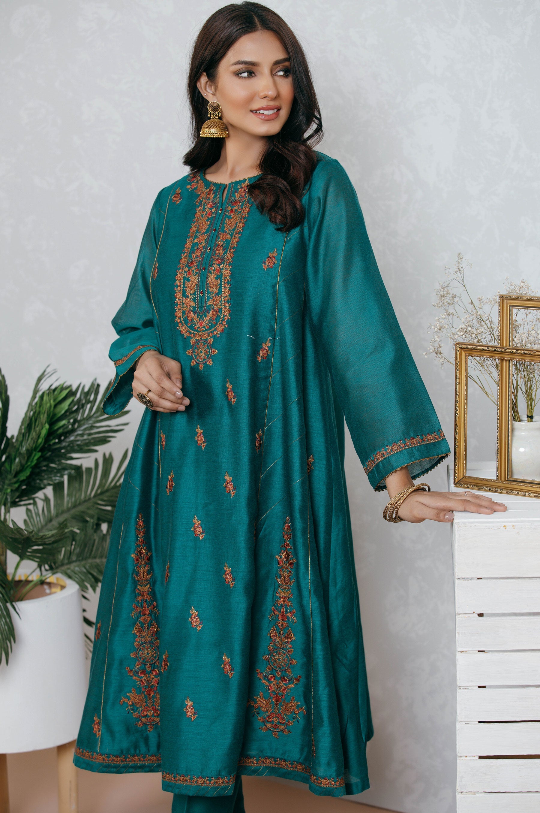 A graceful a-line cotton net 2pc outfit with delicate embroidery on front and pants, portraying an attractive composition. Style this outfit to a family gathering in this festive season.