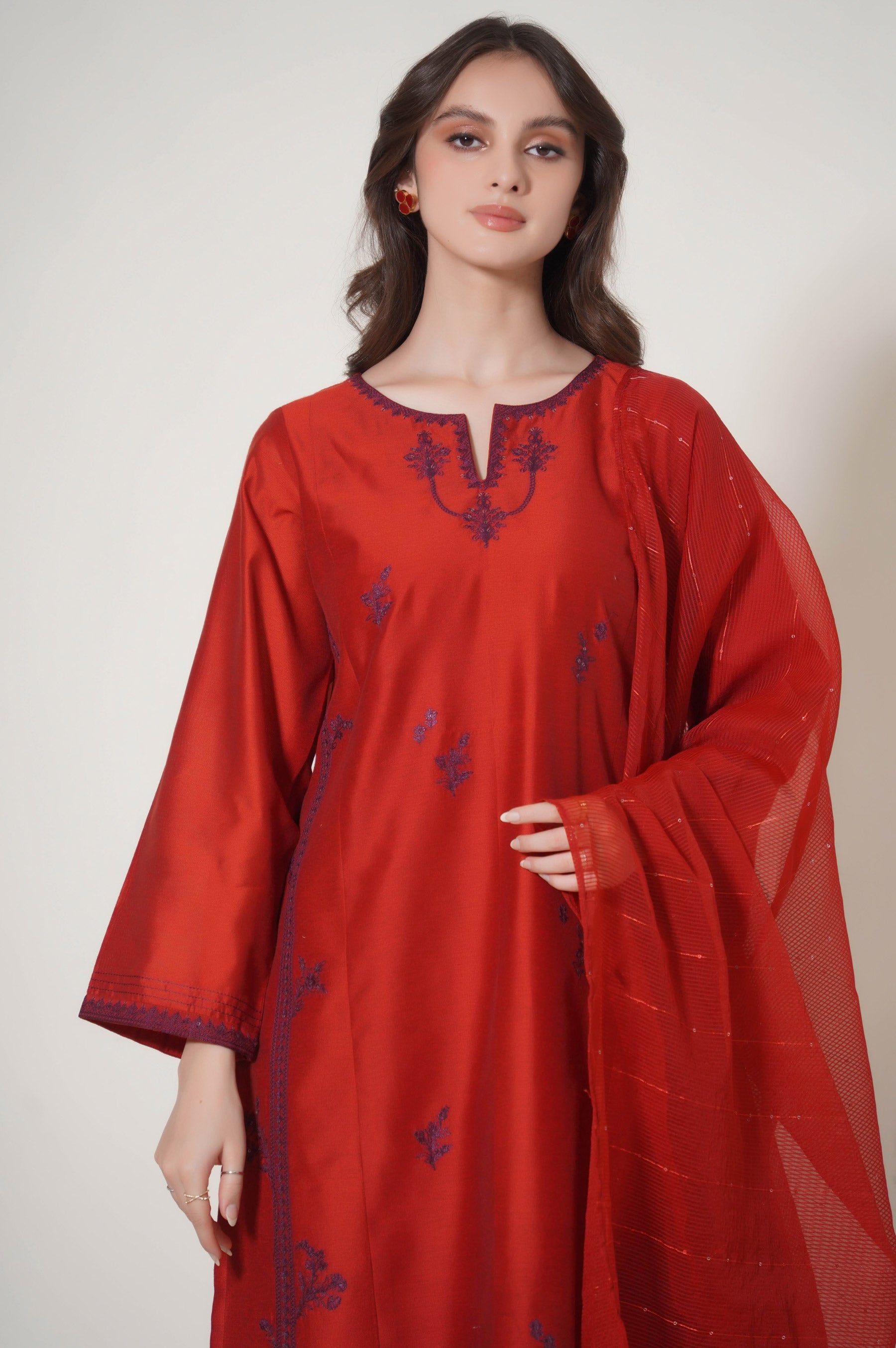 "A classic composition is layered over this attractive red embroidered shirt, featuring a delicate embroidery all over the front, Paired with sequins dupatta. , this outfit is a style statement to embrace at formal events."