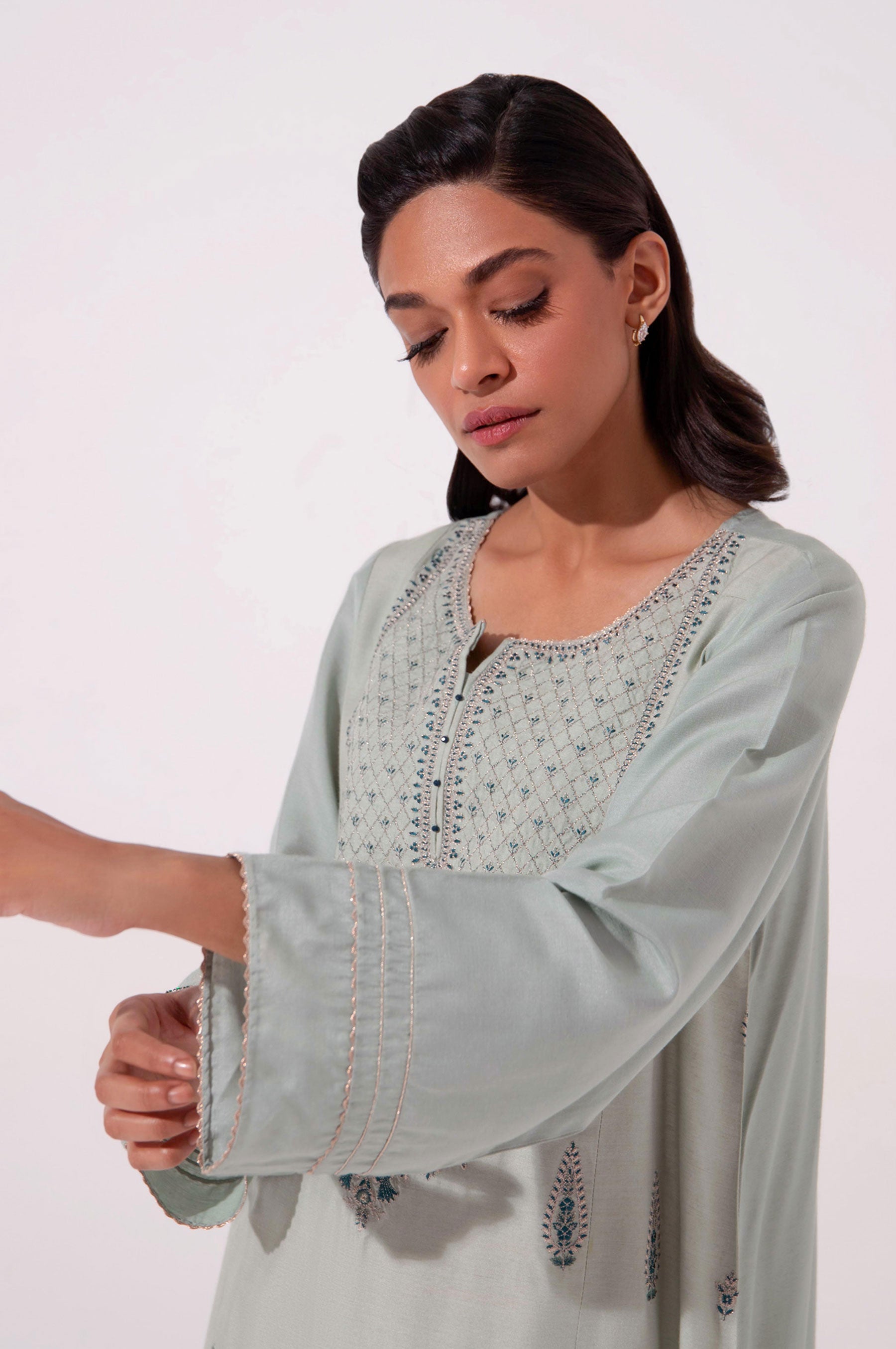Elegant and sophisticated, this softest shade of blue and white two pieces ensemble in A-line cut adorned with delicate embroidery on shirt. Paired with classically embroidered cullote pant, this heavenly outfit is an ideal option for fashion forward women.