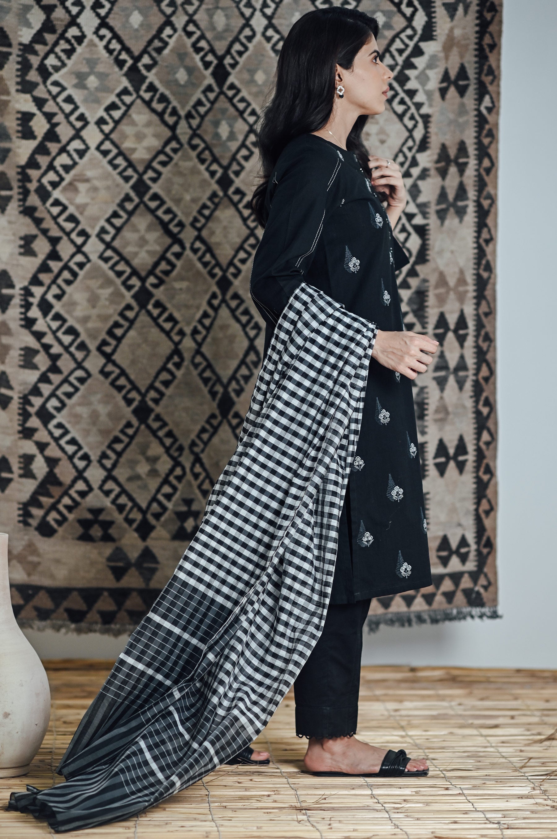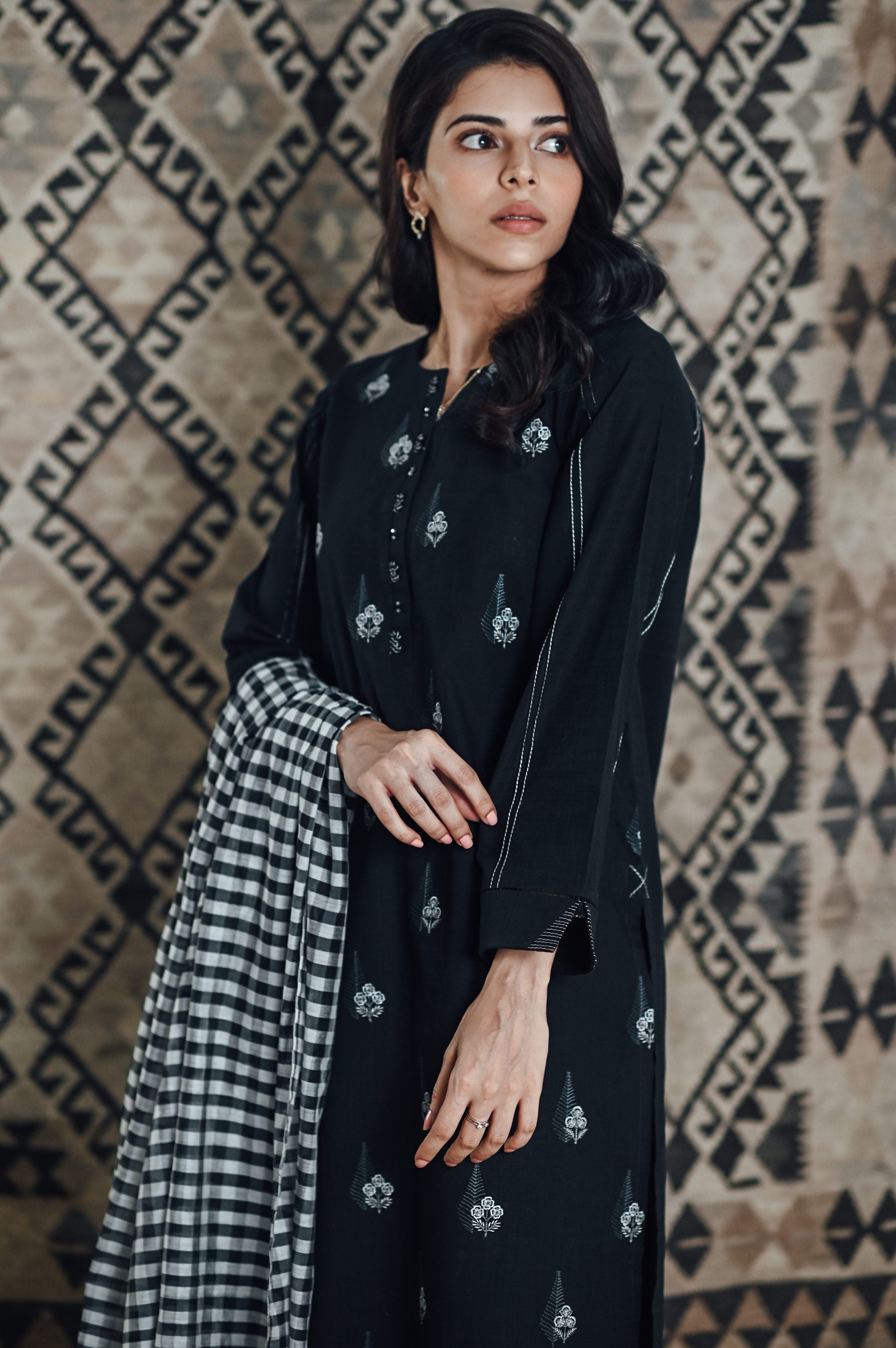 This charismatic black ensemble is timeless with it's embroidered motifs all over in colors such as grey and white, paired with checkered dupatta and embellished to perfection for you. you can pair it with Zeen's embroidered or any basic Bottoms.