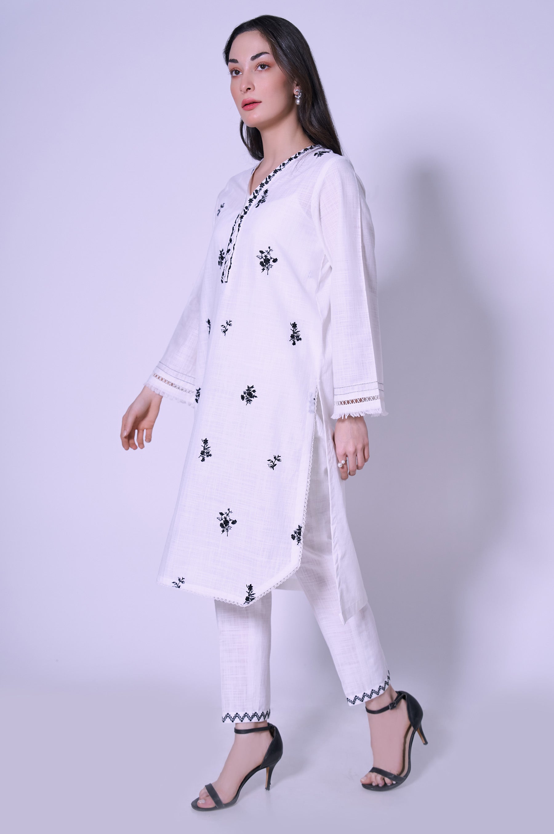 White slub designed beautifully for summer season. It consists of all over embroidery in the front along with chic embroidered buttons on the placket. Bottoms include chevron embroidery on bottoms hem