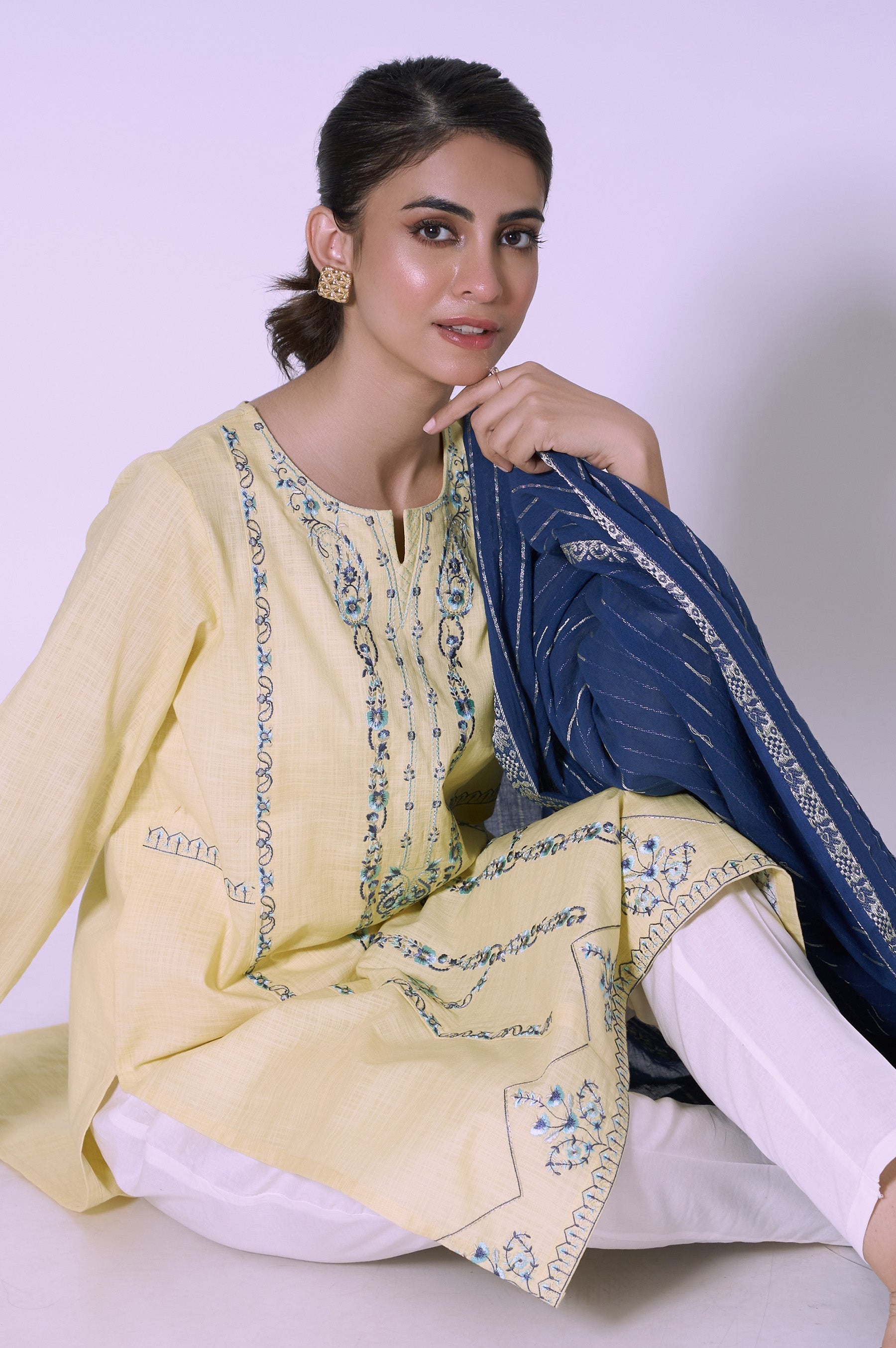This outfit comprises of lemon color with beautiful layout embroidery. Paired with contrasting blue dupatta,this outfit is perfect