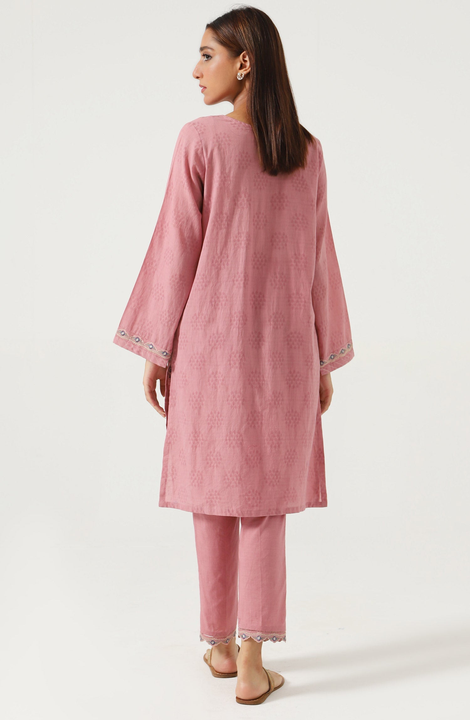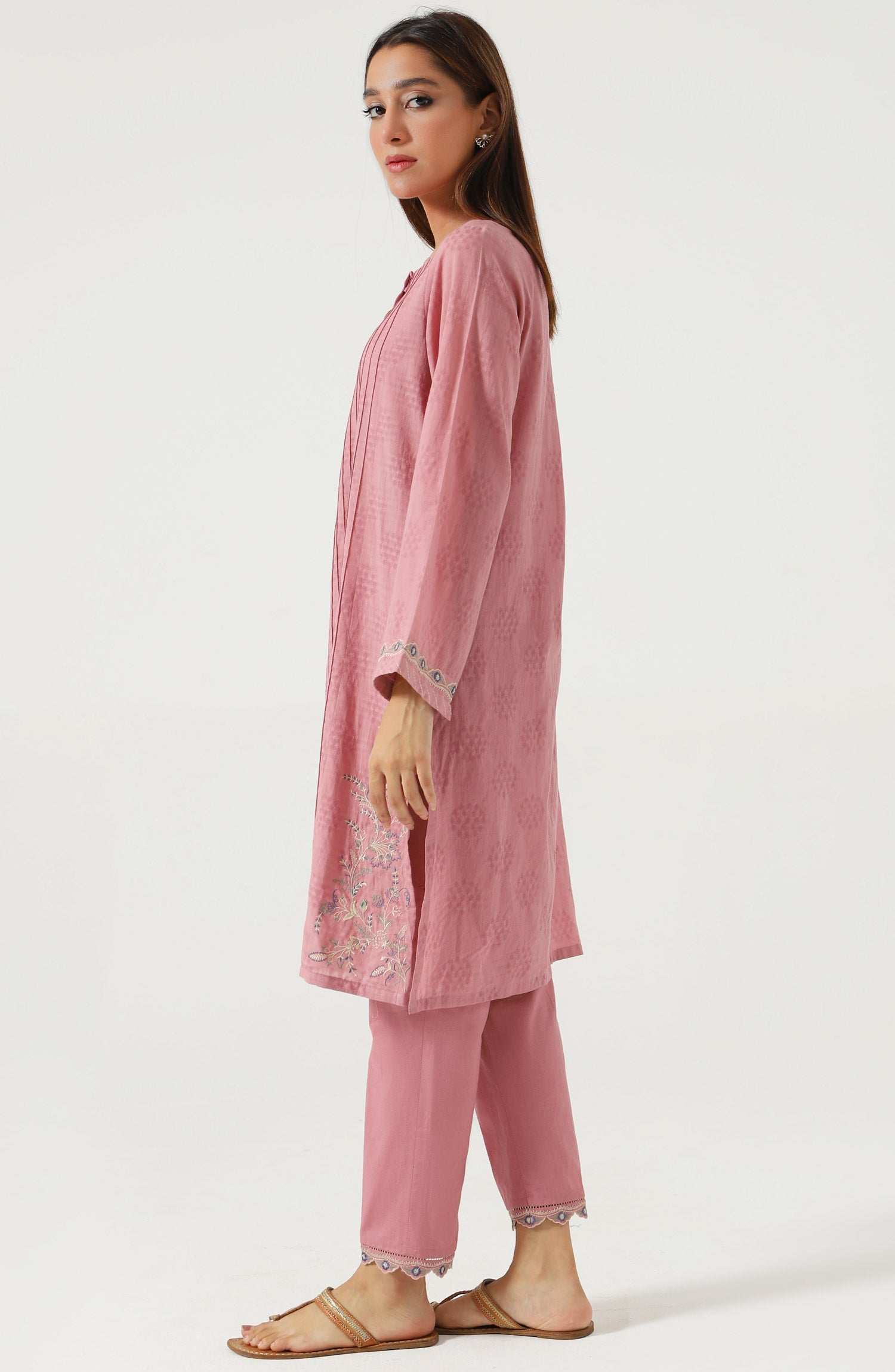 This Mauve color jacquard co-ord set with floral embroidery inspired by mughal era. It has delicate scalloped neckline detail with pintex. It is paired with matching cambric bottom with embroidery.