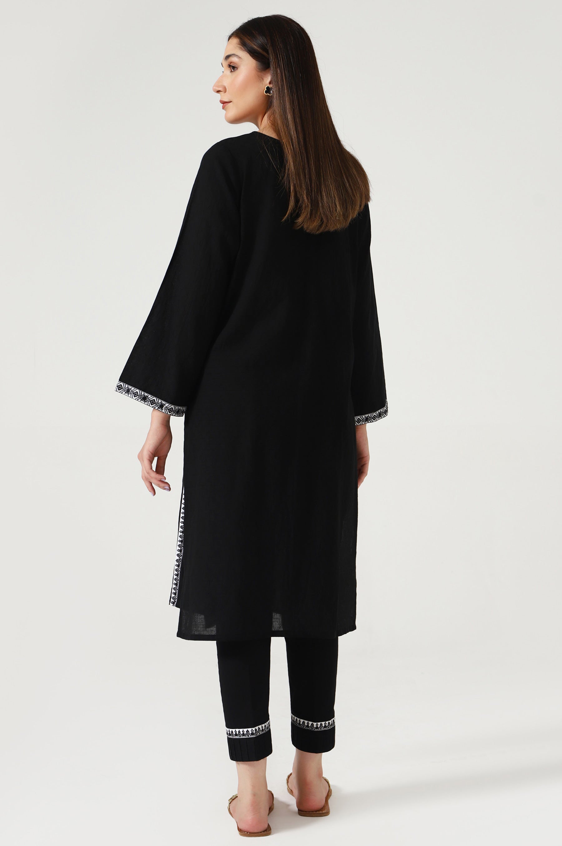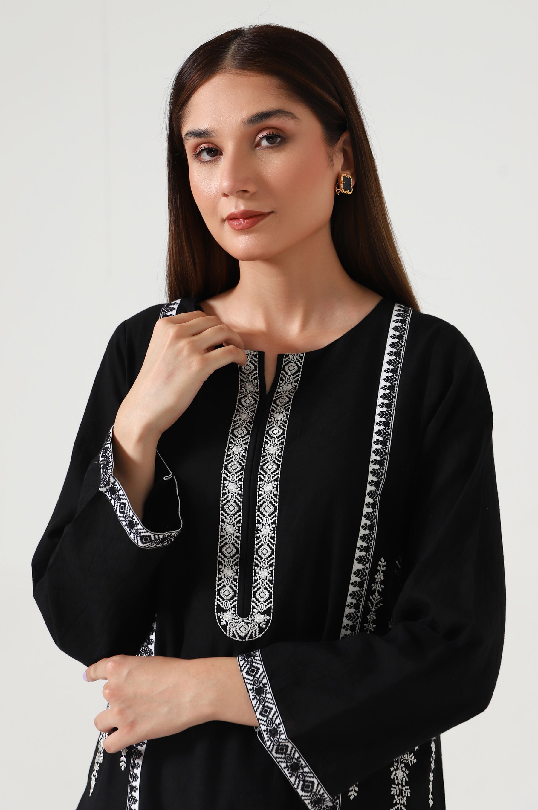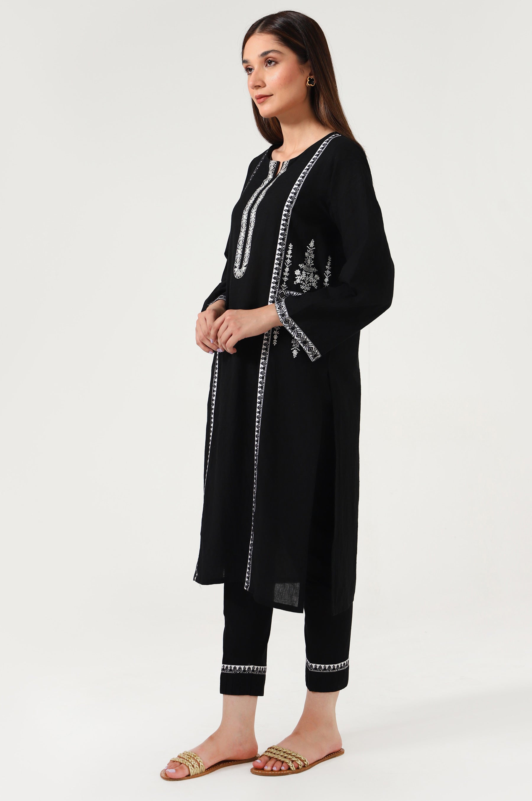 Turn heads in this striking Co-ord set. This black doria shirt manifest elegance and subtle sophistication. The white color pops of embroidered floral and geometric patterns gives depth to the ensemble. This artistically rich shirt is a great addition to your everyday wardrobe.