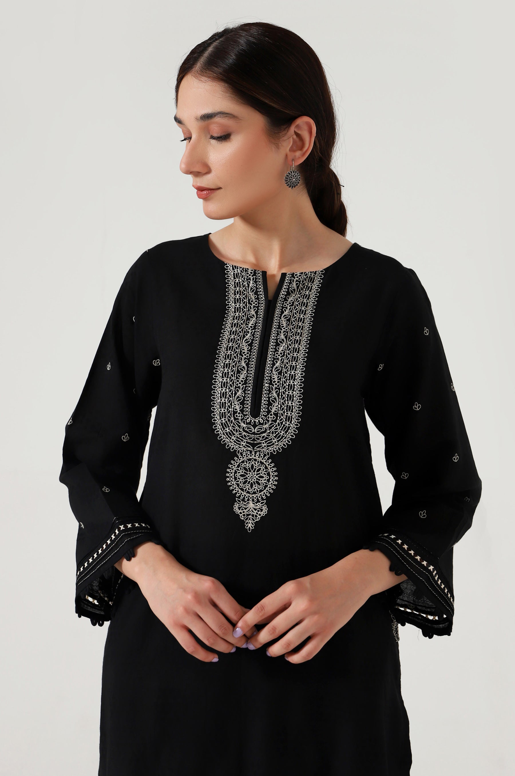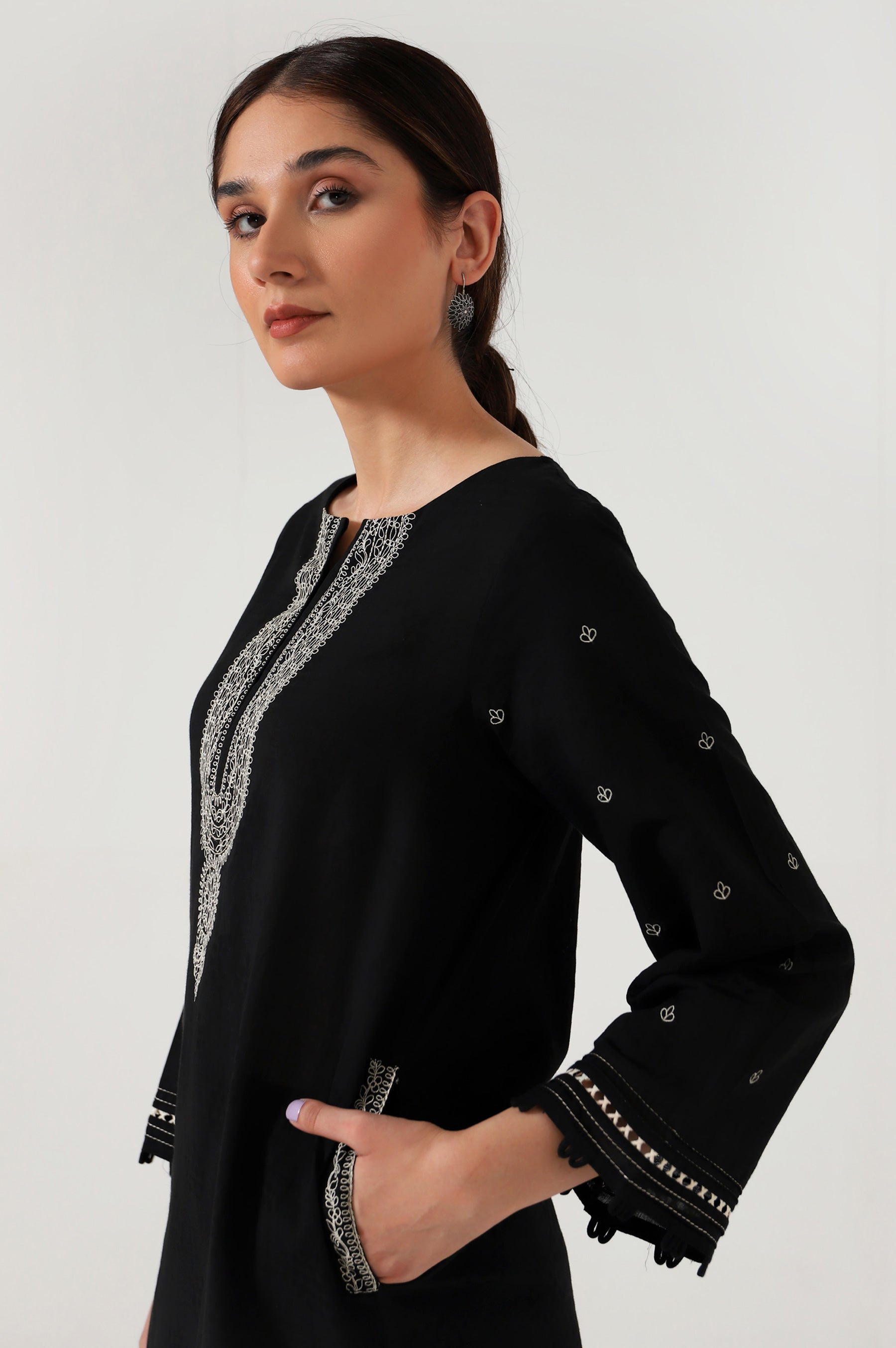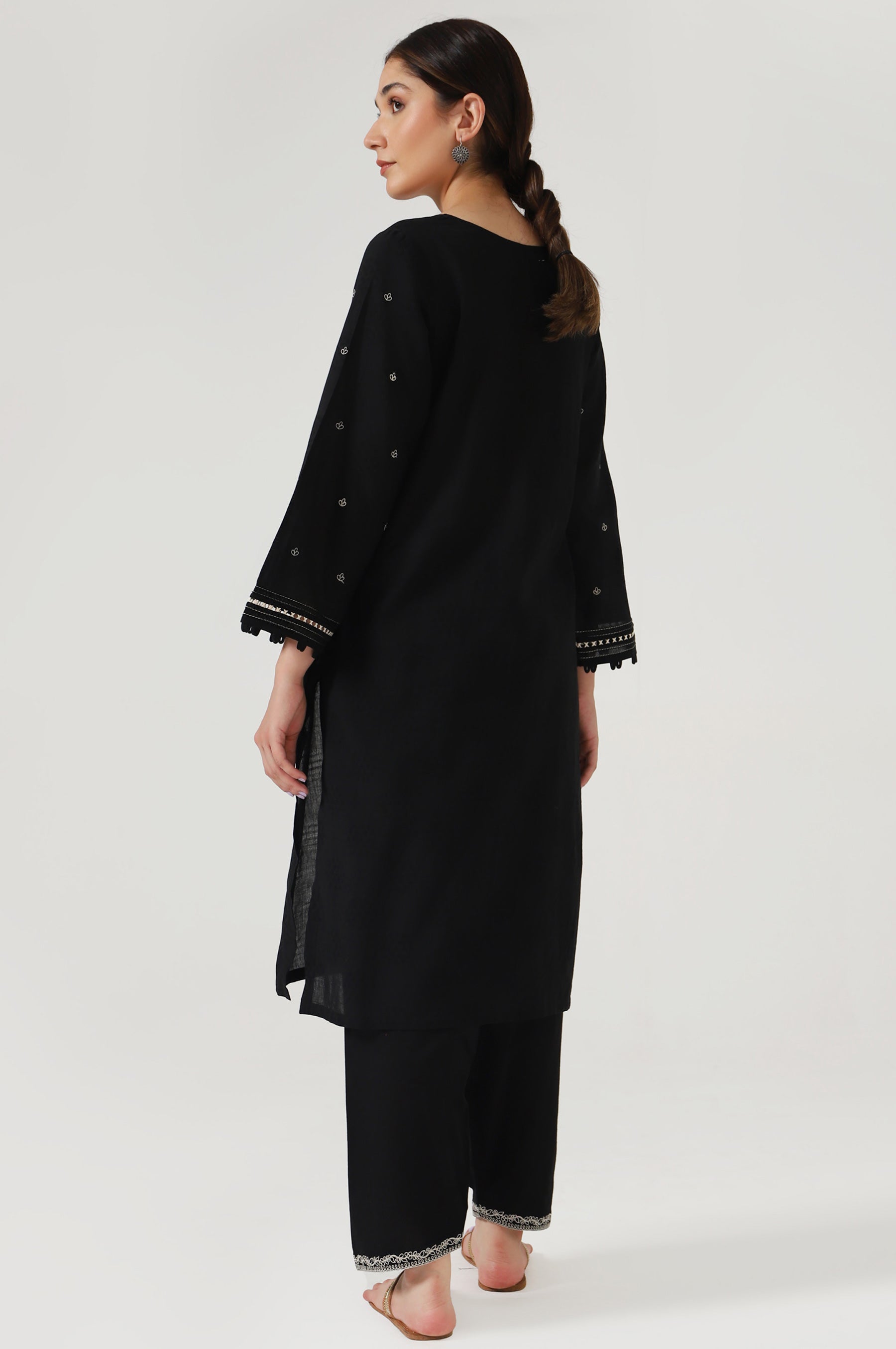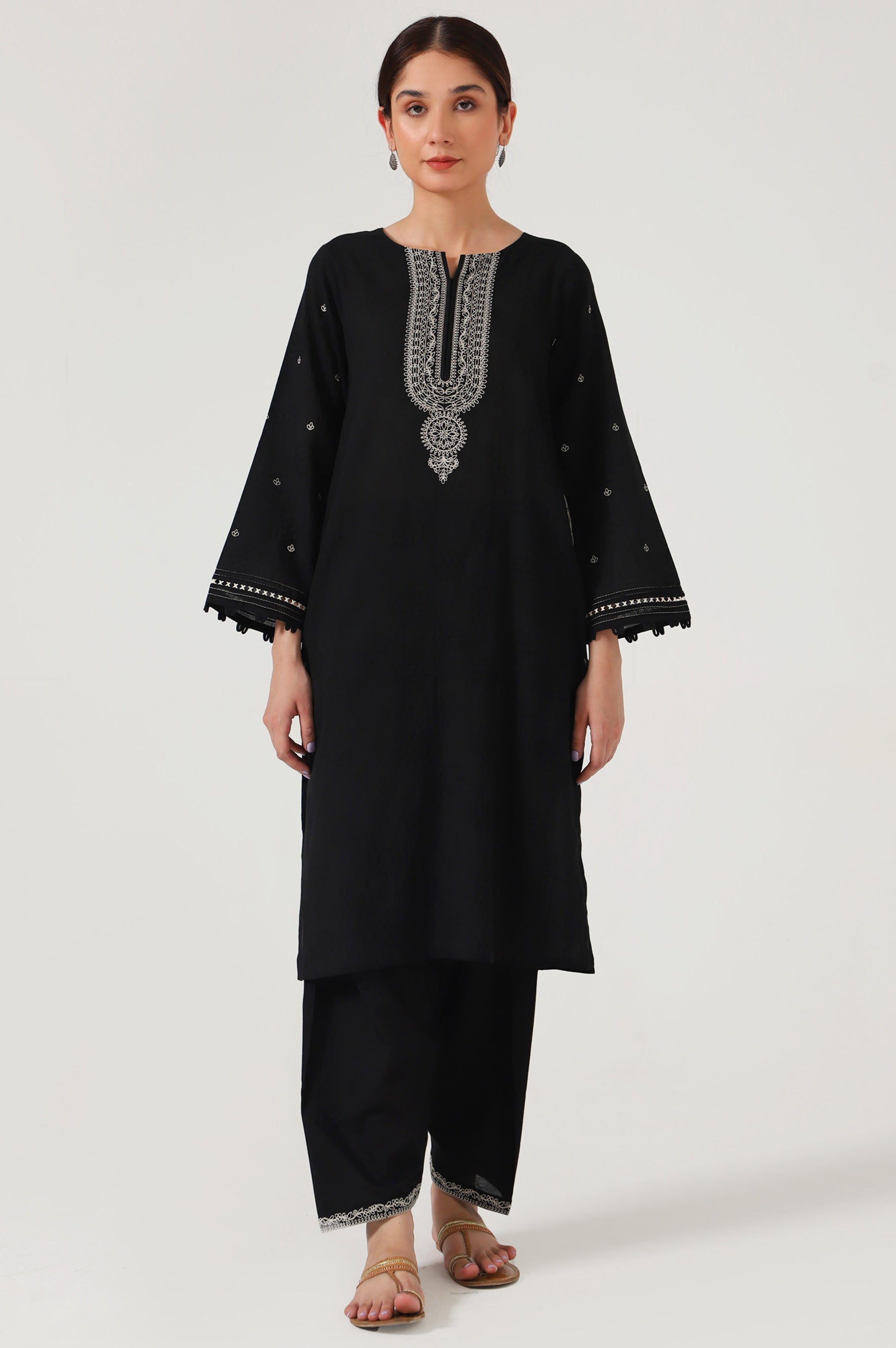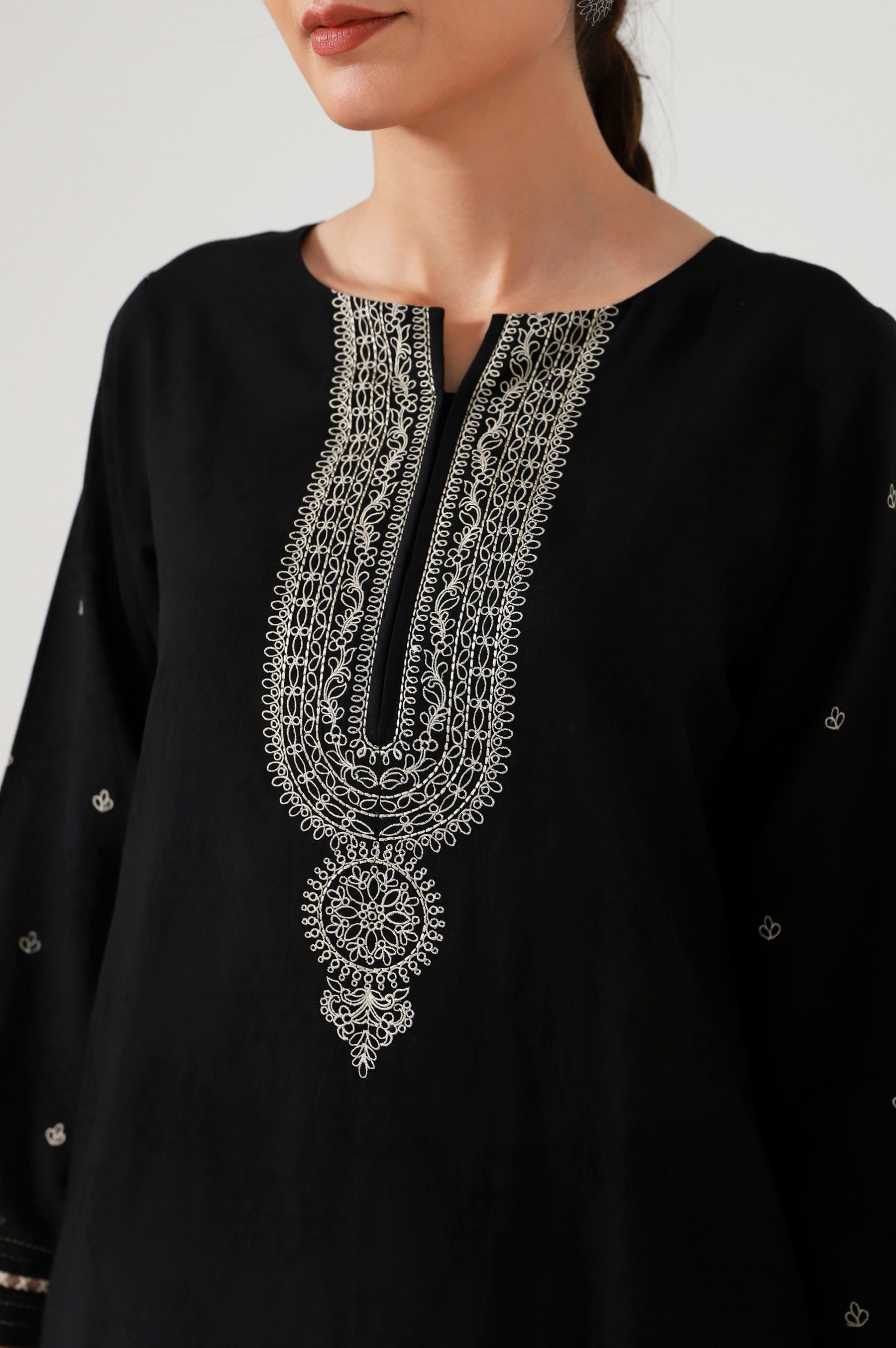 This easy breezy kurta crafted from cambric illustrated with dori looking embroidery on the neckline, pocket and narrow shalwar. This elegant kurta comes with a embroidery that can be wear at any casual meetings or event.