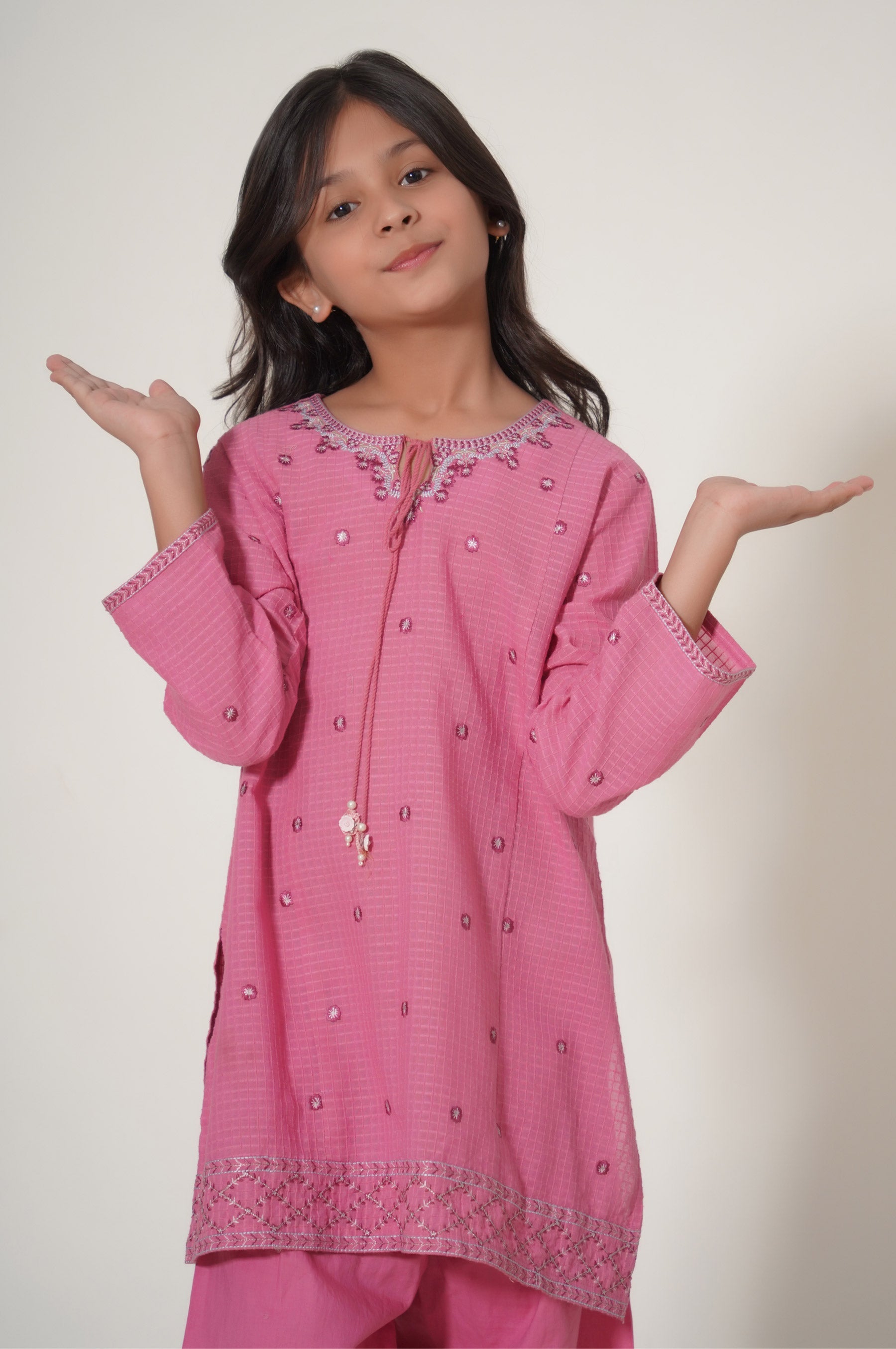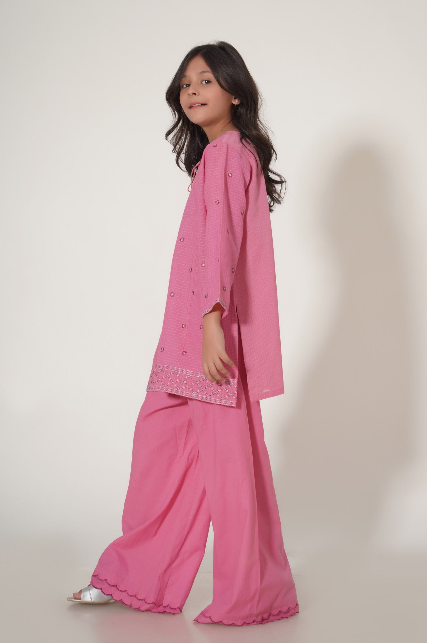 Revamp your little one's closet with this classy pink top, showcasing a playful floral patchwork in a lively pink hue and paired with trendy Dhaka-style pants.
