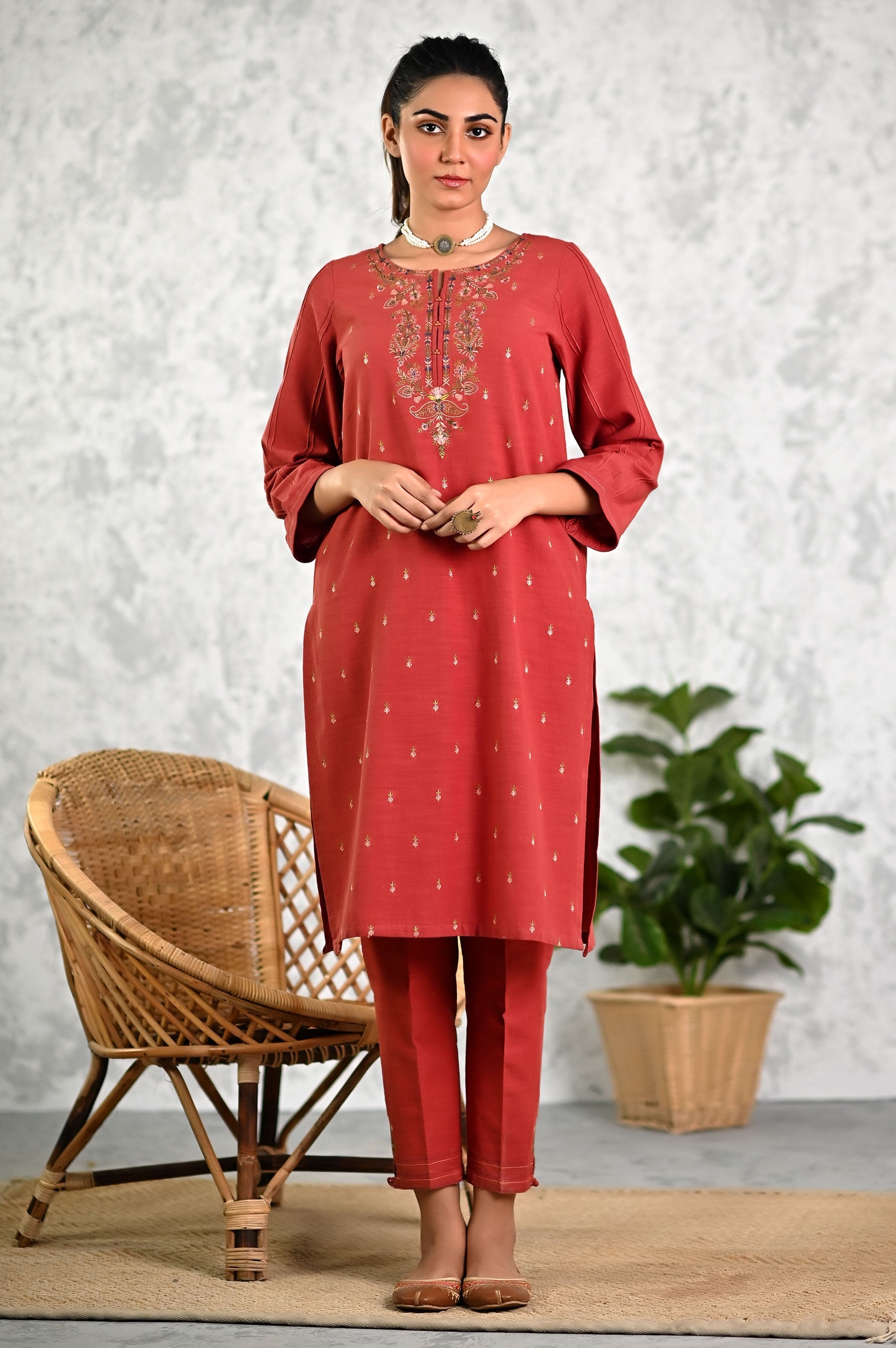 Get your hands on this timeless Rust khaddar co-ord which is adorned with traditional neckline and motifs spread all over front, sleeves stylized for balance. It is paired with khaddar straight pants which has a beautifully embroidered motif on hem.