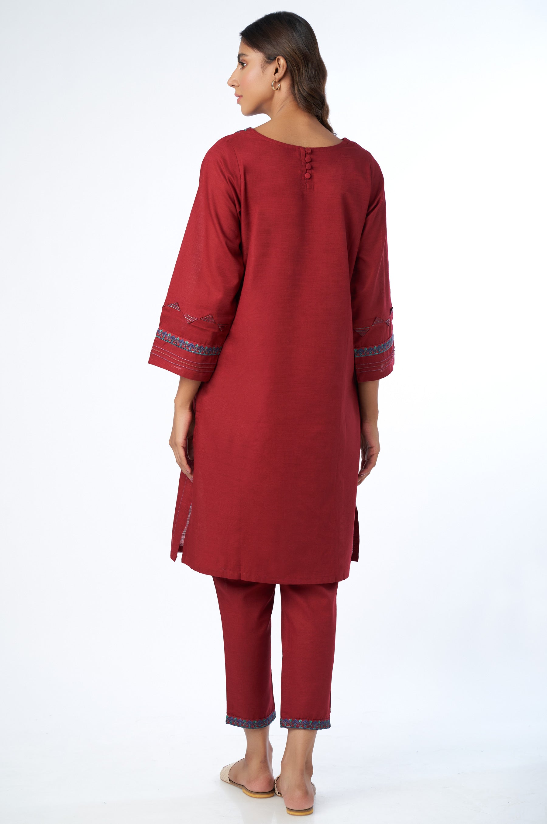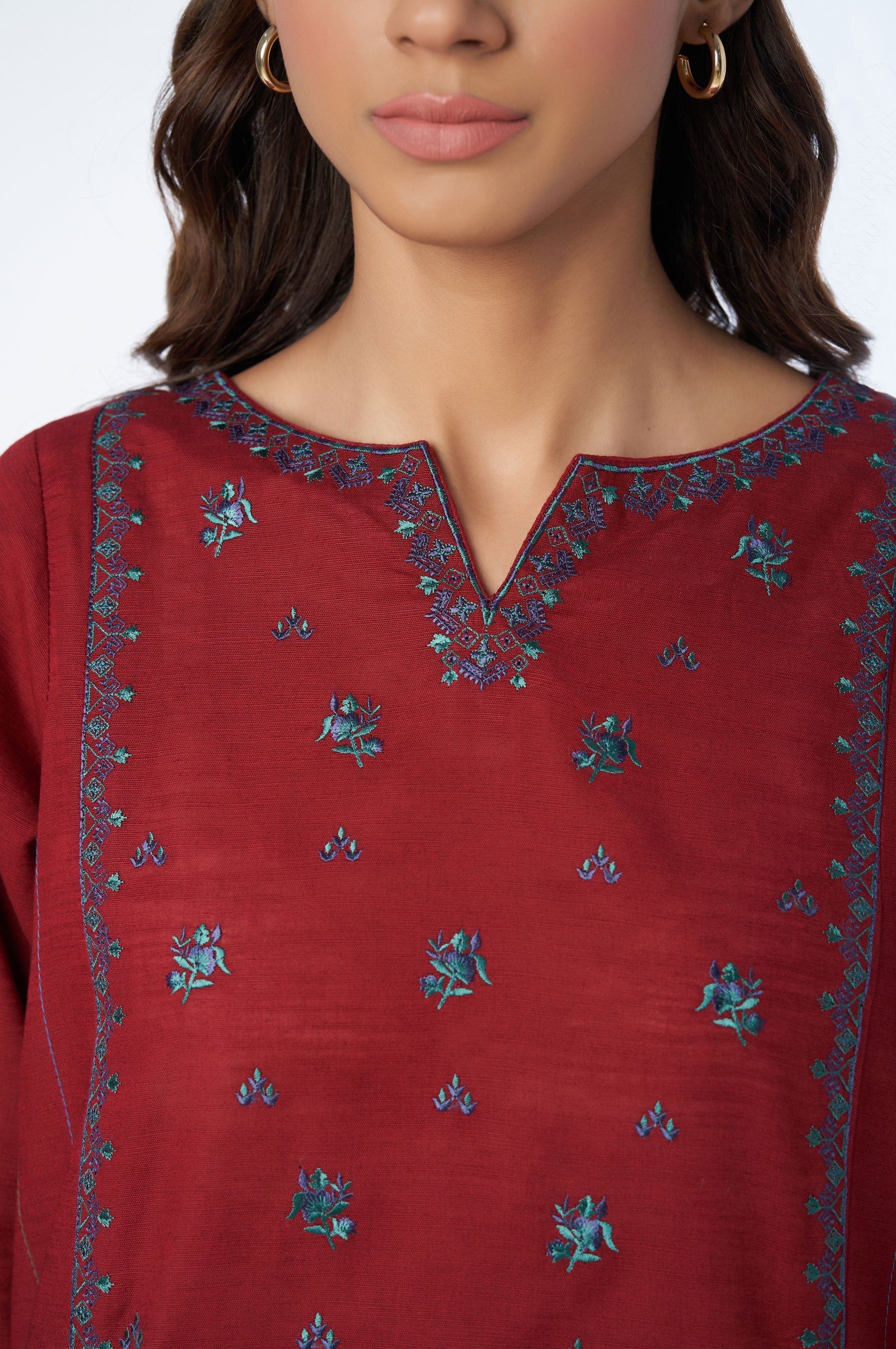 This regal shade of berry red khaddar co-ord set has intricate floral embroidery on shirt front, sleeve stitched in our signature style and the solid look of the outfit is a must have.