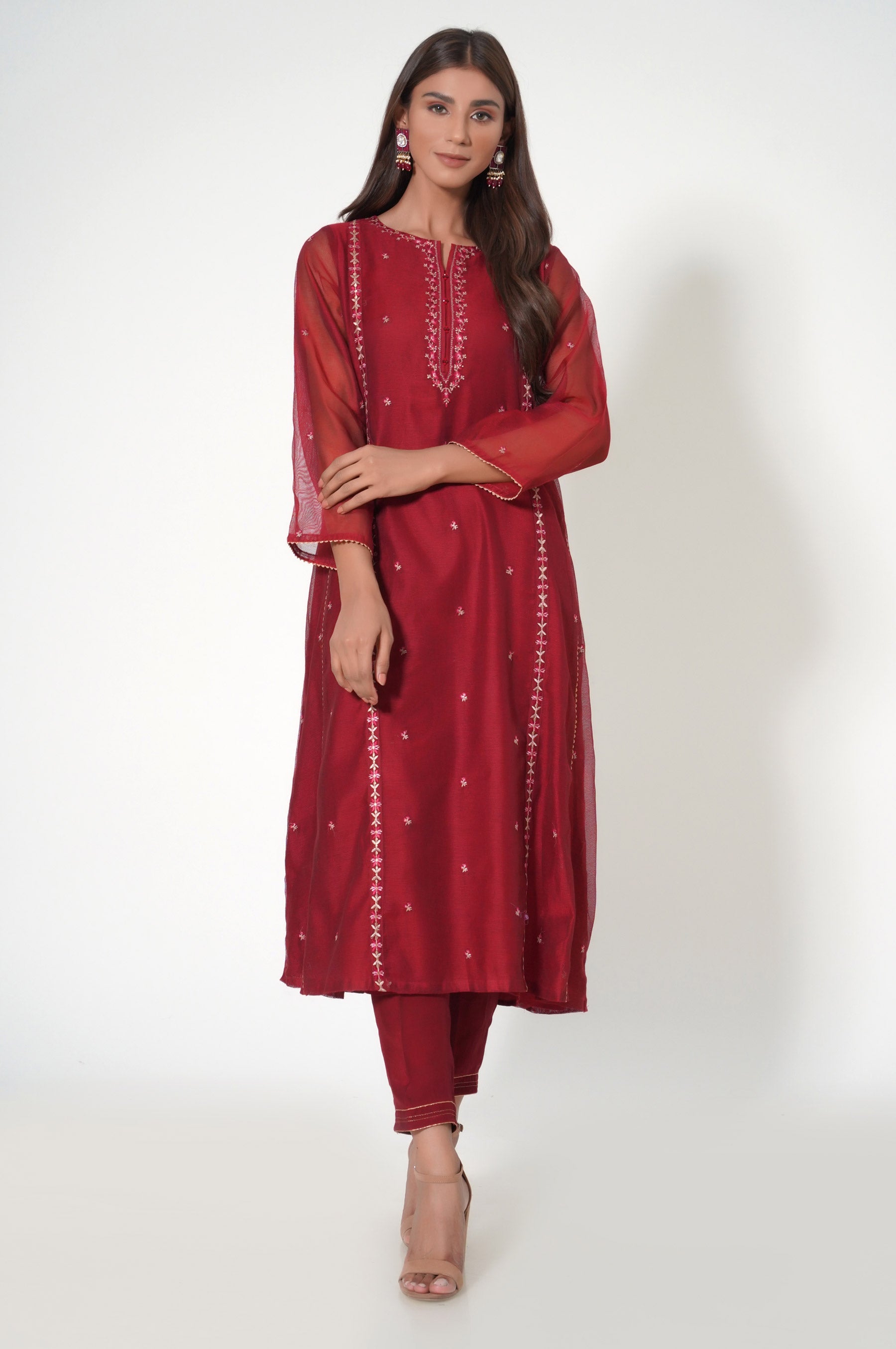 A classic composition is layered over this attractive red 2pcs ensemble, featuring a delicate embroideries on front and back inspired by french florals. Paired with a stylized bottom, this outfit is a style statement to embrace at intimate gatherings.
