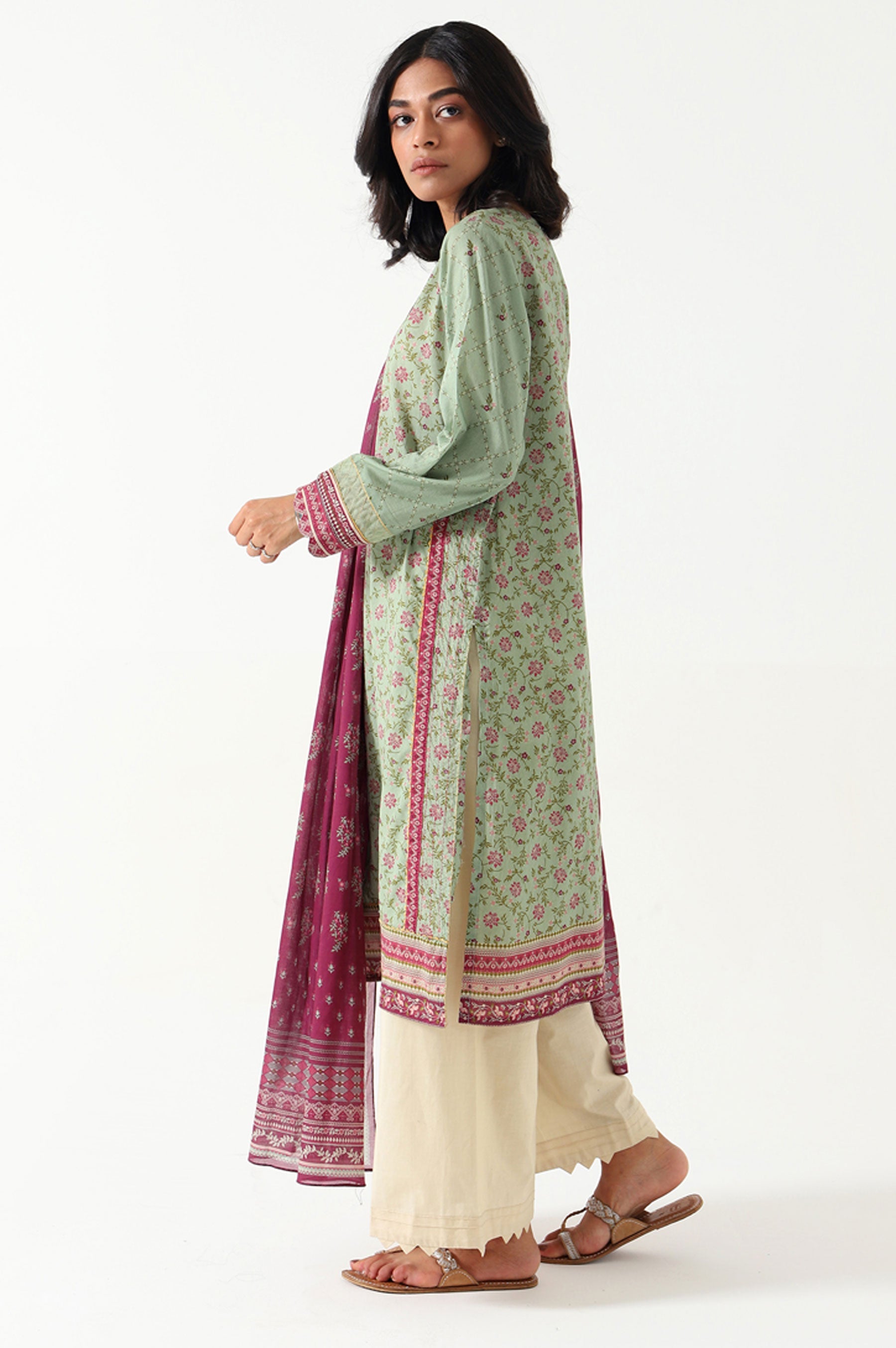 Printed Lawn Shirt with Embroidered Neckline, Printed Voile Slub Dupatta, Beads, Dori & Laces for Embellishment